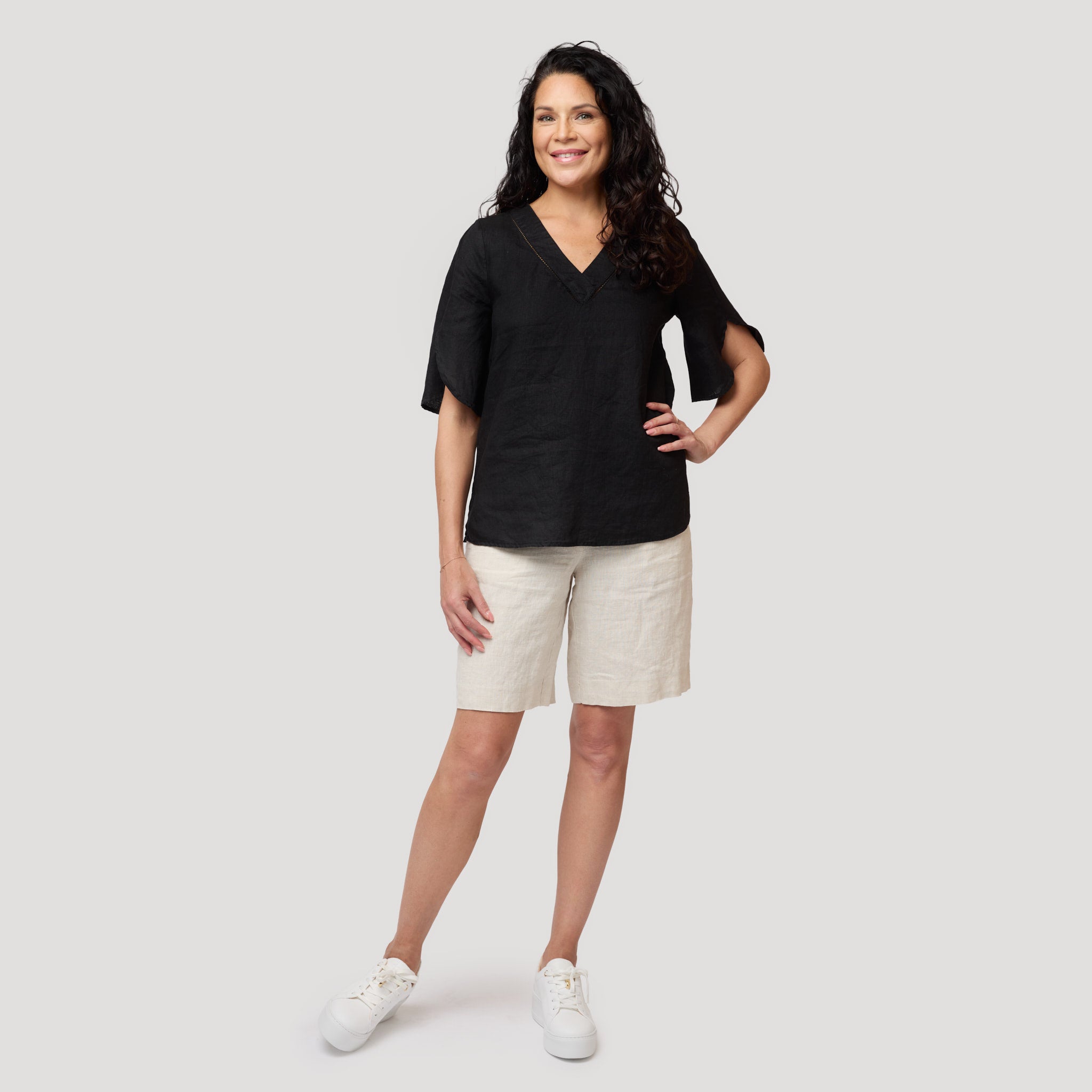 Kaunis avokauluksinen toppi mustien trikoo-housujen kanssa