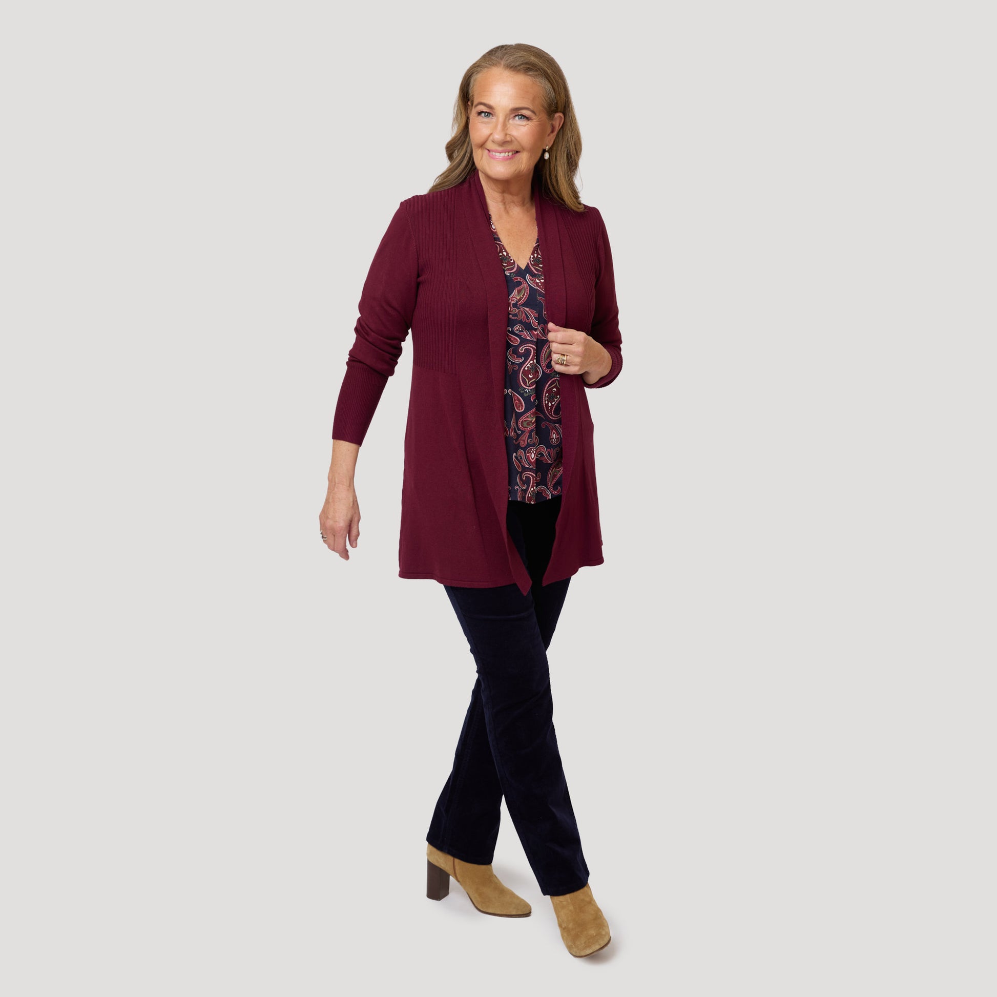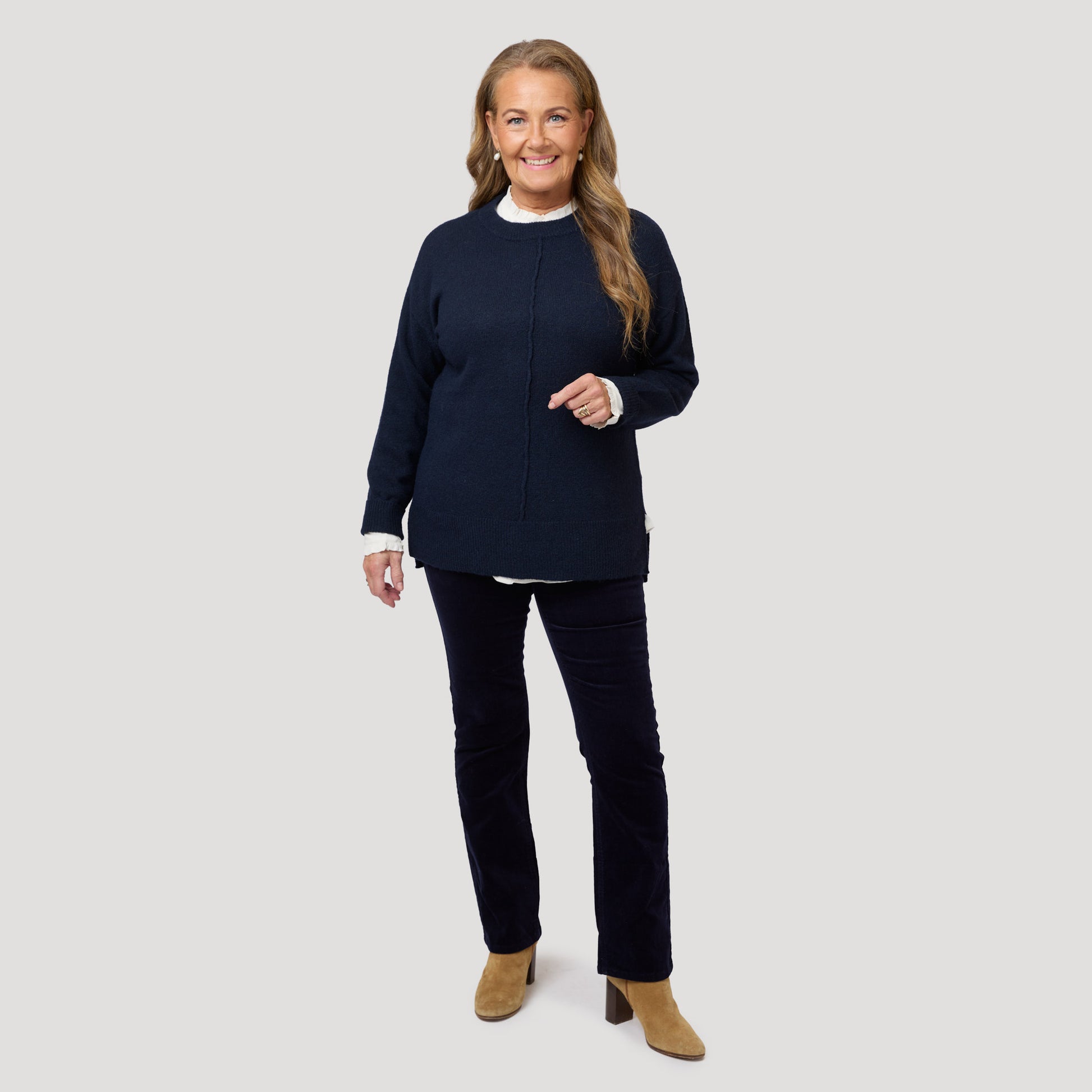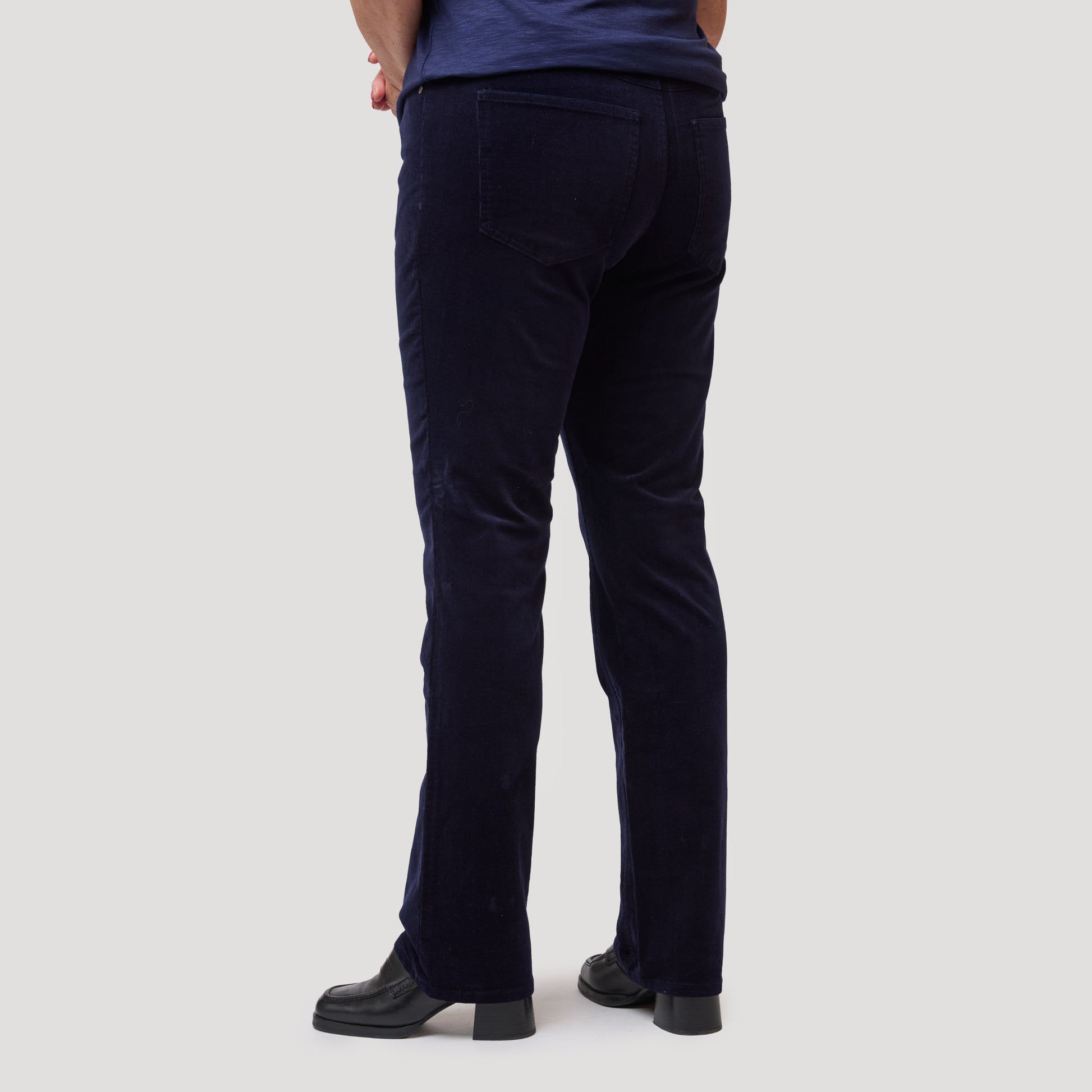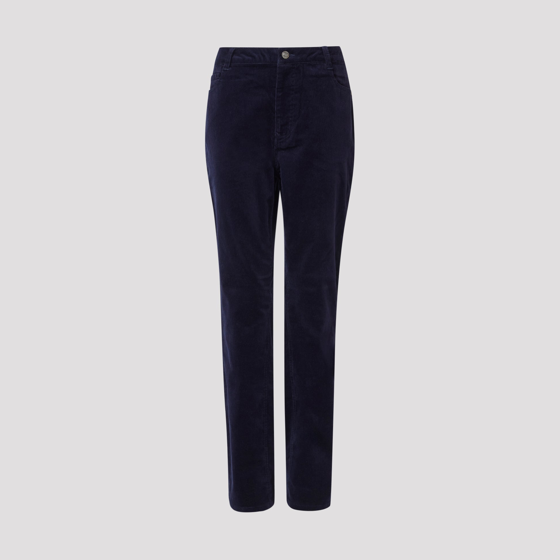 Klassisen viisitaskuisen mallin suorat korduroihousut. Tummansiniset joustavasta puuvillasta valmistetut korduroihousut, joissa on kapeat joustinneulokset, jotka antavat samettisen pinnan. Housujen malli on suosittu Alice-housumme, jota on saatavilla myös farkkuna ja värillisenä twillinä. Mallimme Yvonne on 170 cm pitkä ja käyttää kokoa 40 .