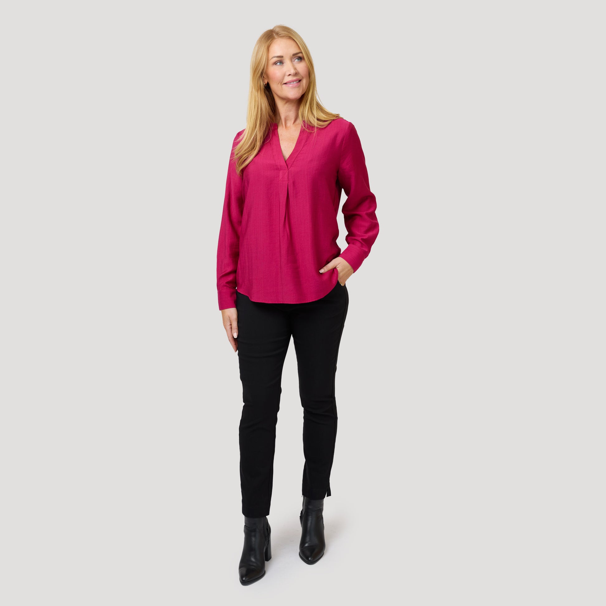 Kiiltävä tummanpinkki pusero savukehousuihin