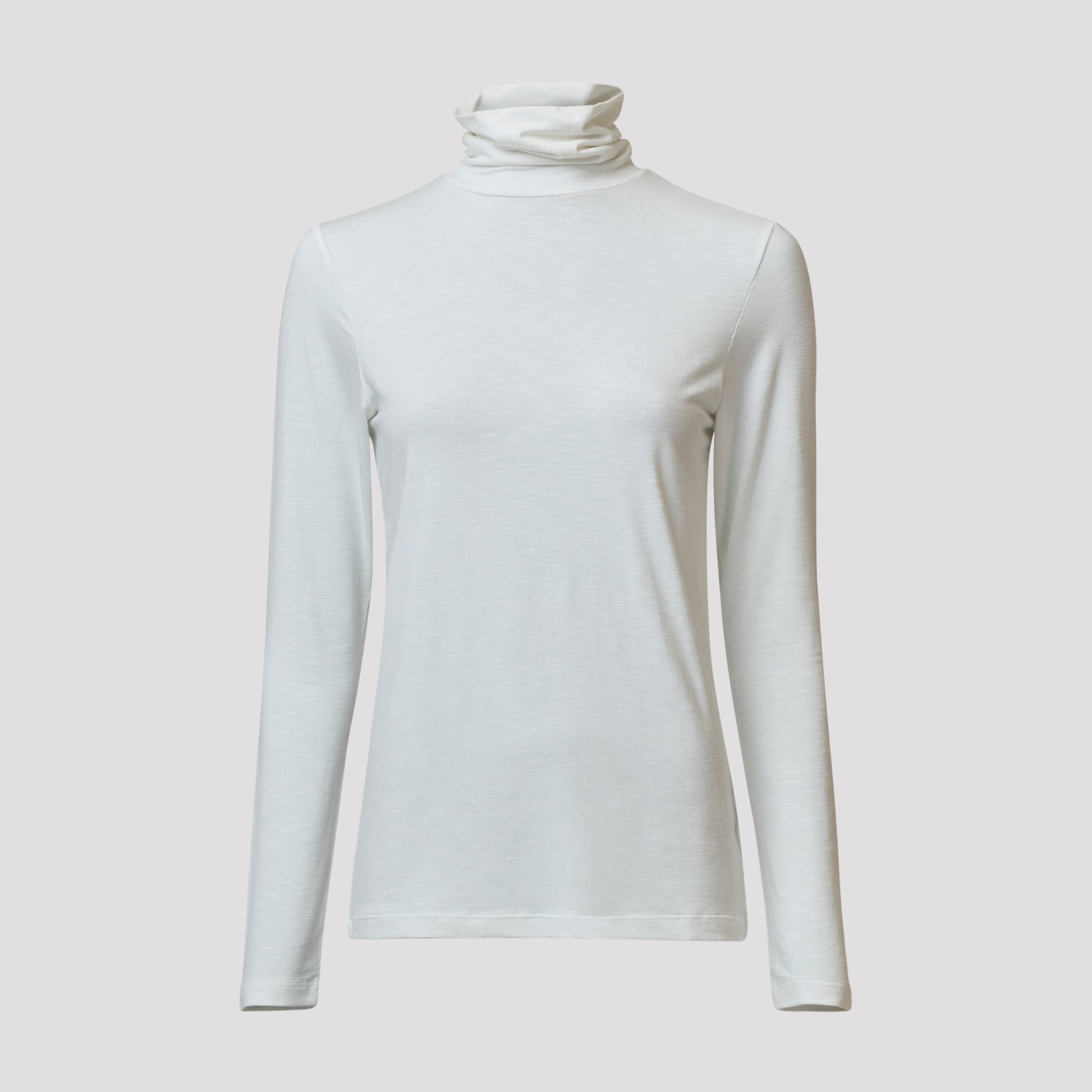 Vit, tunn polotröja i trikå med lång ärm. Offwhite tröja i viskos med lite struktur i tyget. Dessa toppar är i samma material som våra populära Jolie toppar. Vår modell Marianne är 170 cm och har storlek S på sig.