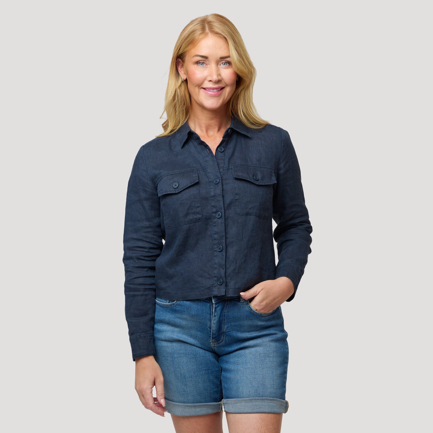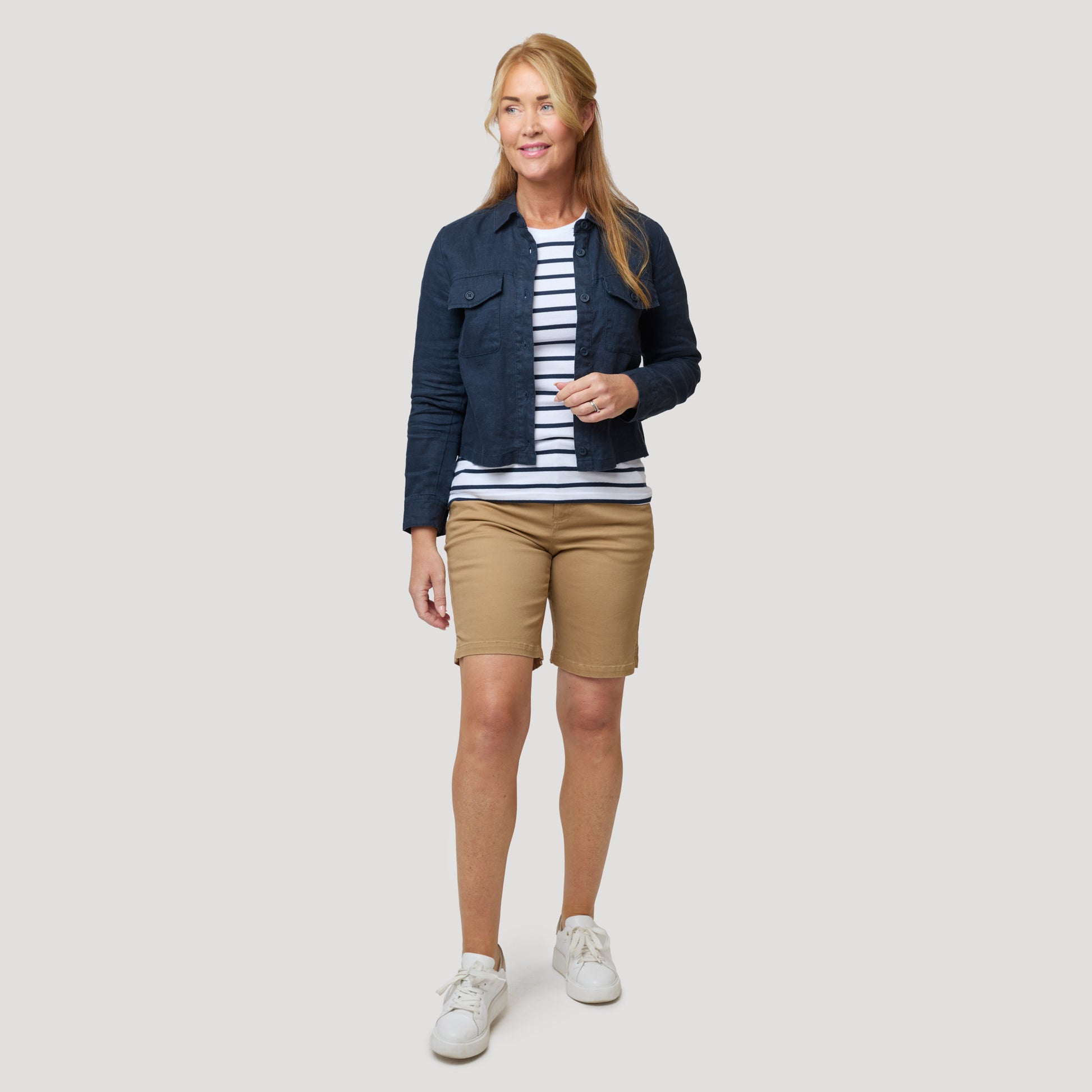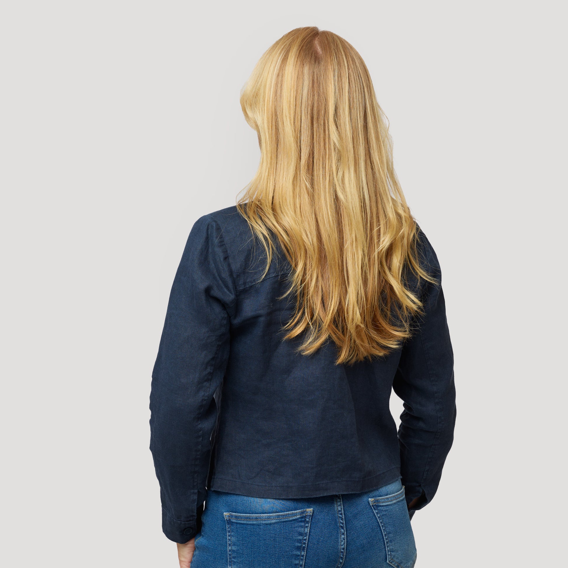 Tummansininen lyhyt pellavatakki 100 % pellavaa, joka sopii täydellisesti lämpimiin päiviin. Boksimallinen takki, jossa napilliset rintataskut. Ohuessa vuoramattomassa takissa on kaulus sekä halkio ja nappi hihansuissa. Takki toimii yhtä hyvin kuin kevättakki sisätakkina. Pellava on viileä ja kestävä luonnonmateriaali, joka kuivuu nopeasti ja rypistyy helposti. Silitä takki sen ollessa kostea, jotta se on pehmeämpi. Mallimme Marianne on 170 cm pitkä ja käyttää kokoa S.