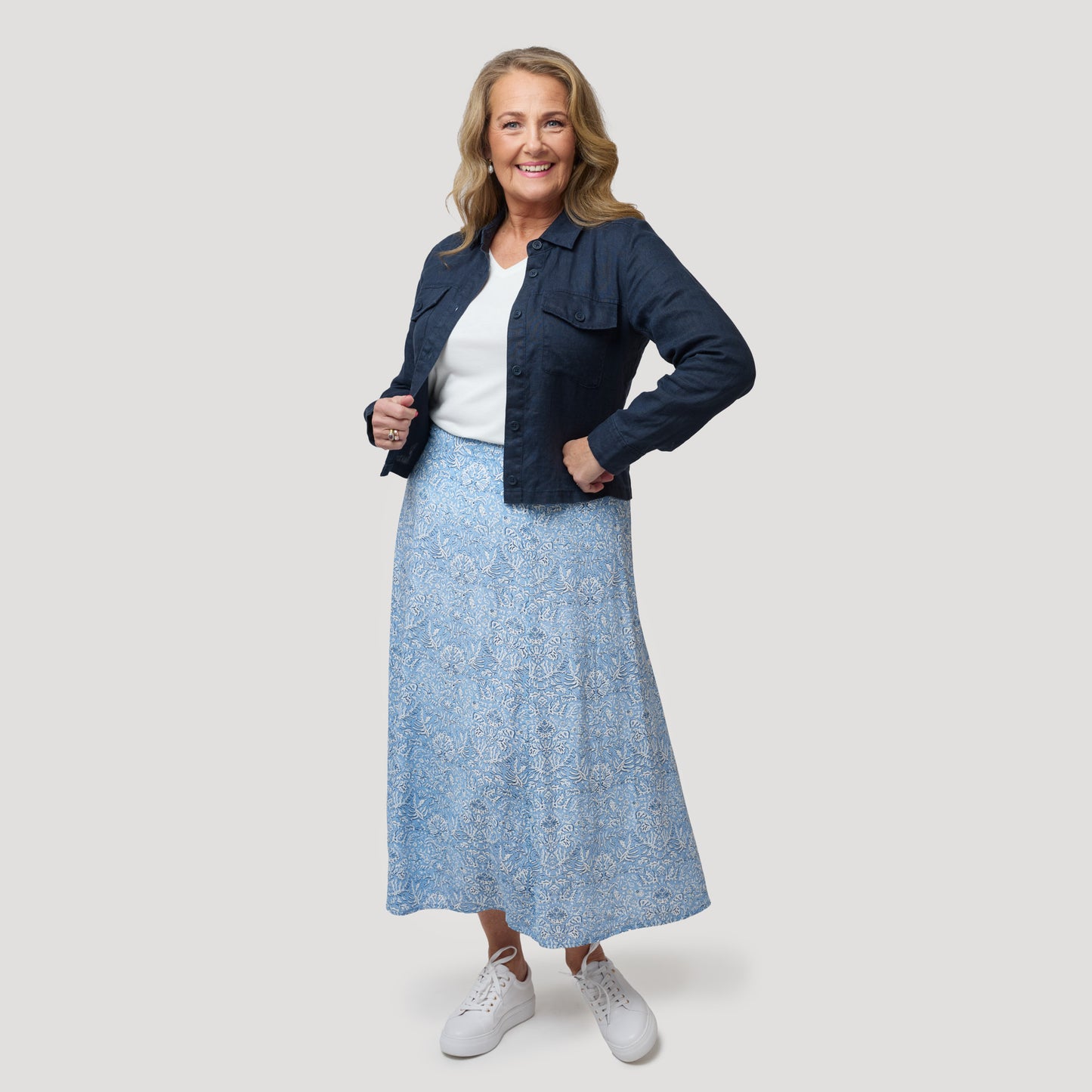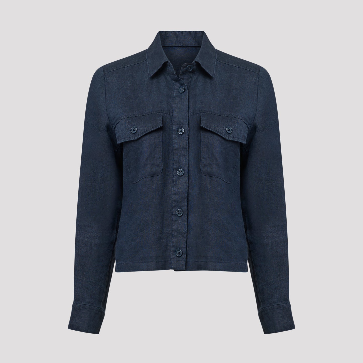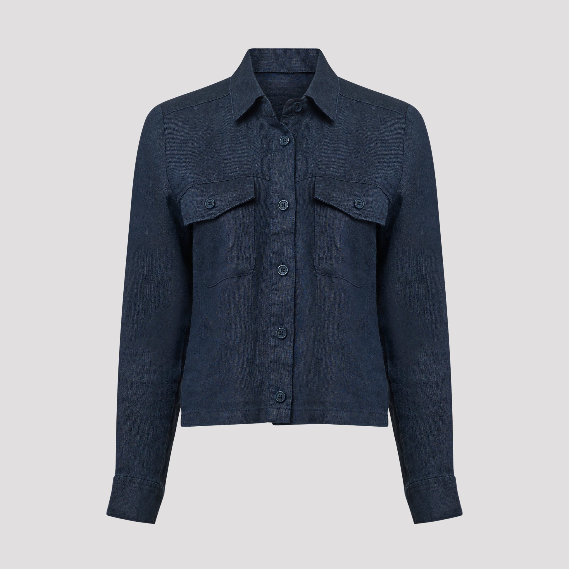 Tummansininen lyhyt pellavatakki 100 % pellavaa, joka sopii täydellisesti lämpimiin päiviin. Boksimallinen takki, jossa napilliset rintataskut. Ohuessa vuoramattomassa takissa on kaulus sekä halkio ja nappi hihansuissa. Takki toimii yhtä hyvin kuin kevättakki sisätakkina. Pellava on viileä ja kestävä luonnonmateriaali, joka kuivuu nopeasti ja rypistyy helposti. Silitä takki sen ollessa kostea, jotta se on pehmeämpi. Mallimme Marianne on 170 cm pitkä ja käyttää kokoa S.