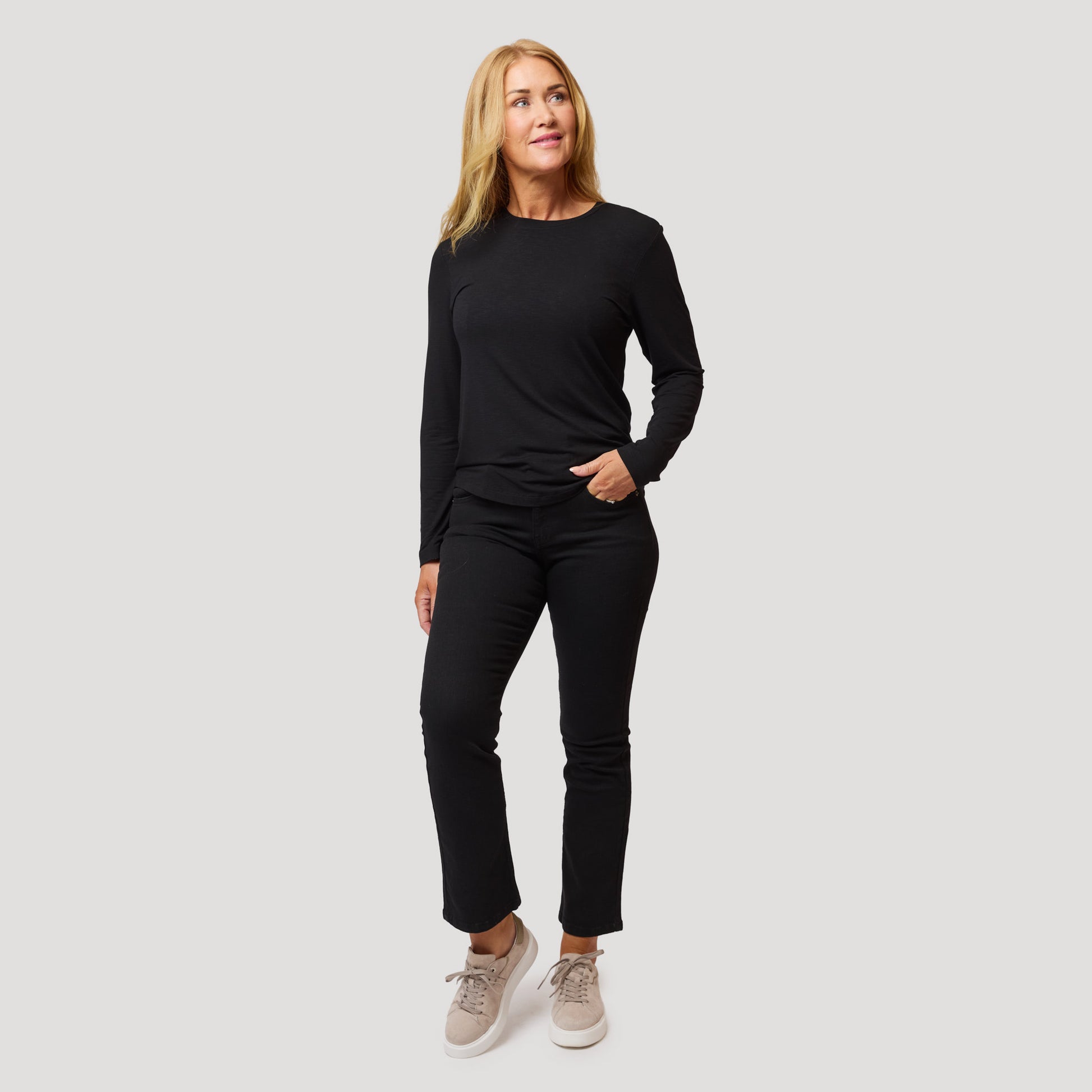 Tyylikkäät mustat farkut, joissa normaali vyötärö ja kick flare-lahkeet. Joustavissa strechfarkuissa on levenevät lahkeet ja taskut edessä ja takana. Rosebudin farkut. Mallimme Yasmine on 163 cm pitkä ja käyttää kokoa 38.