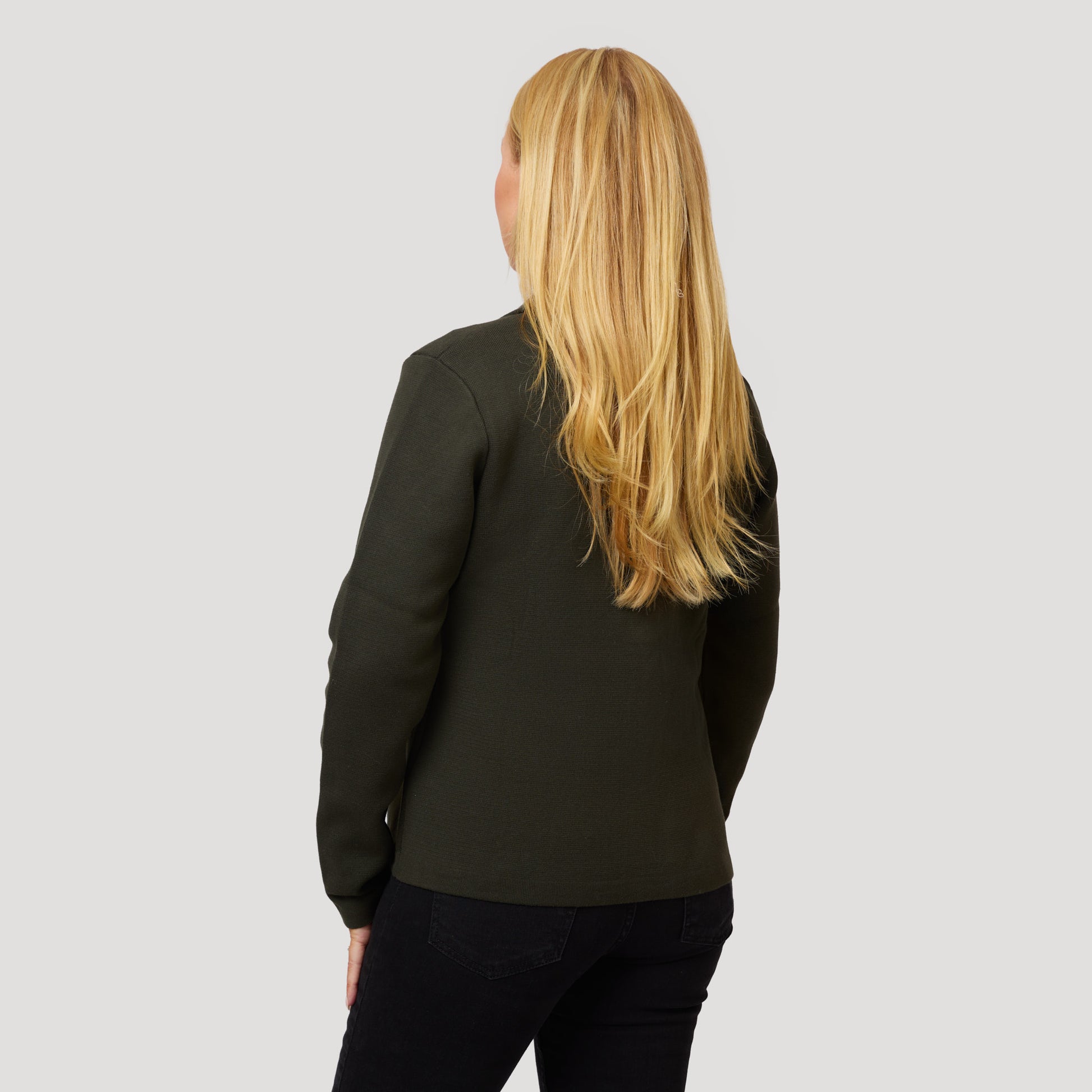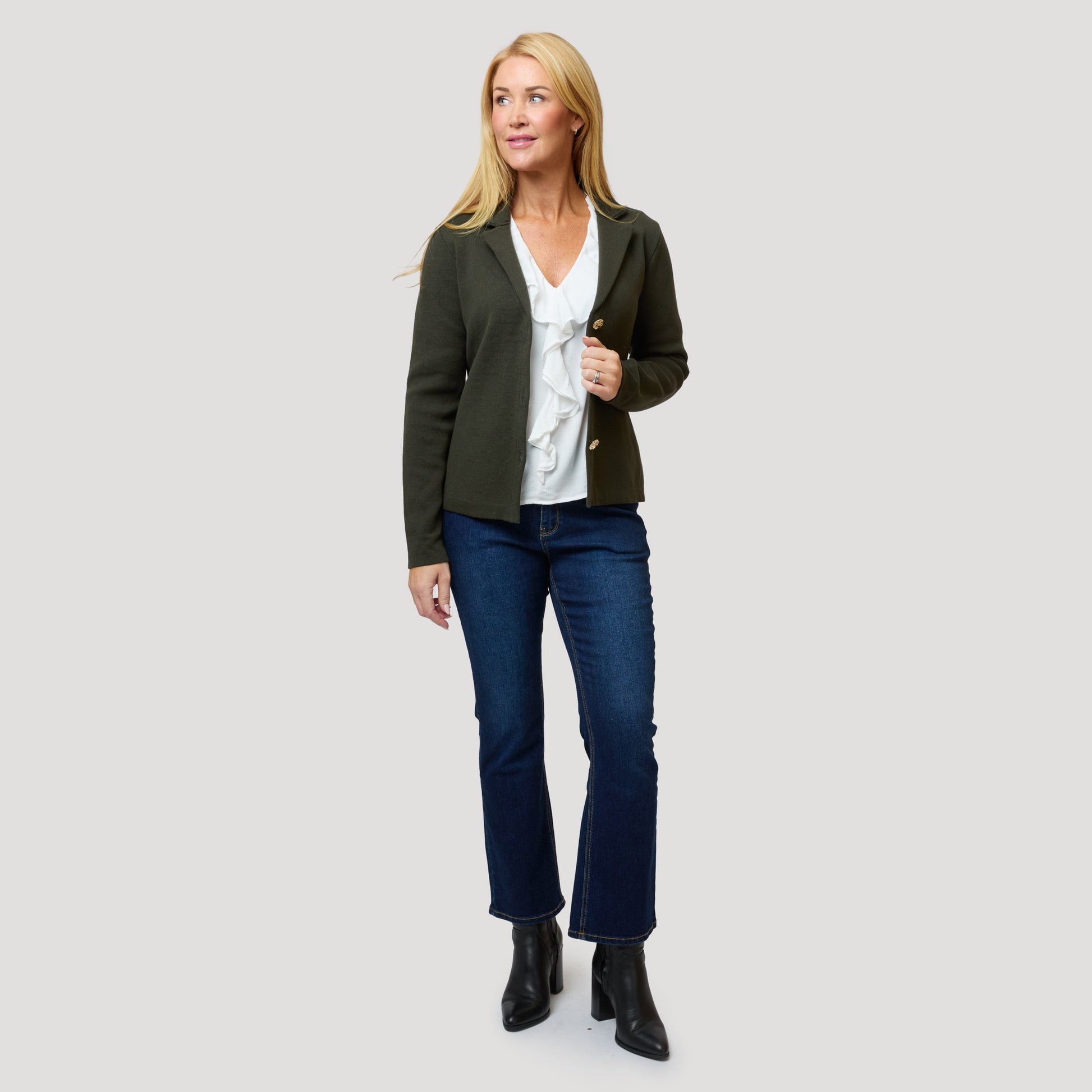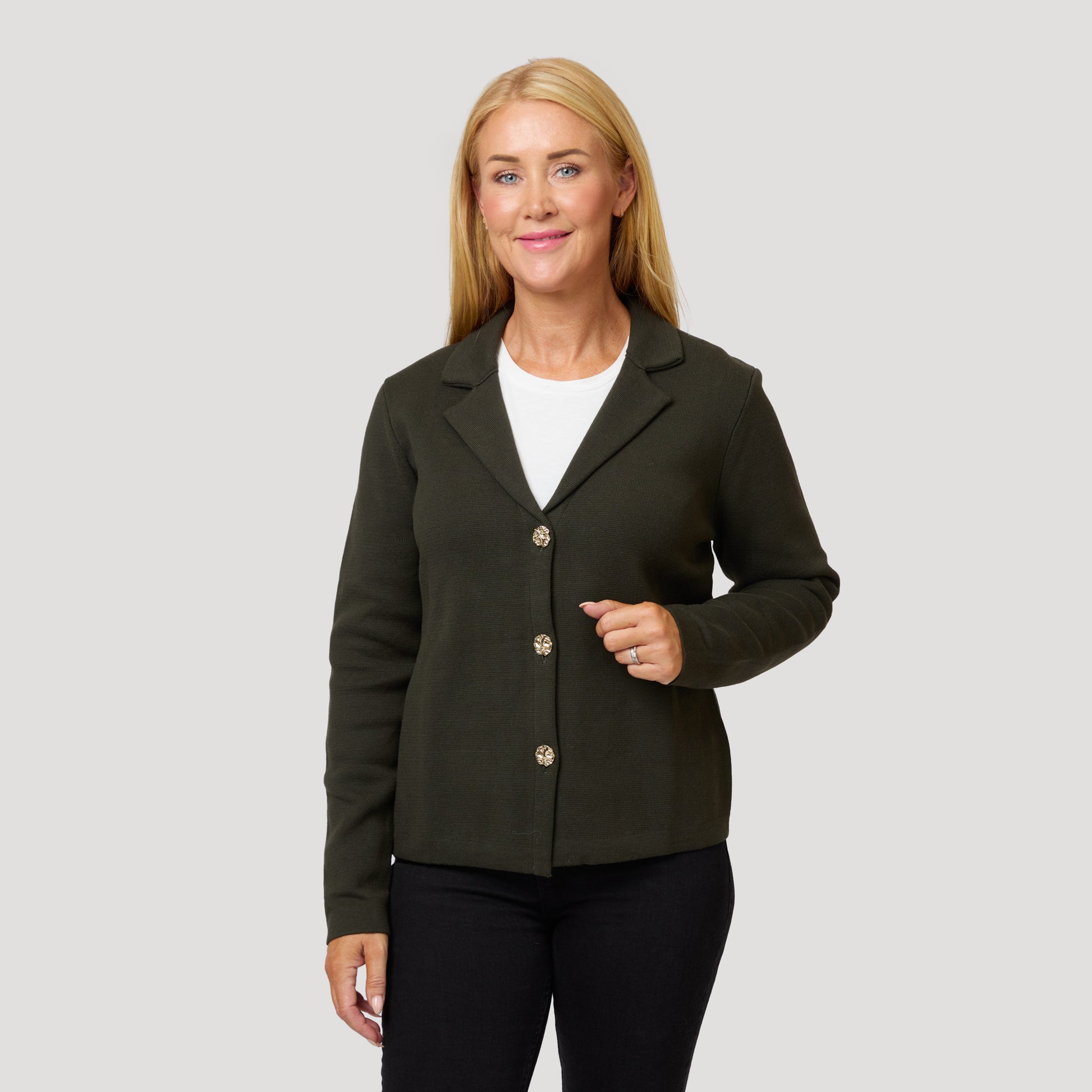 Tummanvihreä puuvillaneuletakki, jossa hienot, epäsäännöllisen muotoiset kultaiset napit. Vihreä neulottu bleiseri kauluksella ja kauluskäänteillä. Takki on tiukasti neulottu 100 % puuvillasta. Mallimme Marianne on 170 cm pitkä ja käyttää kokoa S.