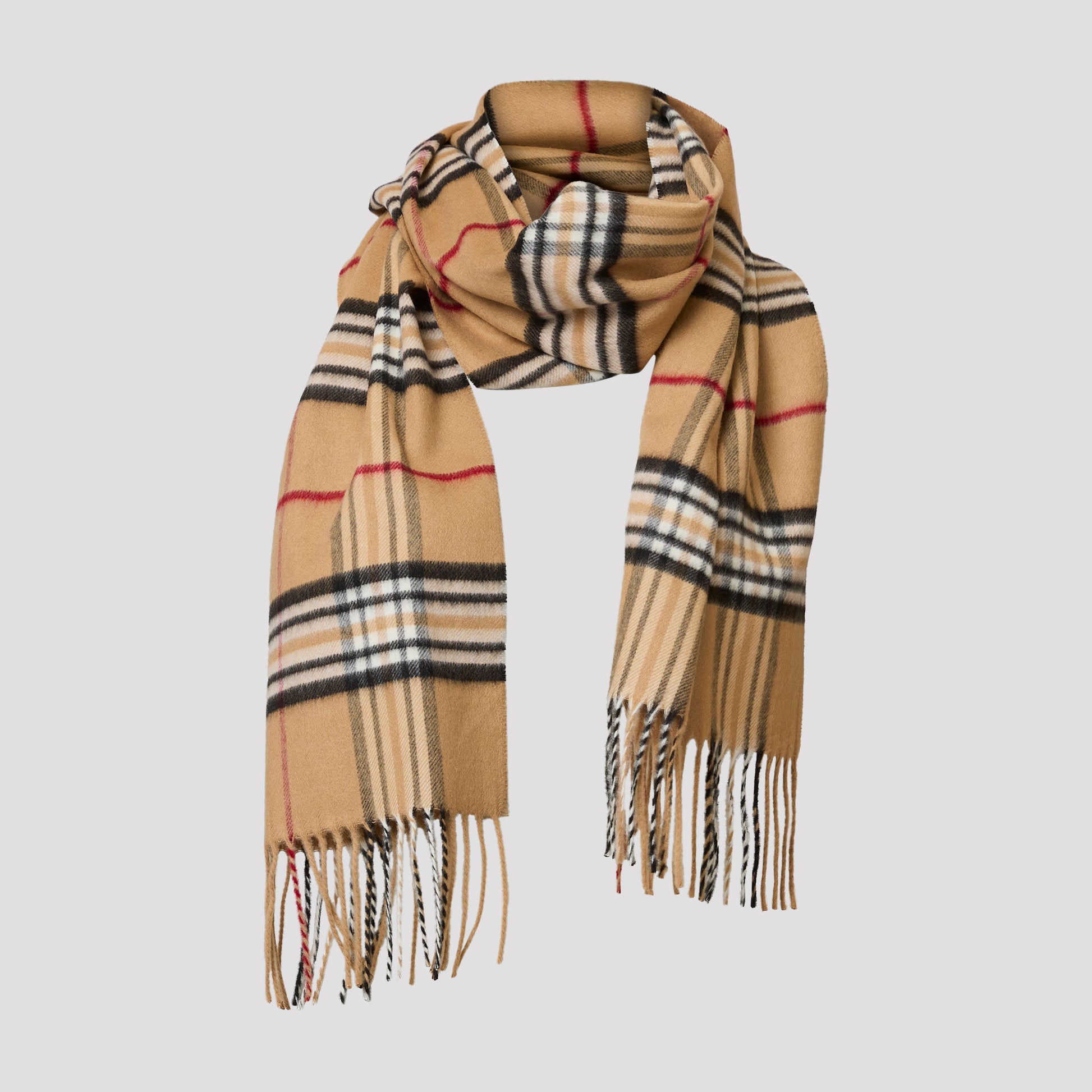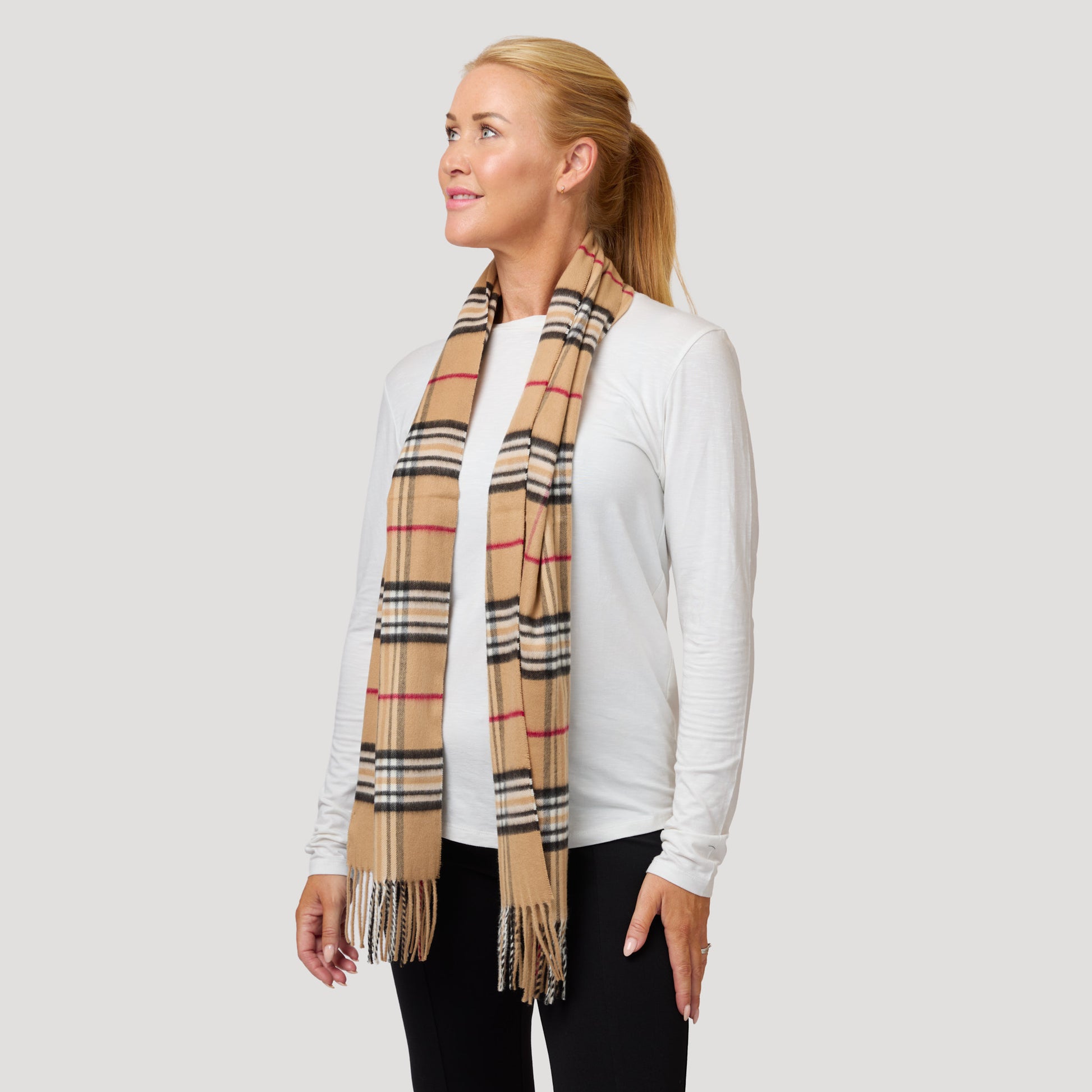 Klassinen ruudullinen huivi beigellä pohjalla, jossa mustaa ja punaista. Pehmeä huivi on lämmin mutta ohut.