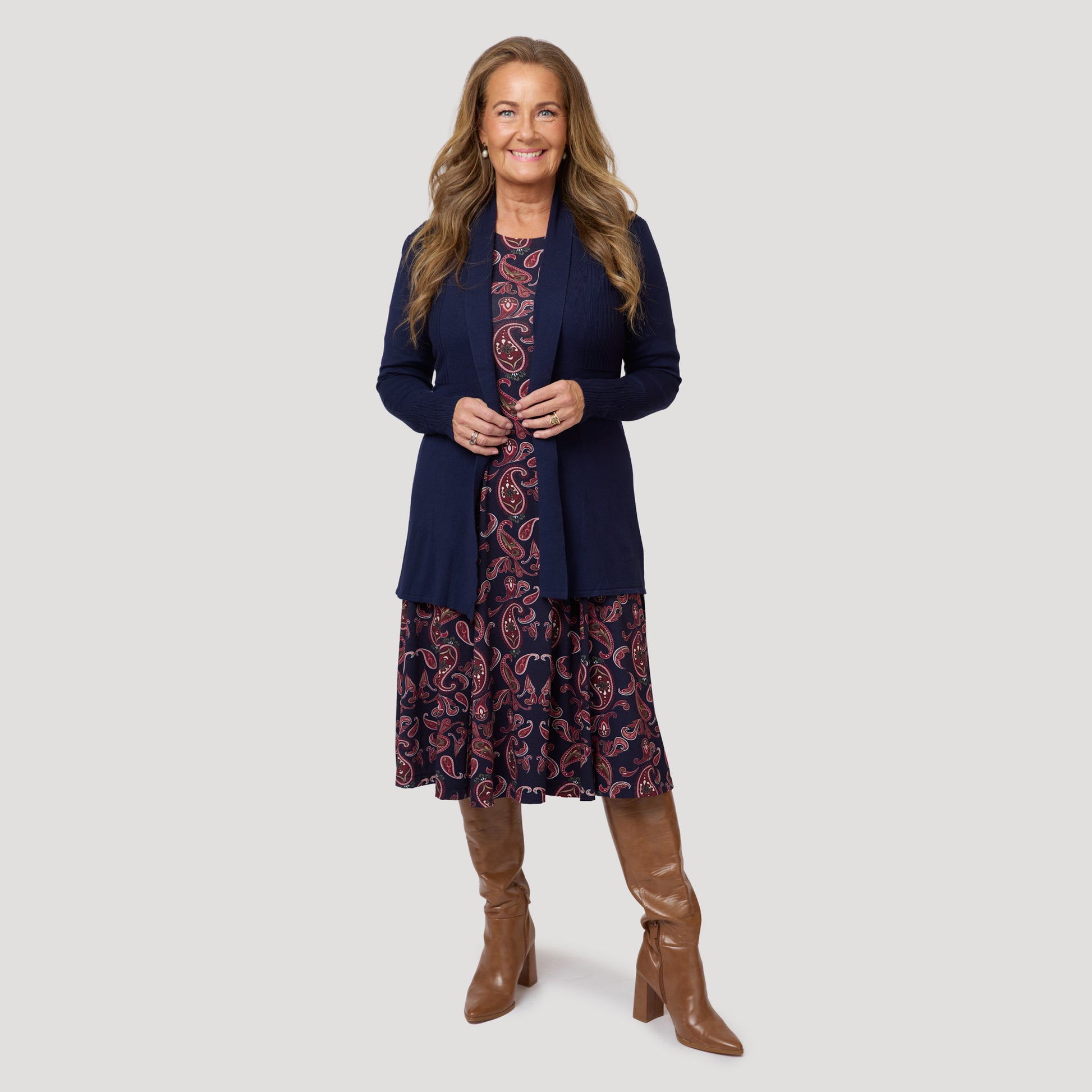 Kaunis viskoosijerseymekko, jossa on kaunis paisley-kuvio ja tummansininen helma . Mekossa on muotoillut saumat edessä ja takana, mikä takaa erittäin imartelevan istuvuuden. Kuviollinen mekko, jossa on pidemmät t-paitahihat, pieni pöyhimä yläosassa ja halkio takana. Mallimme Yvonne on 170 cm pitkä ja käyttää kokoa M.