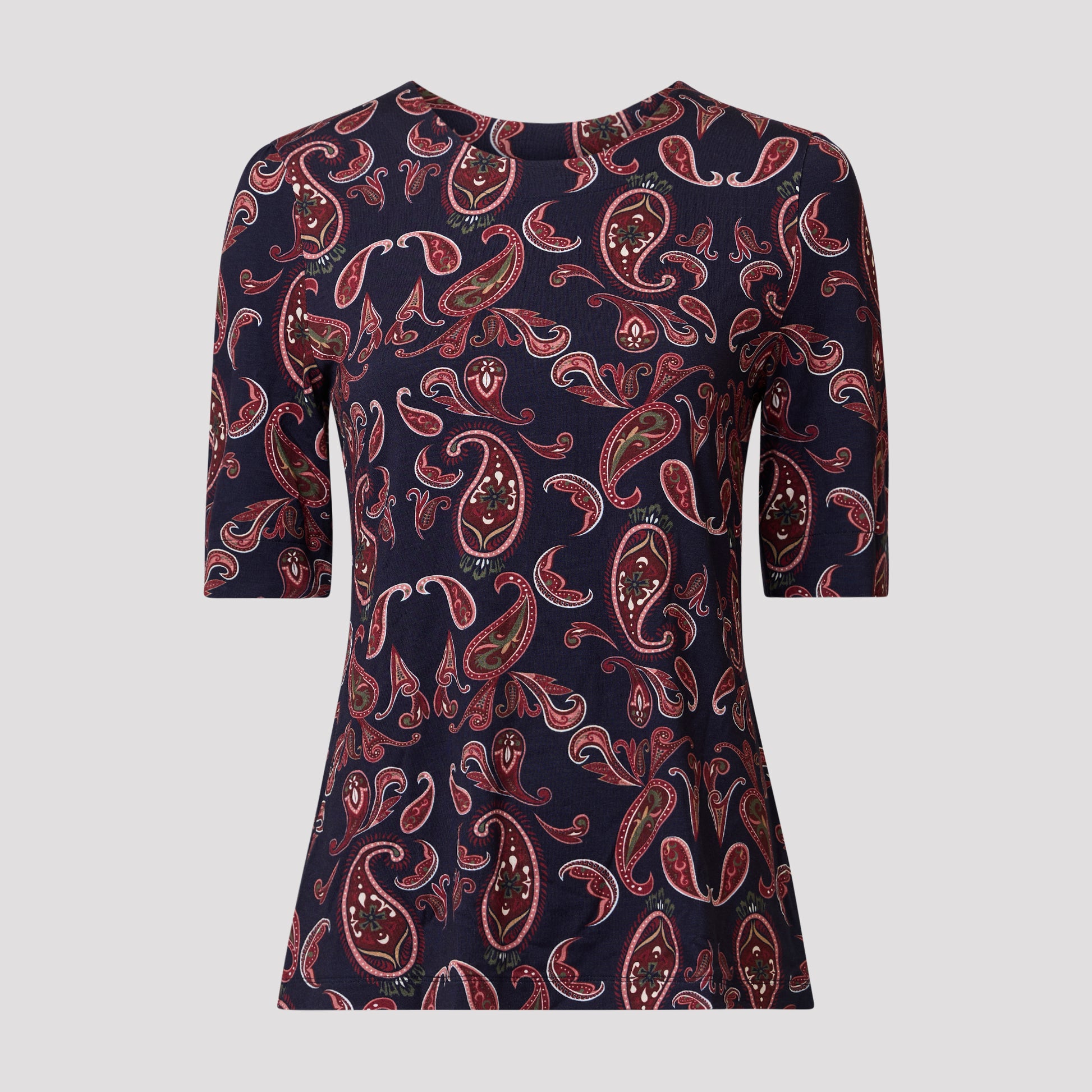Mukava viskoosipaita, jossa on kaunis paisley-kuvio ja tummansininen helma . Kuviollinen jerseytoppi, jossa pyöreä pääntie ja leveämpi pääntie . Yläosassa on pidemmät t-paitahihat, joissa on pieni puhvi yläosassa ja halkio takana. Mallimme Marianne on 170 cm pitkä ja käyttää kokoa S.