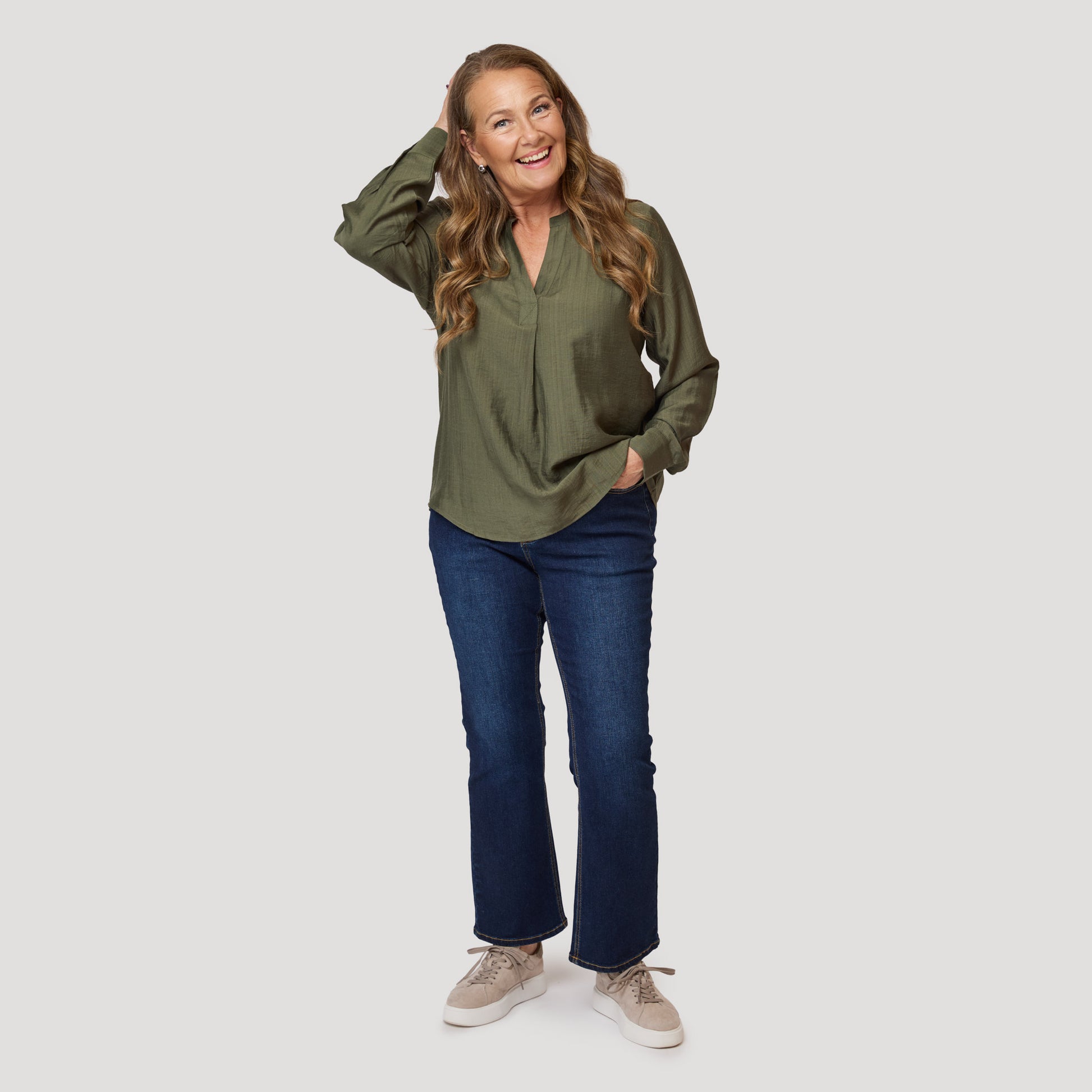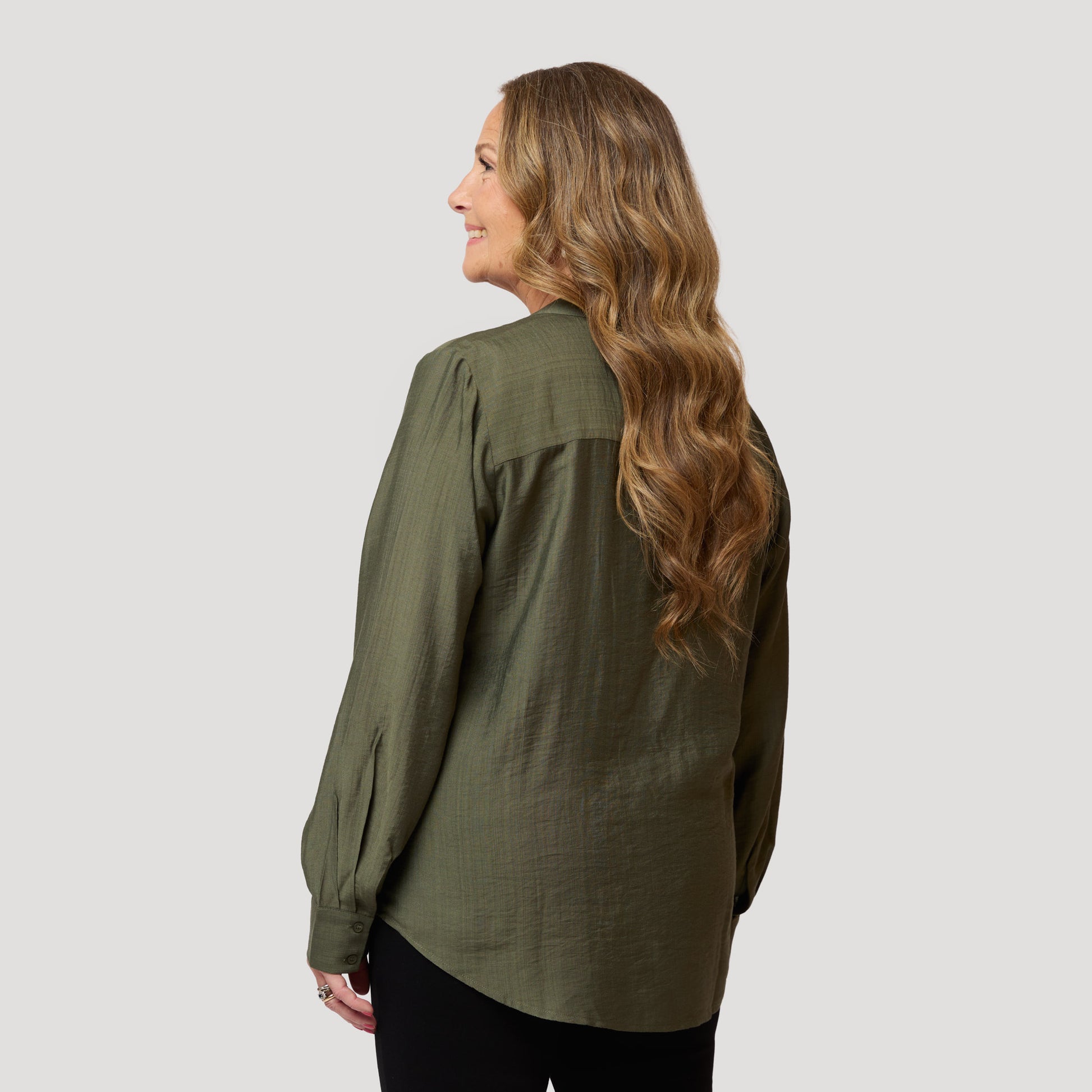 Vihreä pusero viskoosisekoitteesta, jossa hieman kiiltoa. Tyylikäs pusero, jossa on laskokset edessä, hihansuissa ja halkio hihassa sekä kauniisti pyöristetty, takaa hieman pidempi helma. Mallimme Yvonne on 170 cm pitkä ja käyttää kokoa M.
