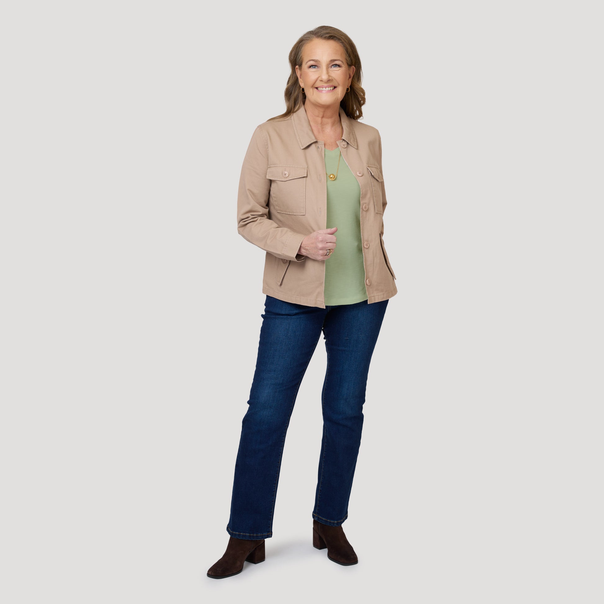 Vaaleanvihreä toppi beigen takin alle