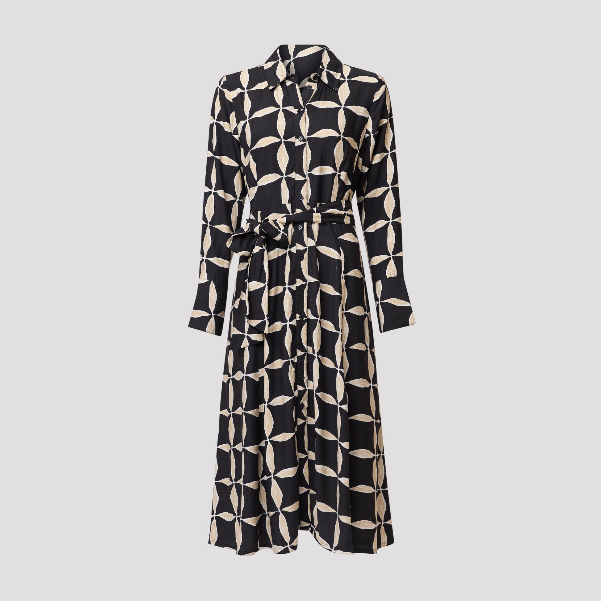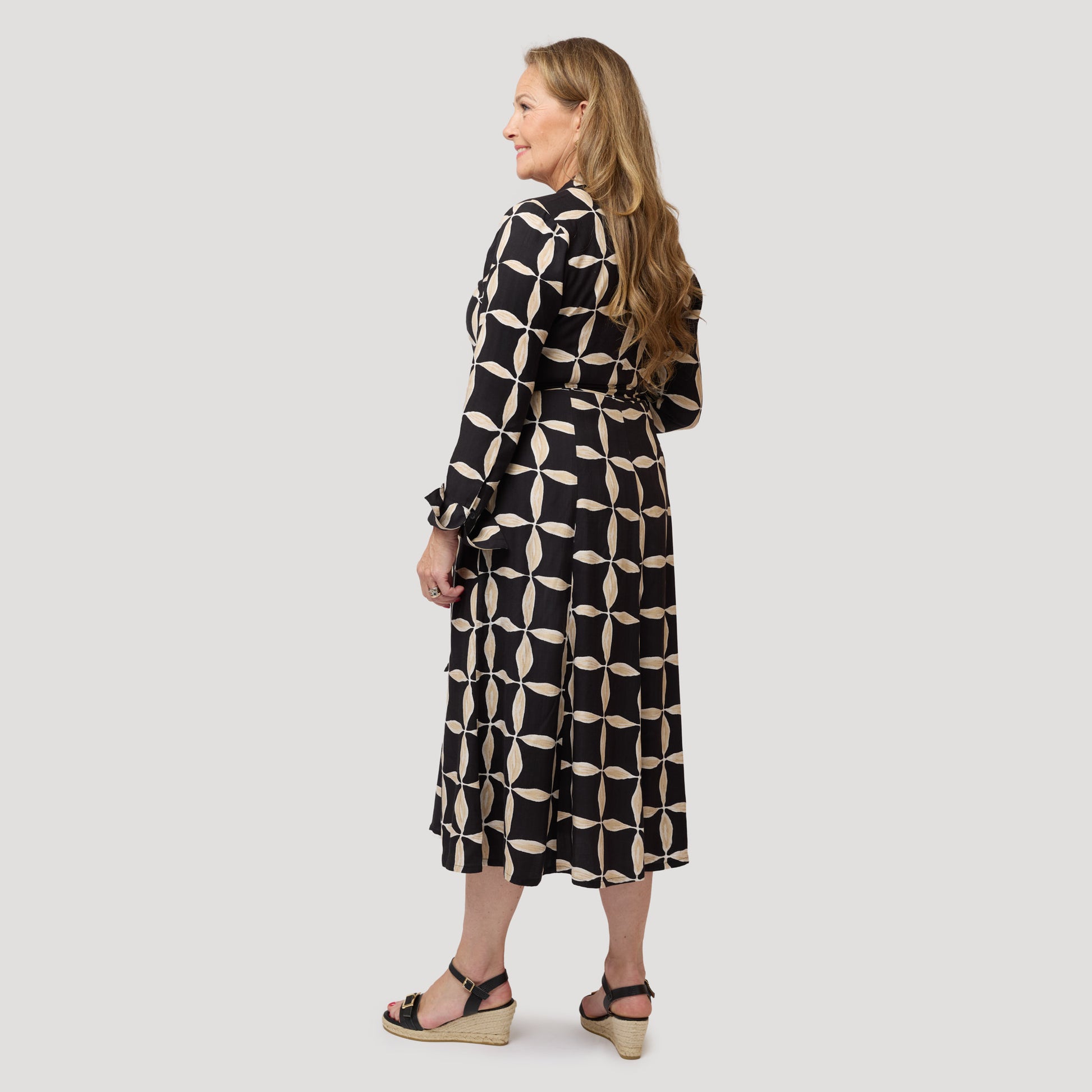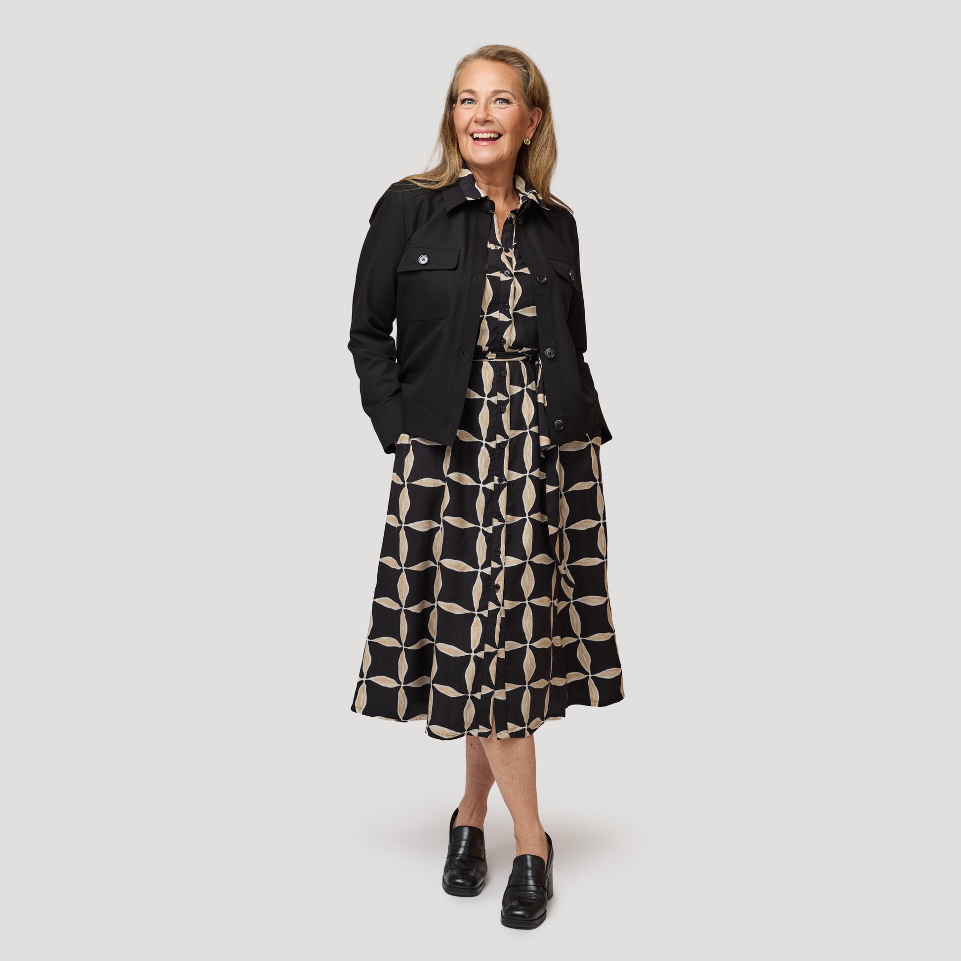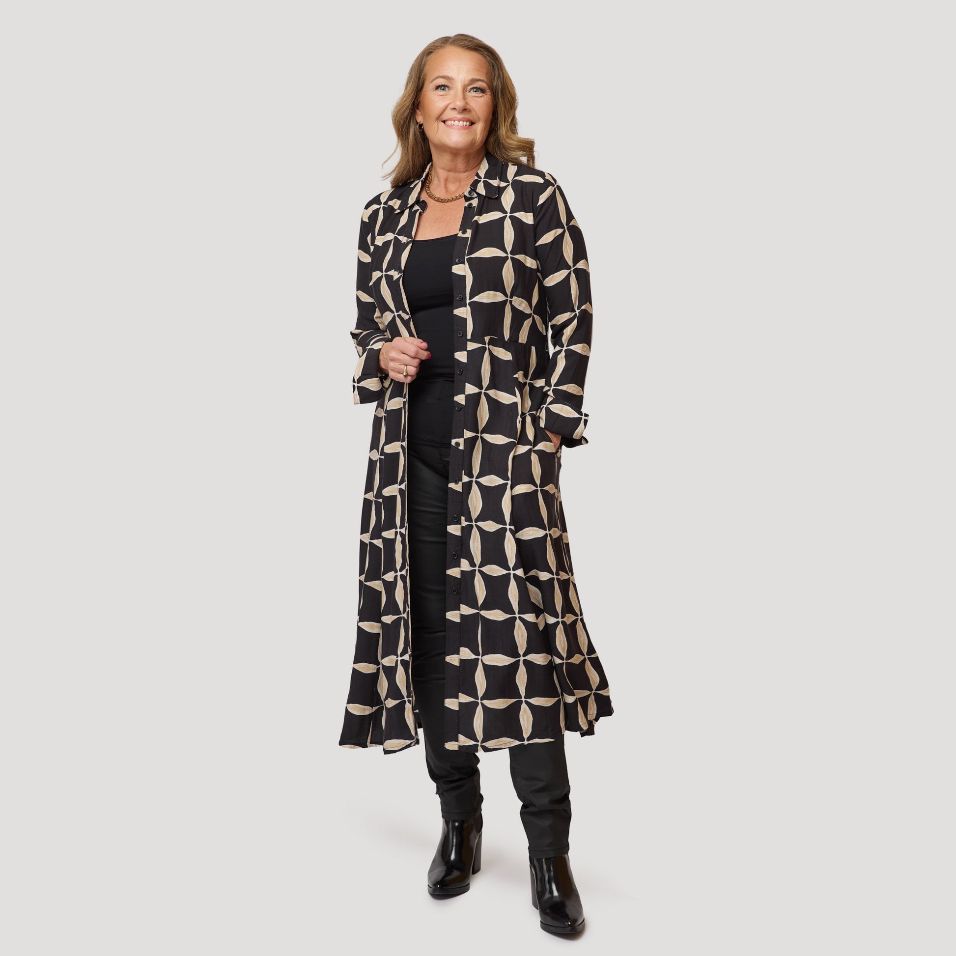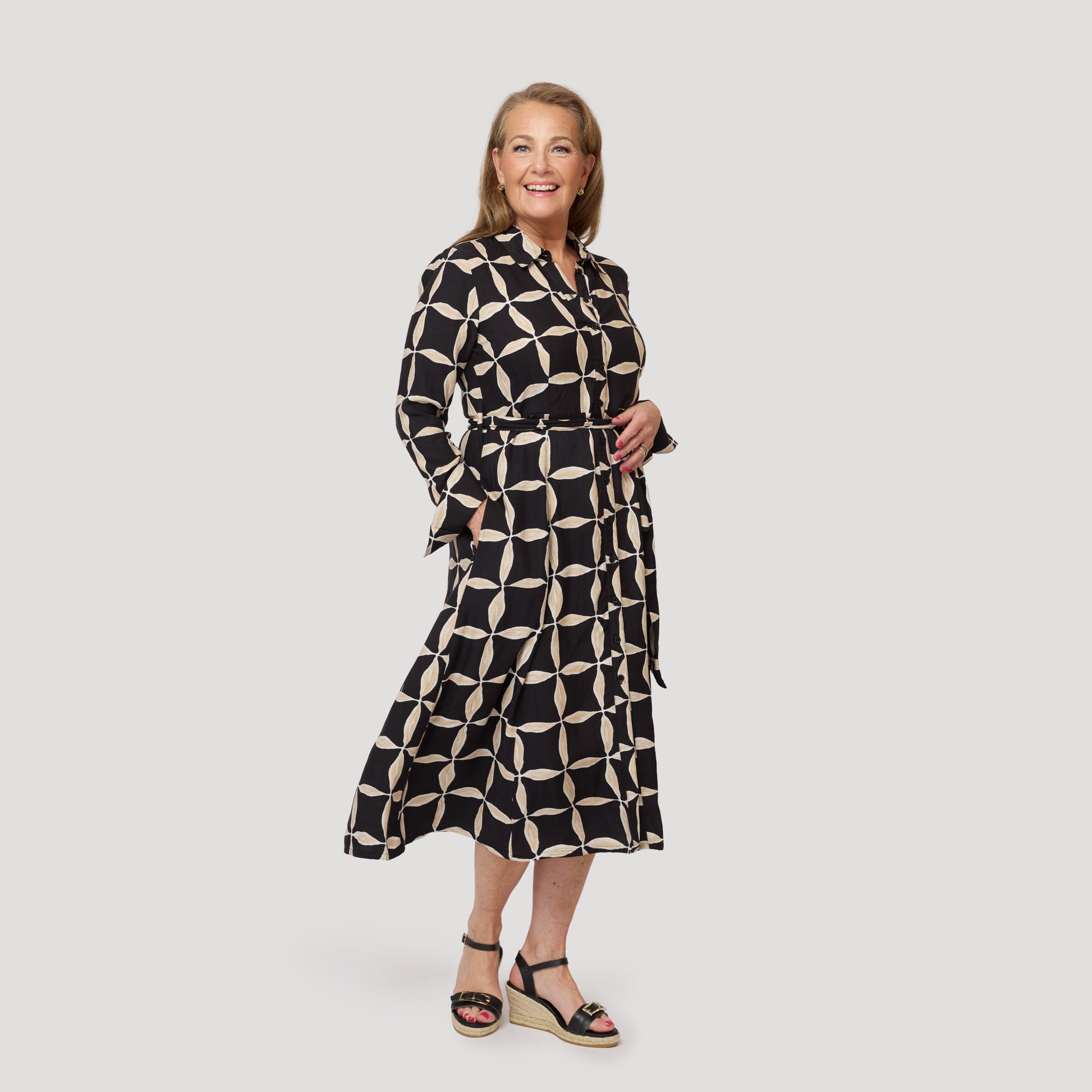 Paidanreikämekko 100 % viskoosia, jossa graafinen kuvio mustana ja beigenä. Kaunis klassinen mekko, jossa on pitkittäissaumat imartelevaa istuvuutta varten. Mekossa on sivutaskut, kaulus ja irrotettava nauha vyötäröllä. Siinä on myös tyylikäs hihansuu, jossa on korkea hihansuu, nappi ja halkio. Mallimme Yvonne on 170 cm pitkä ja käyttää kokoa M.