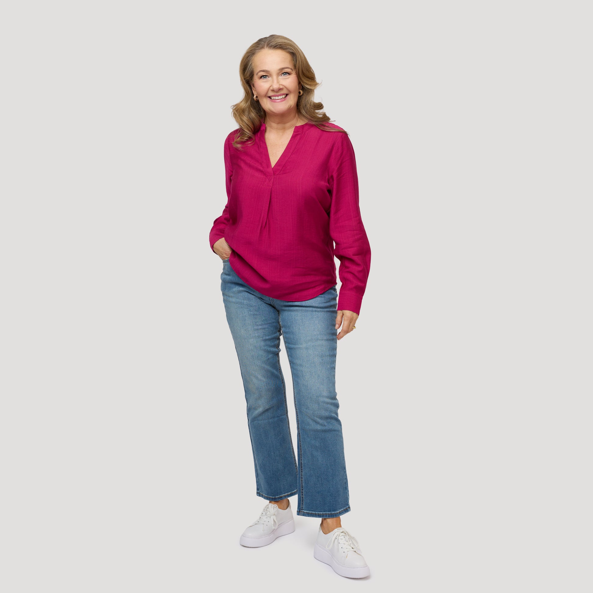 Tummanpinkki lyhyt pusero keskisinisille farkuille