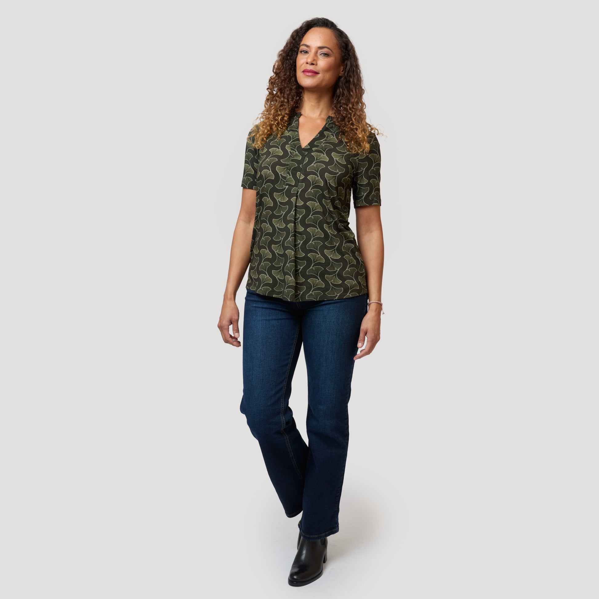 Suorat farkut vihreäkuvioisen topin kanssa