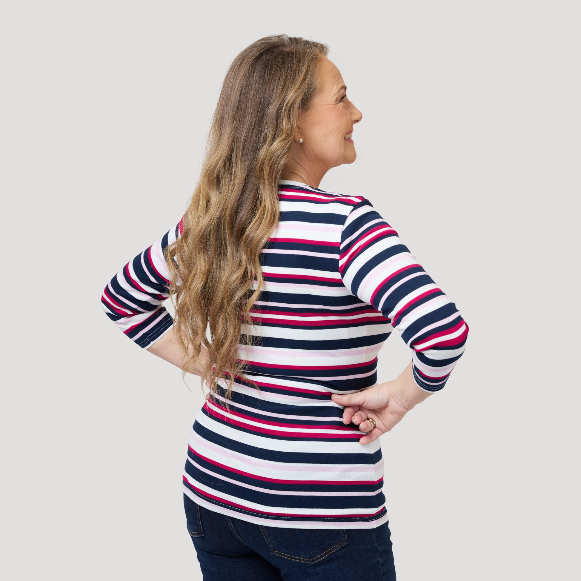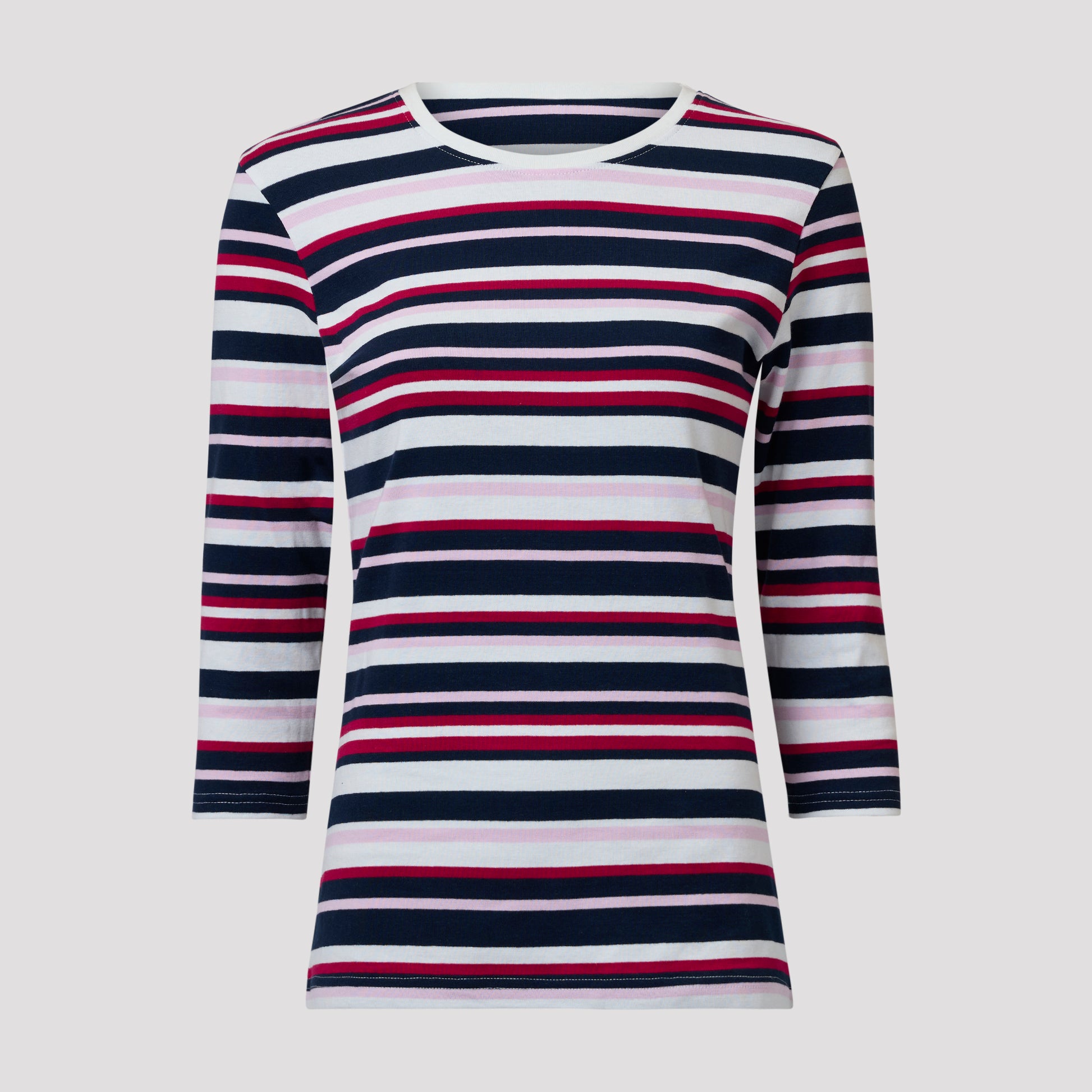 Raidallinen puuvillatoppi pyöreällä pääntiellä. Klassinen toppi, jossa on vaaleanpunaisen, sinisen ja vadelmanpunaisen raidat. Toppi on kolmeneljäsosahihainen. Mallimme Yvonne on 170 cm pitkä ja käyttää kokoa M.