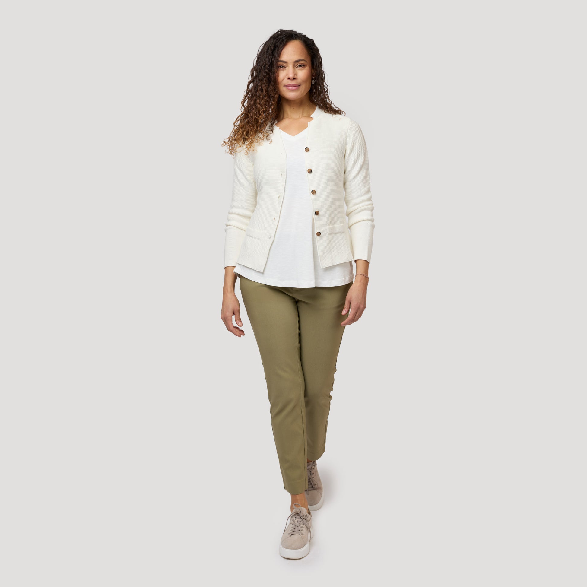 Ton i ton i offwhite med cigarettbyxor i grönt