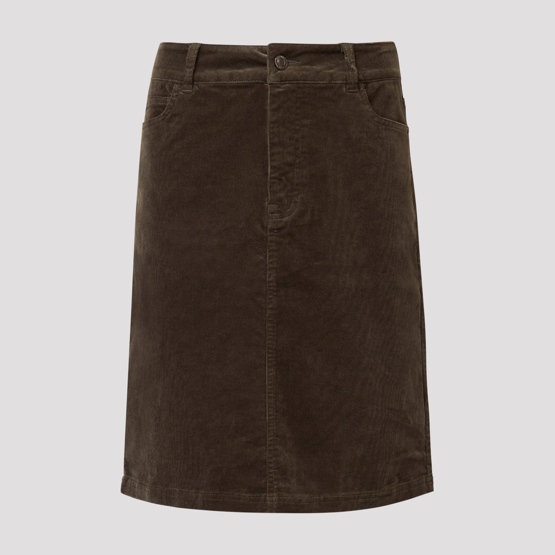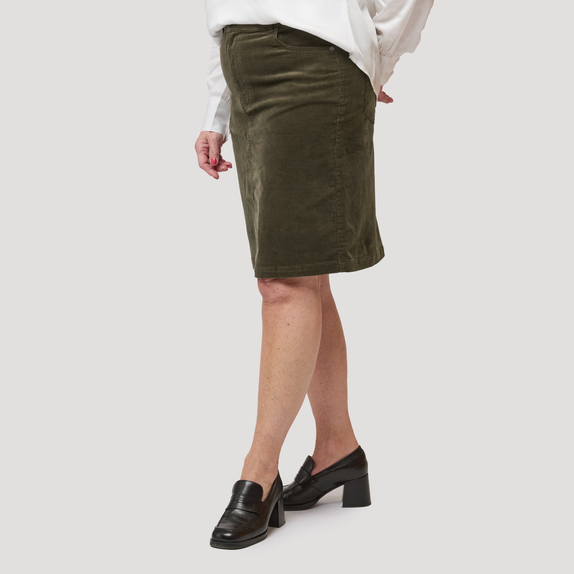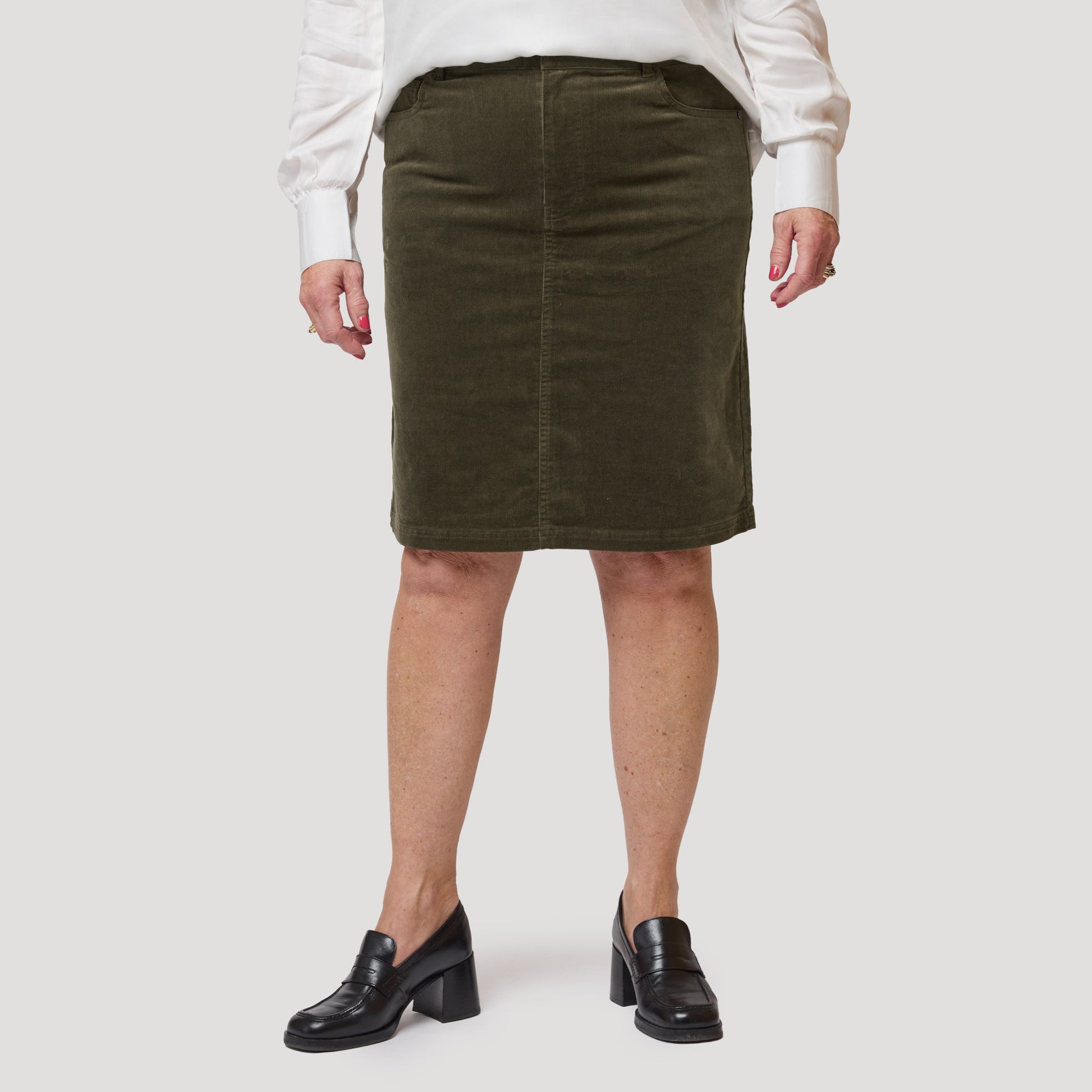 Vihreä samettihame , jossa klassinen viisitaskumalli. Polvipituinen puuvillasekoitteesta valmistettu hame, joka on mallissa hieman levenevä. Mallimme Yvonne on 170 cm pitkä ja käyttää kokoa 40 .