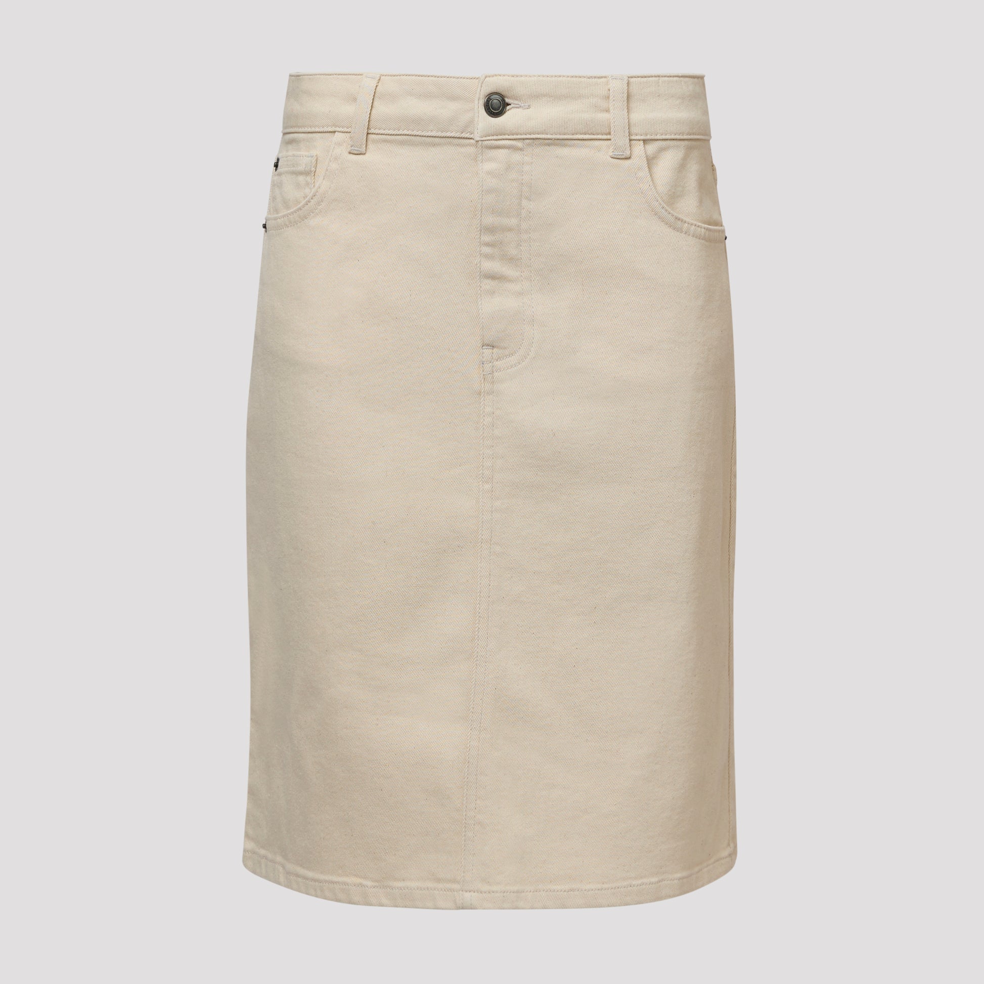 Beige hame klassisessa farkkuhameen mallissa, jossa on taskut edessä ja takana. Polvipituinen hame joustavaa puuvillaa, jossa on kevyesti levenevä malli imartelevaa istuvuutta varten. Väri on luonnonpuuvillan sävyä, minkä vuoksi kangas on meleerattu ja sävy voi vaihdella hieman. Tämän värin materiaali on hieman vähemmän joustavaa kuin sinisessä denimissämme. Mallimme Marianne on 173 cm pitkä ja käyttää kokoa S.