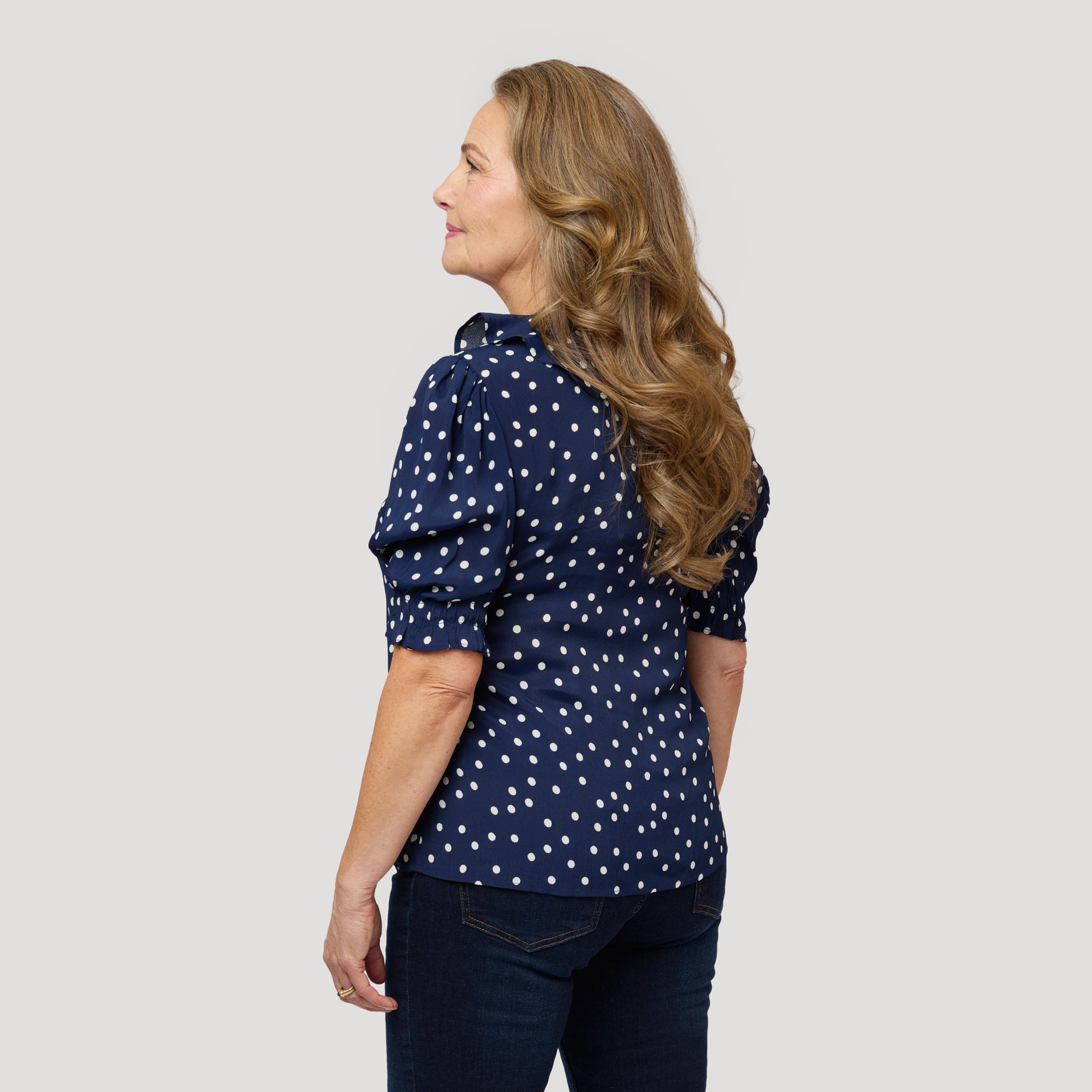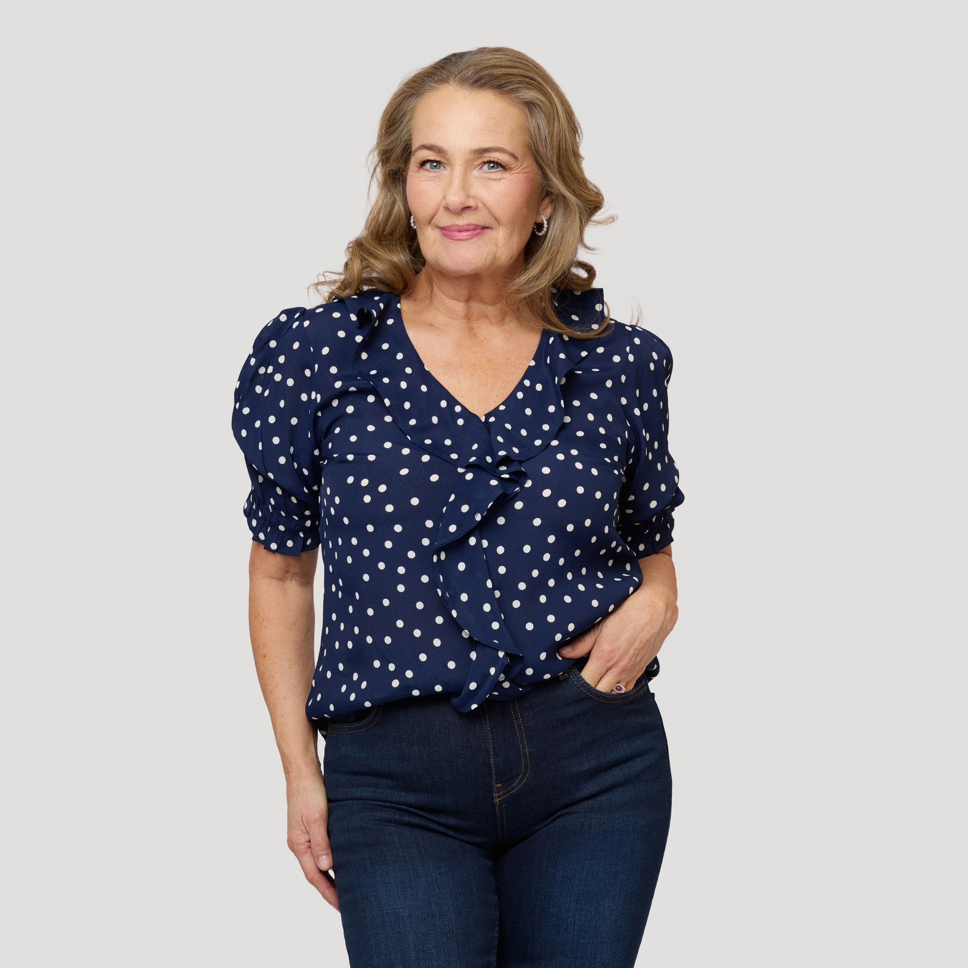 Prickig V-ringad blus med mörkblå botten och en förvillande volang runt halsringning och framtill. Den kvinnliga blusen har en puffärm med resår och volang i ärmslut. Vår modell Yvonne är 170 cm och har storlek S på sig.
