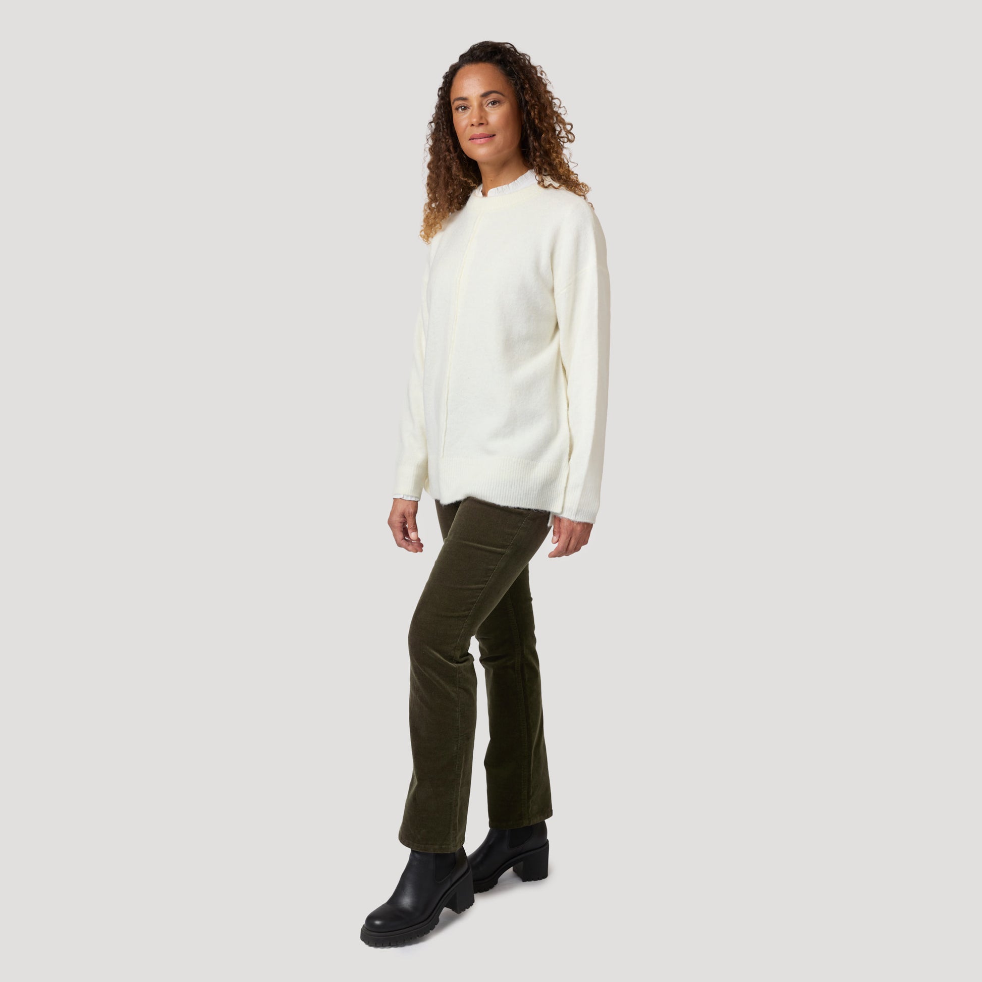 Valkoista vihreiden vakosamettifarkkujen kanssa