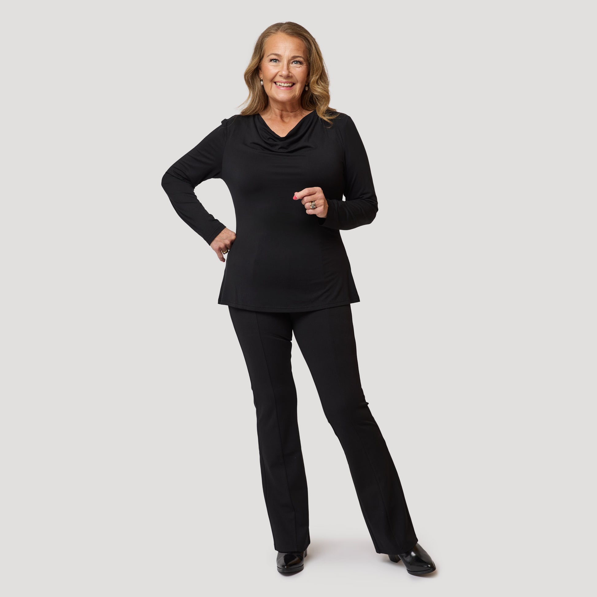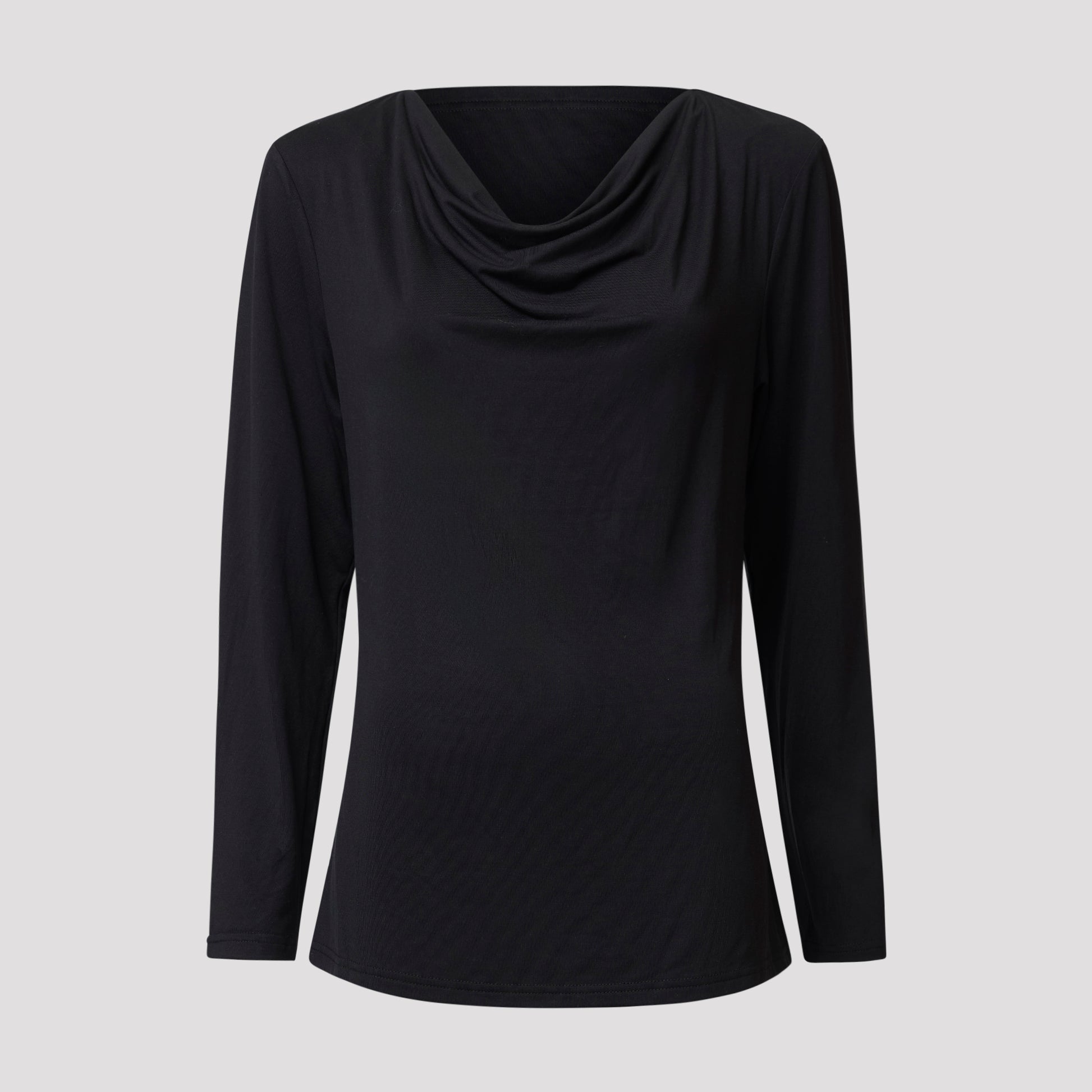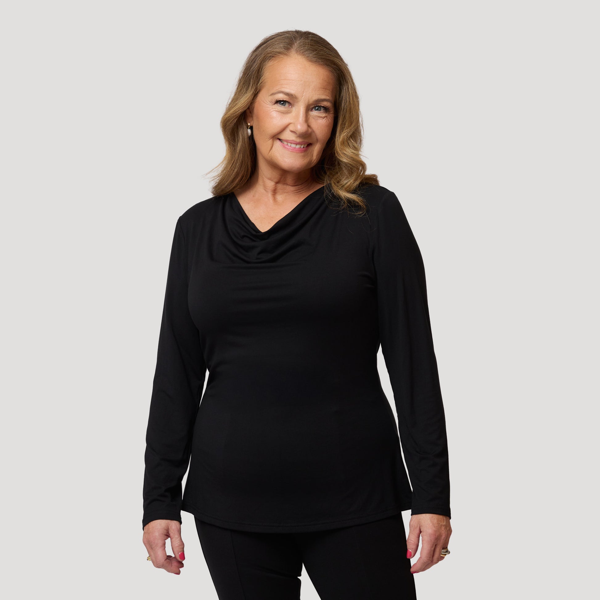 Musta pitkähihainen paita, jossa laskostettu pääntie. Tyylikäs ja käytännöllinen paita sekä juhlaan että arkeen. Jerseypaita, jossa on vesiputouspääntie, joka antaa vaatteelle joustavamman istuvuuden rinnan päällä. Mallimme Yvonne on 170 cm pitkä ja käyttää kokoa M.
