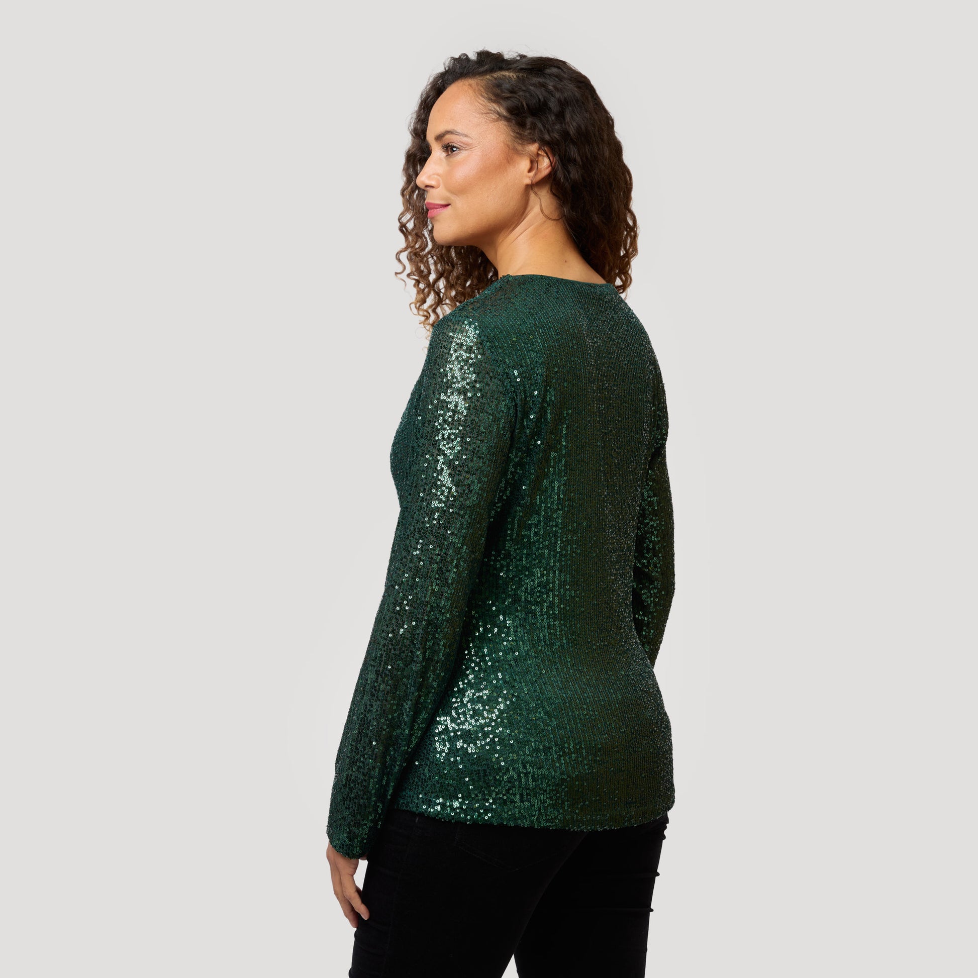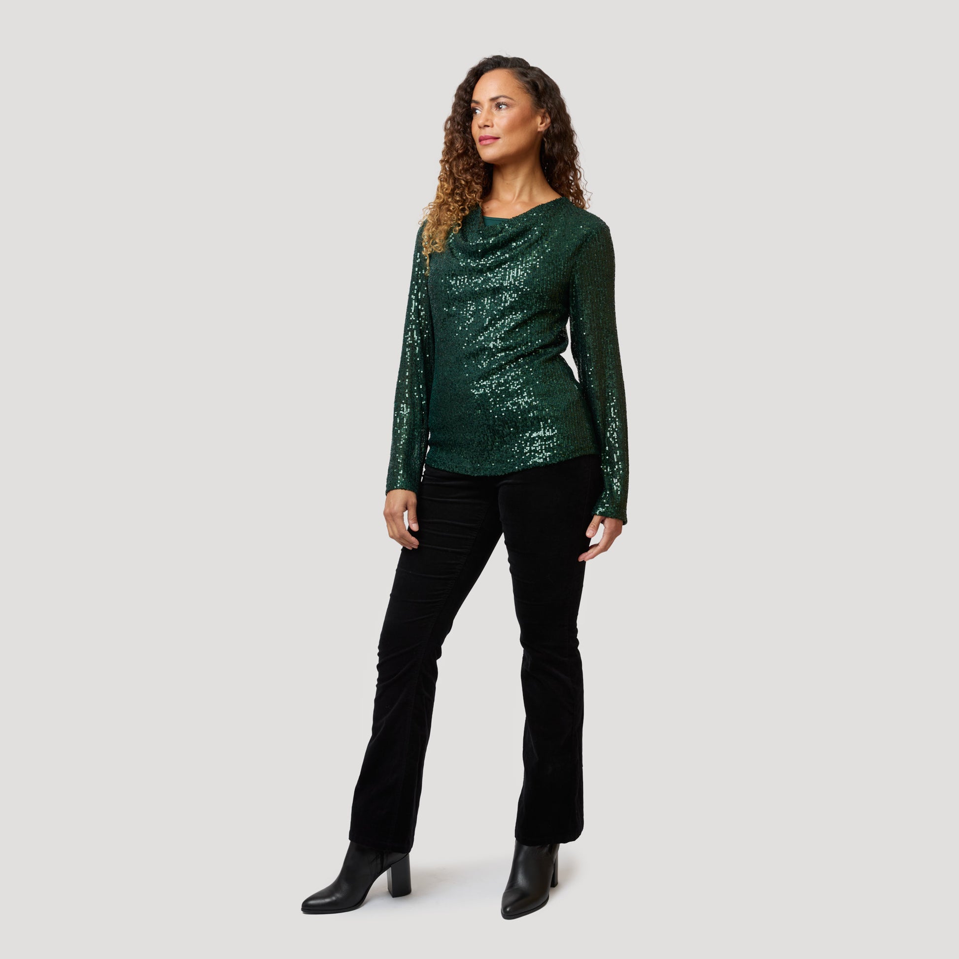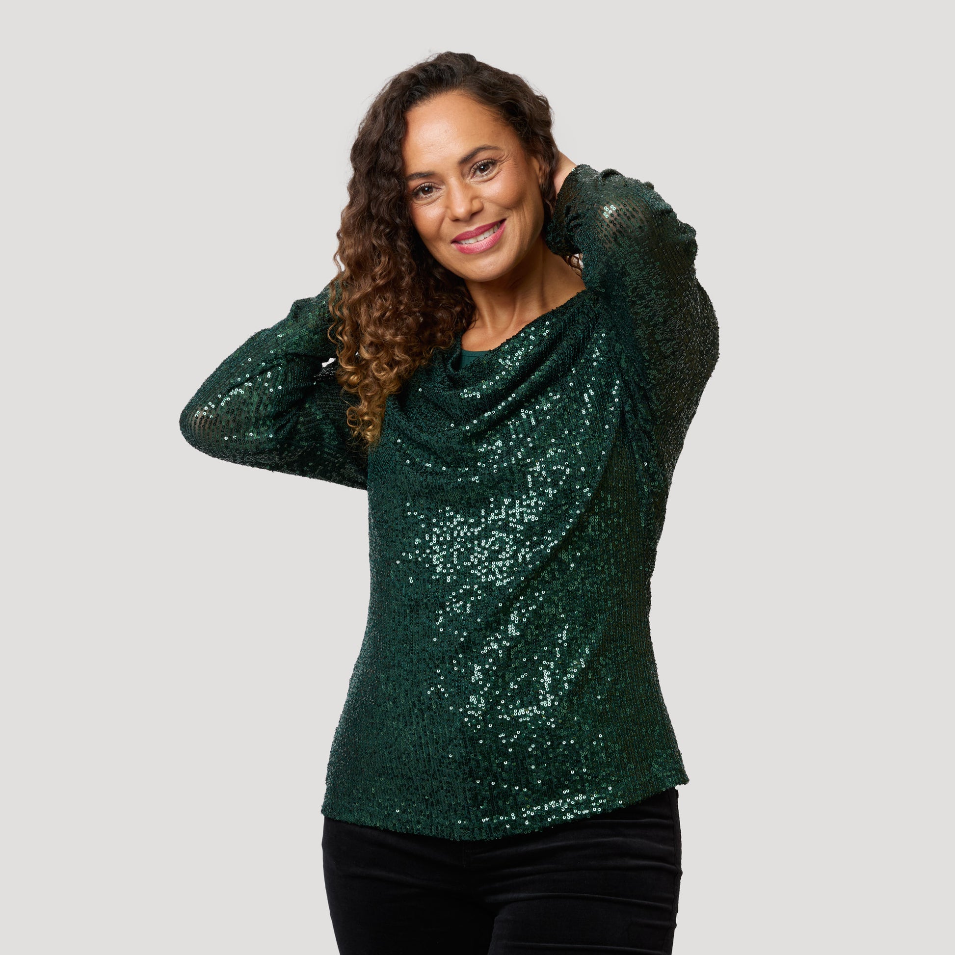 Vihreä paljetein ja pitkin hihoin koristeltu toppi. Juhlatoppi, jossa on vesiputouspääntie, joka tekee siitä joustavan rinnan kohdalta. Tummanvihreä paljetein koristeltu toppi, jossa on joustava, ohut viskoosivuori. Kimaltava toppi sopii täydellisesti kaikkiin juhliin. Mallimme Charlene on 170 cm pitkä ja käyttää kokoa S.