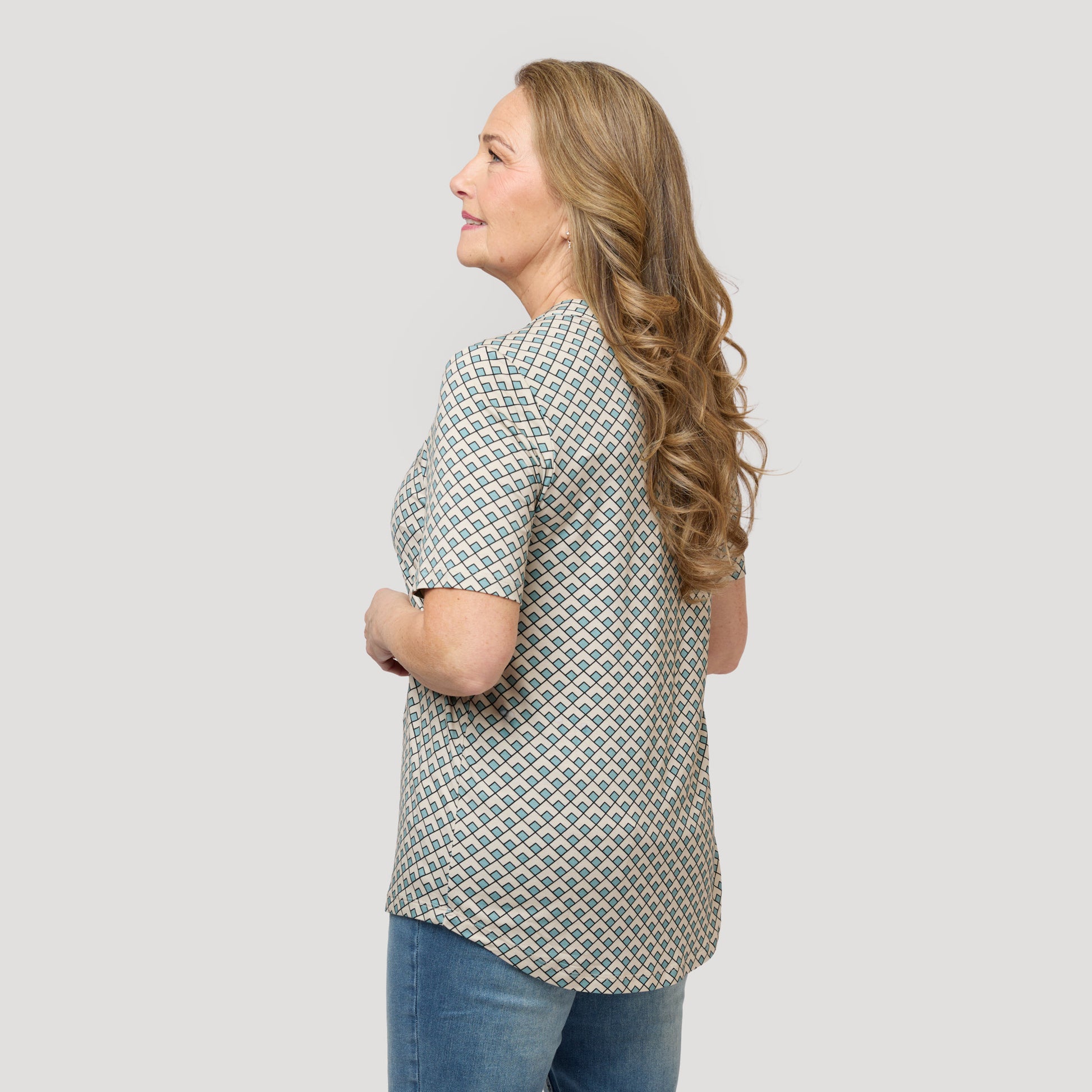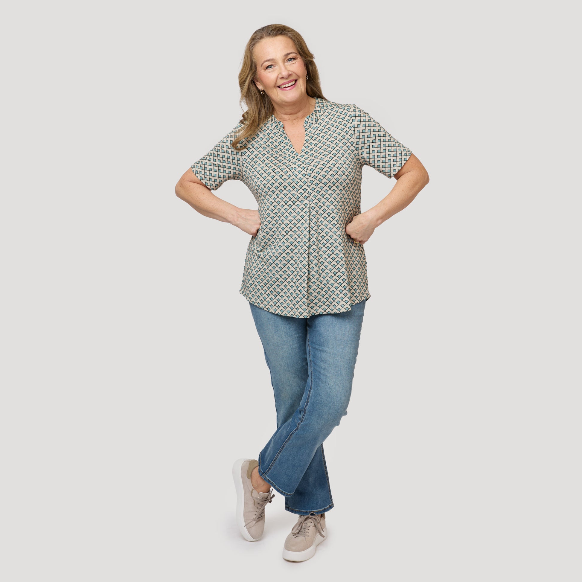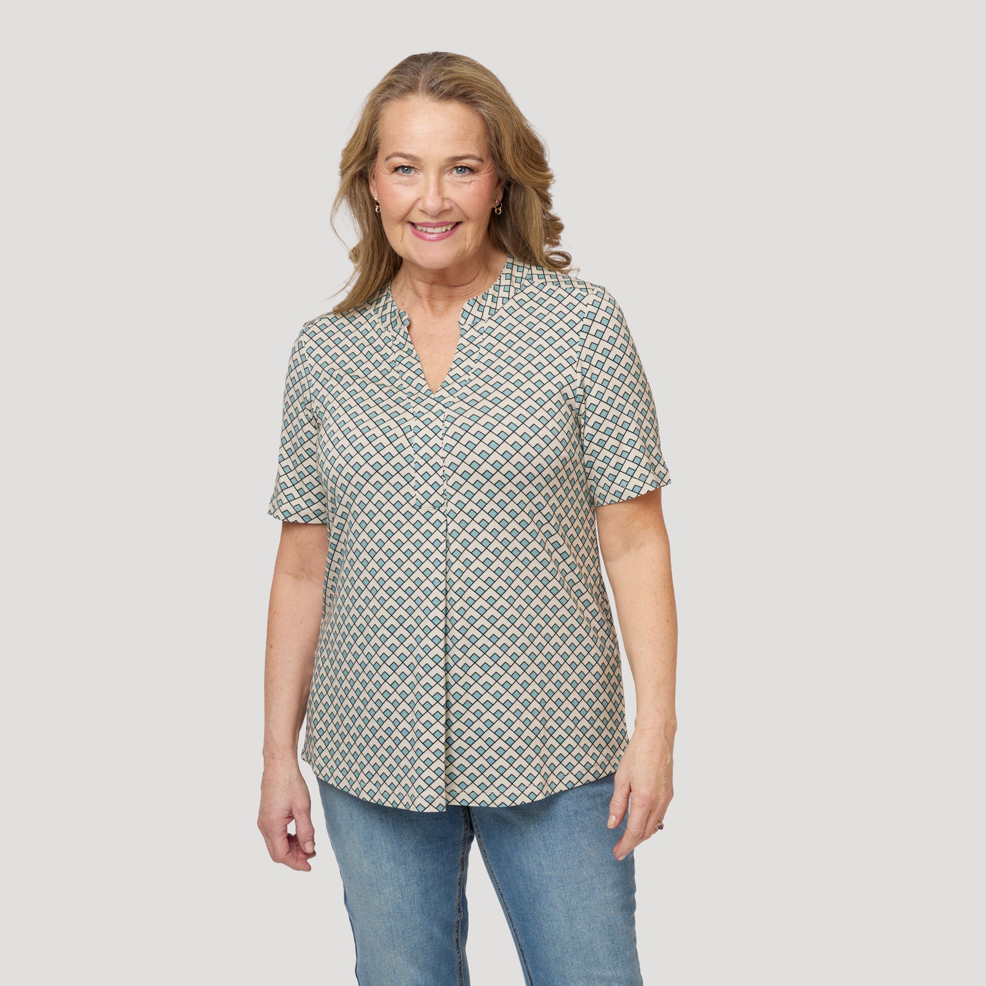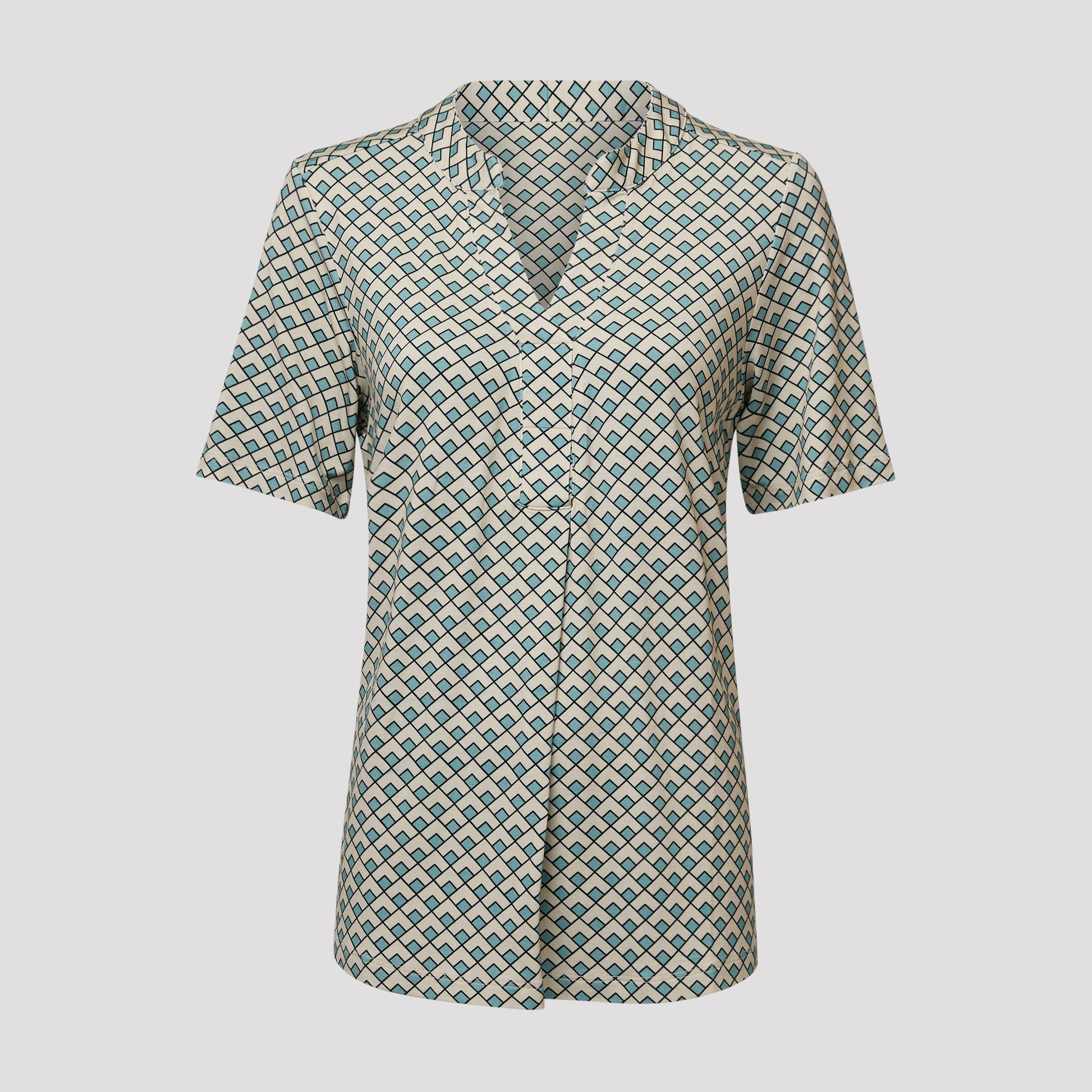 Mukava viskoosipaita, jossa on avaimenreikäpääntie ja laskos edessä. Lyhythihaisessa jerseytopissa on graafinen kuvio beigen, mustan ja turkoosin sävyissä. Pehmeä toppi on pyöristetty helmasta ja hieman pidempi takaa. Mallimme Yvonne on 170 cm pitkä ja käyttää kokoa M.