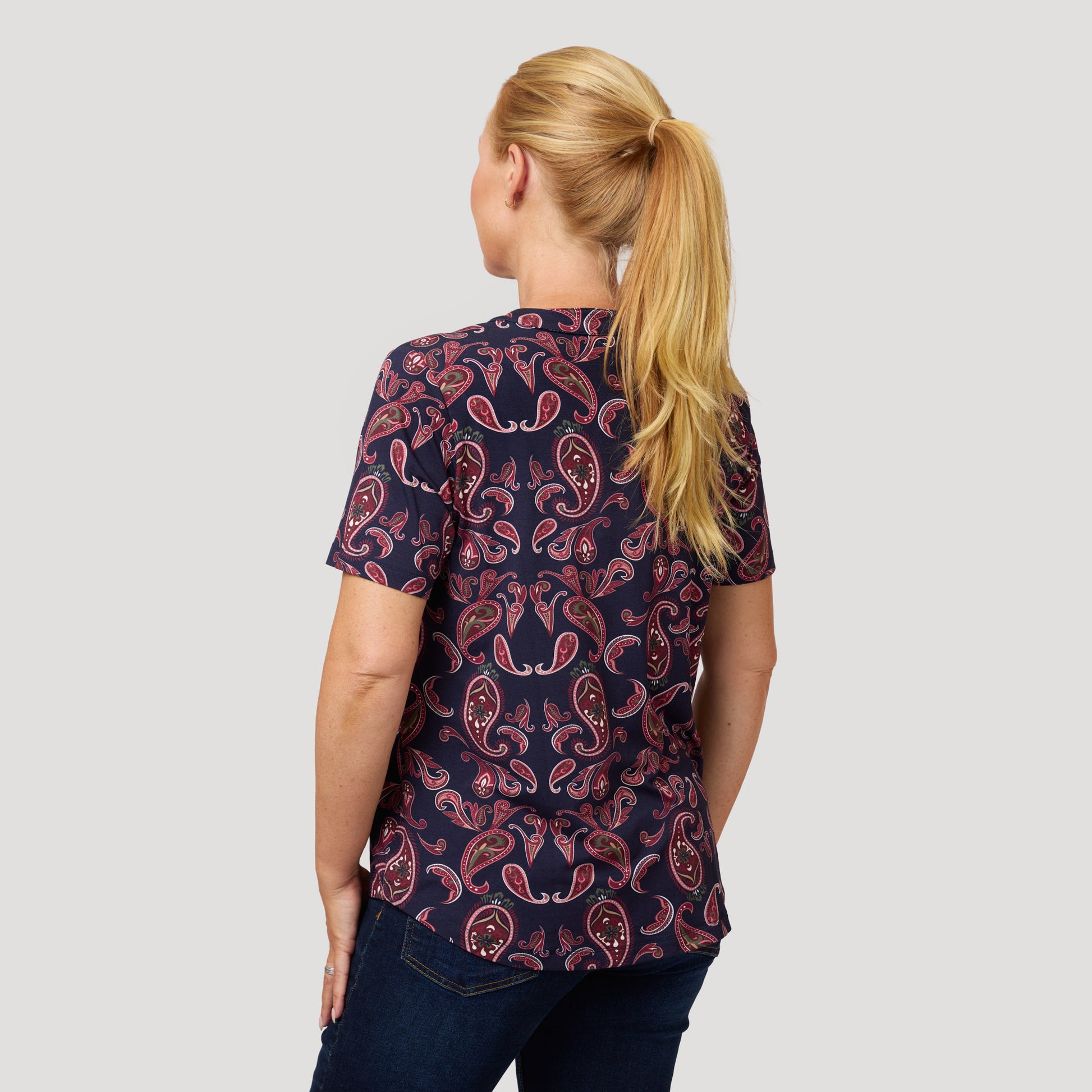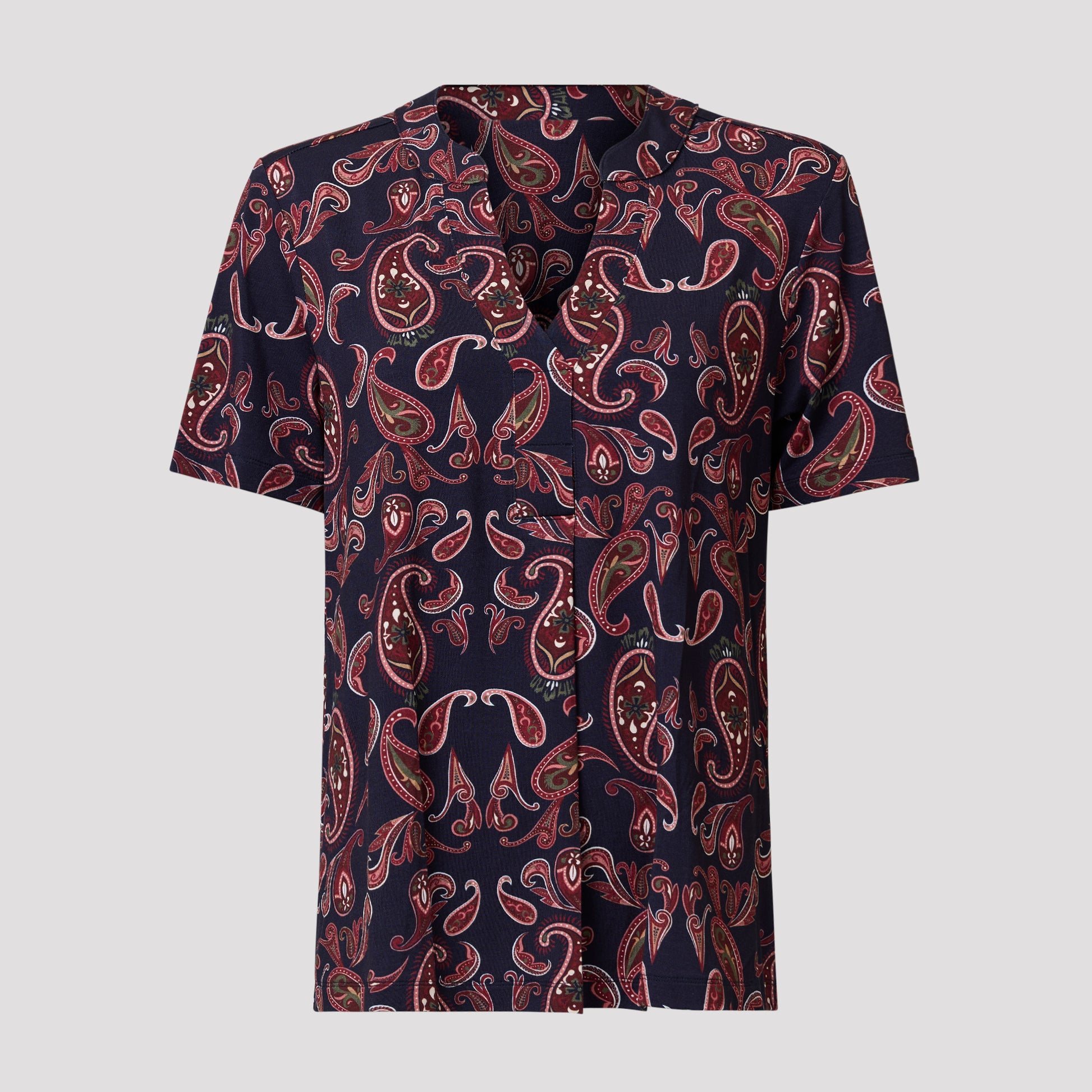 V-aukkoinen paita mukavasta viskoosista, jossa on kaunis paisley-kuvio ja tummansininen pohja. Lyhythihaisessa jerseypaidassa on avaimenreikäpääntie ja laskos edessä. Pehmeä yläosa on pyöristetty helmasta ja hieman pidempi takaa. Mallimme Yvonne on 170 cm pitkä ja käyttää kokoa M.