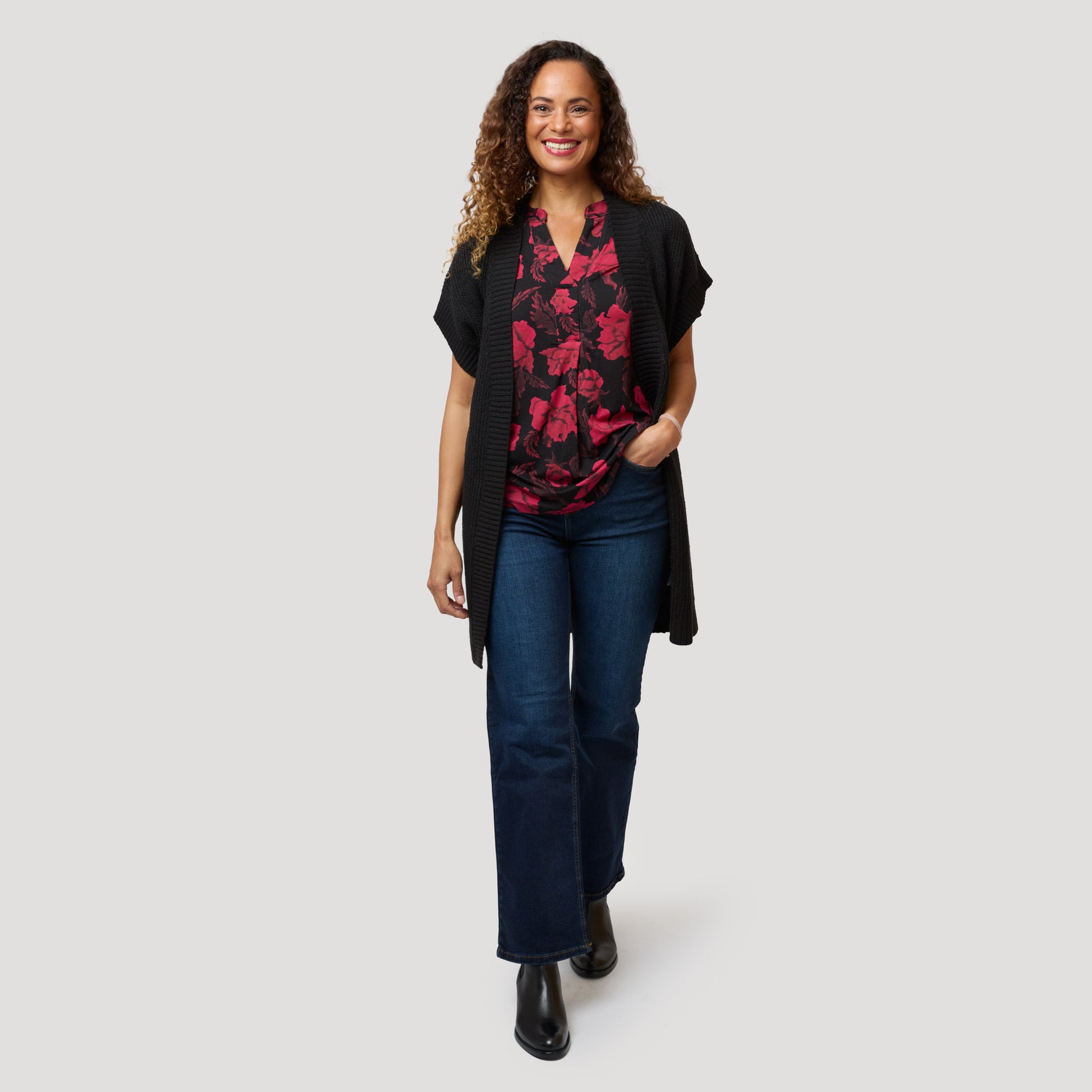V-pääntieinen toppi miellyttävästä viskoosista, jossa on keyhole-leikkaus ja laskos edessä. Lyhythihaisessa trikootopissa on kaunis kukkakuosi punaisen ja tumman roosan sävyissä mustalla pohjalla. Pehmeä juhlatoppi on pyöristetty helmasta ja hieman pidempi takaa. Mallimme Charlene on 170 cm pitkä ja käyttää kokoa S.