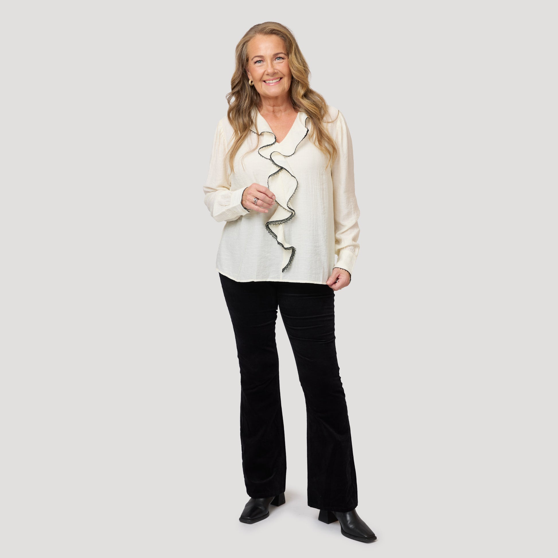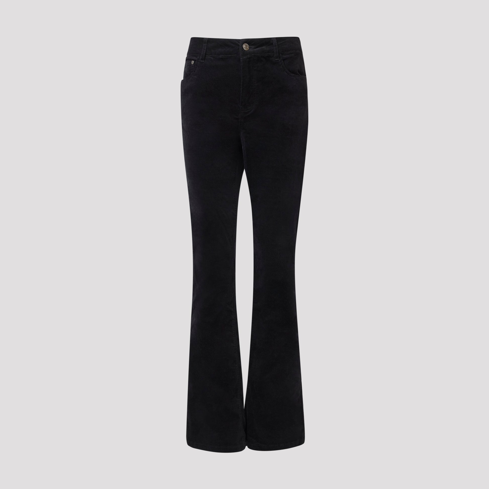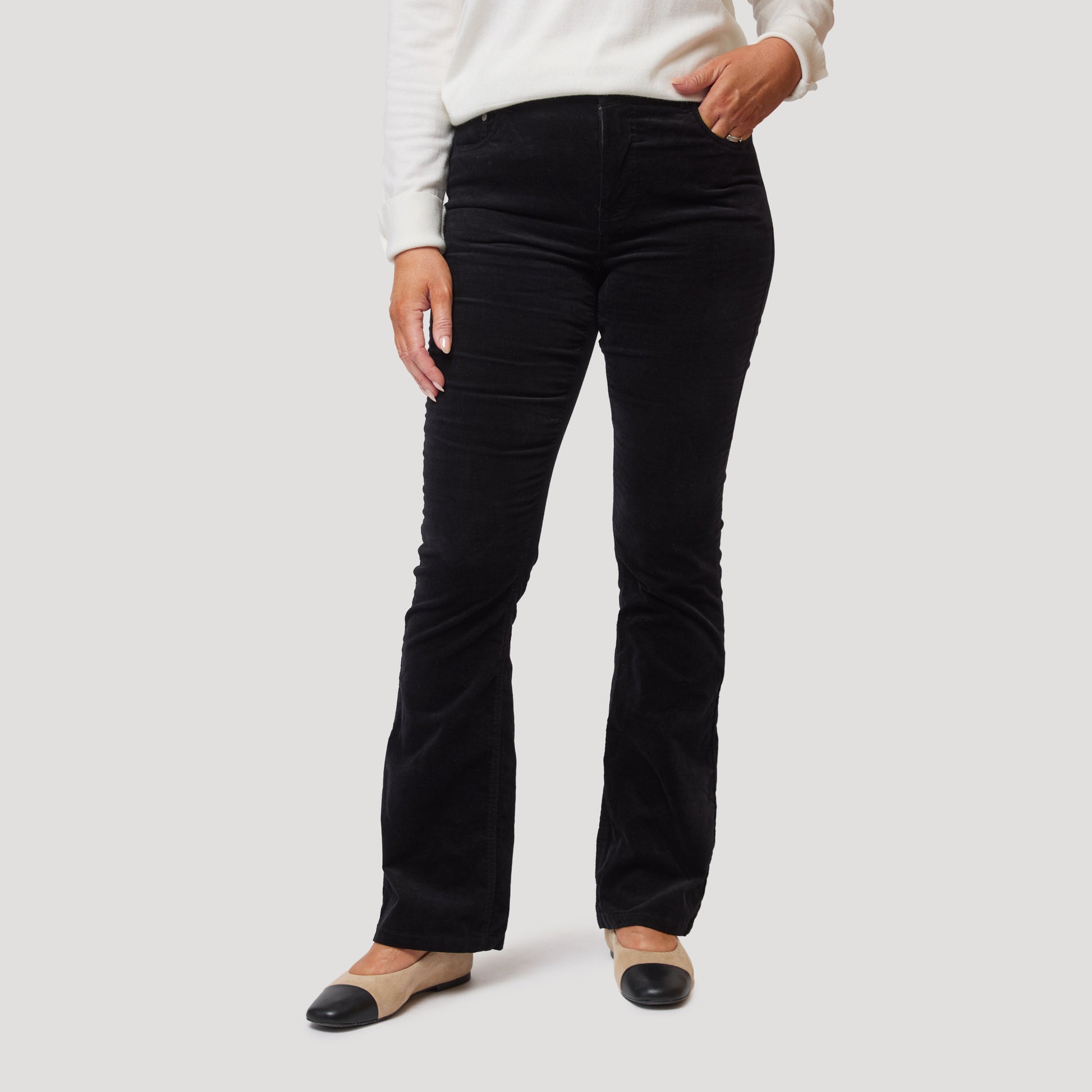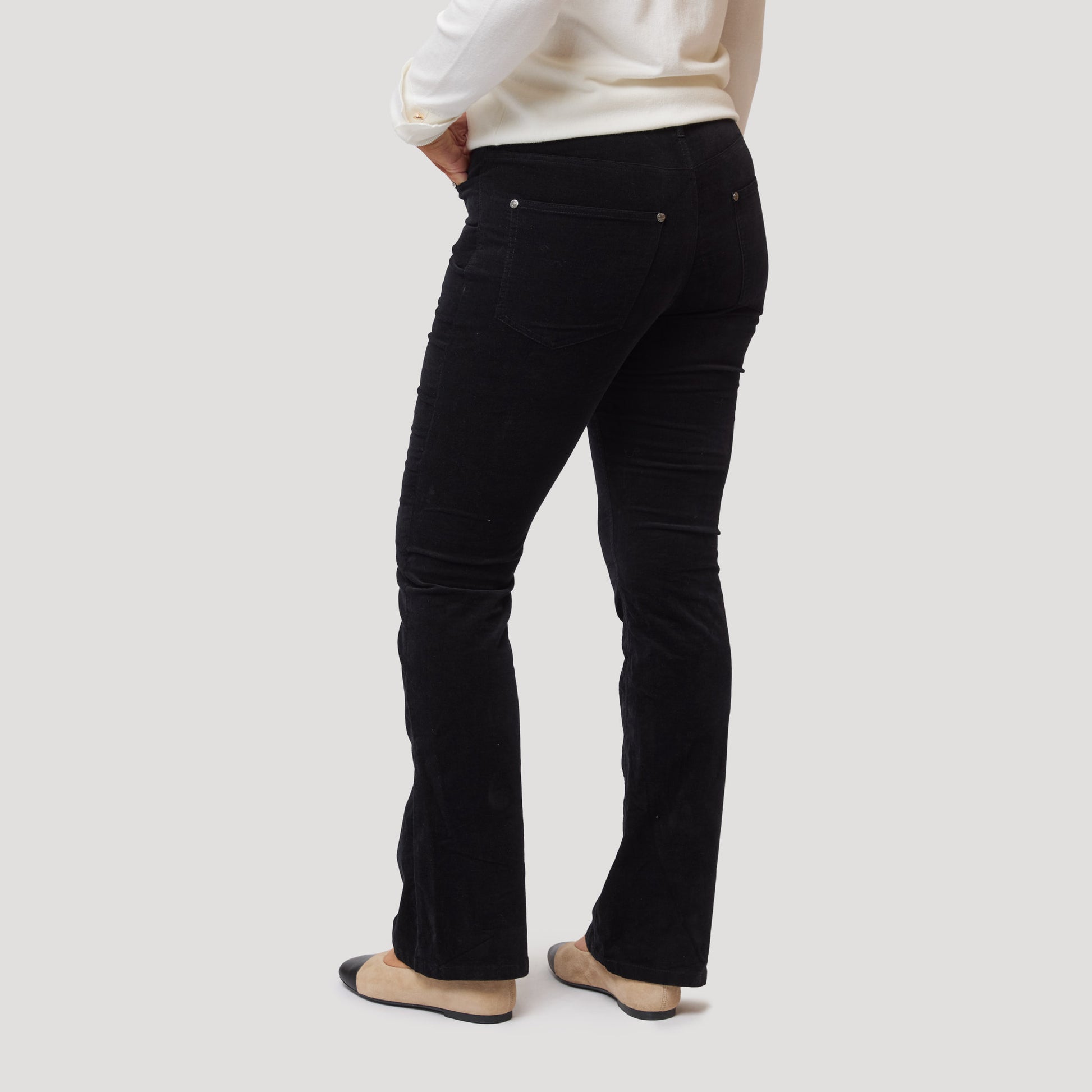 Svarta sammetsbyxor med lätt utställda långa ben och hög midja. Stretchig byxa i bootcut modell med klassiska fickor fram och bak. Sammet i bomull med en liten del elastan för komfort. Denna byxan är lite mindre stretchig i midjan än våra Alma i denim så vi rekommenderar att man går upp en storlek. Vår modell Marianne är 170 cm och har storlek 38 på sig.
