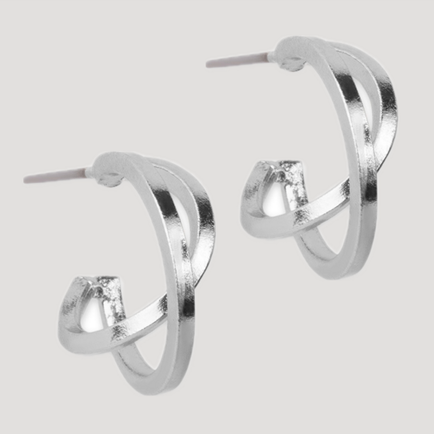 En liten dubbelring som går i kors. Örhänget är silverpläterat och mäter 1,4 cm i diameter. Stiftet är i kirurgiskt stål. Nickelsäkert.