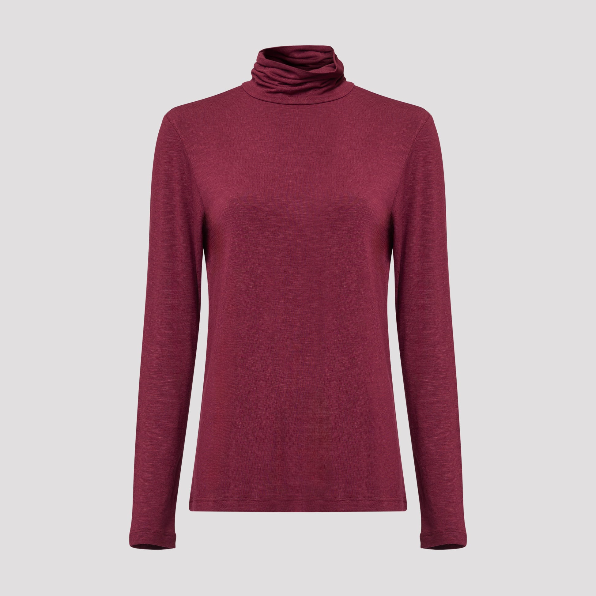 Vinröd polotröja i trikå med lång ärm. Tröja i viskos med lite struktur i tyget. Dessa toppar är i samma material som våra populära Jolie toppar. Vår modell Marianne är 170 cm och har storlek S på sig.