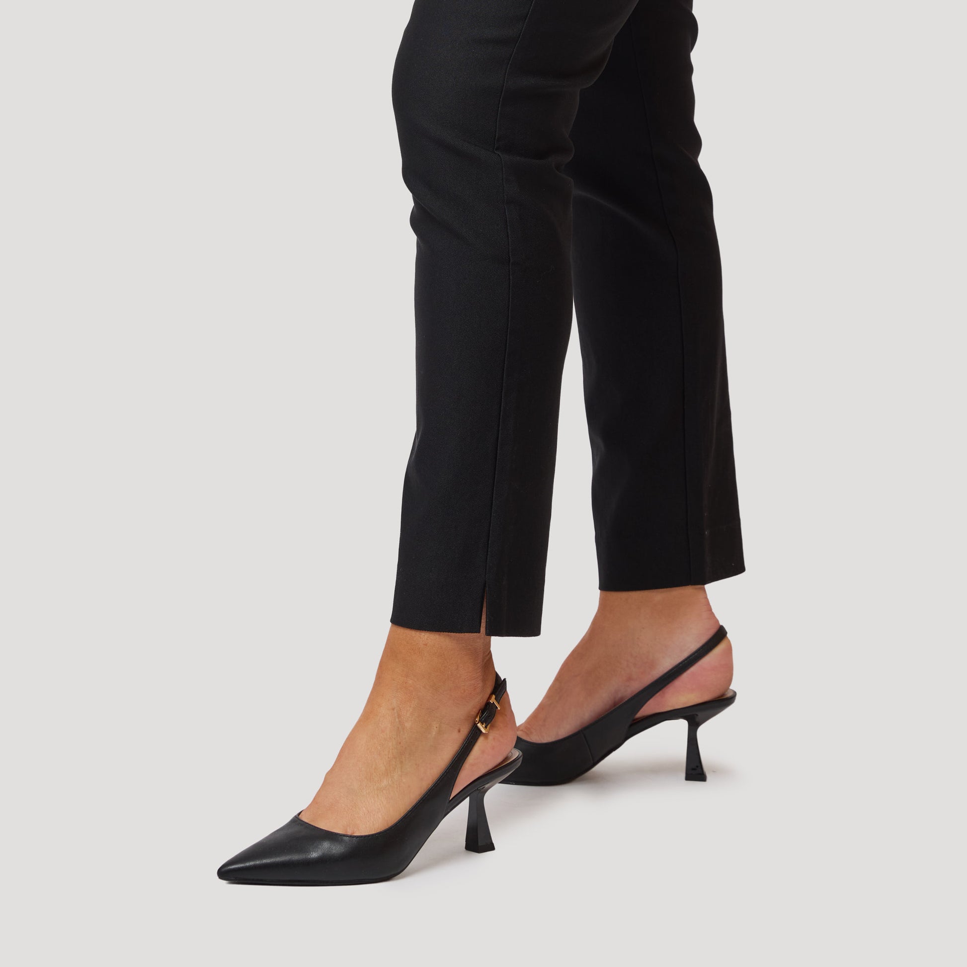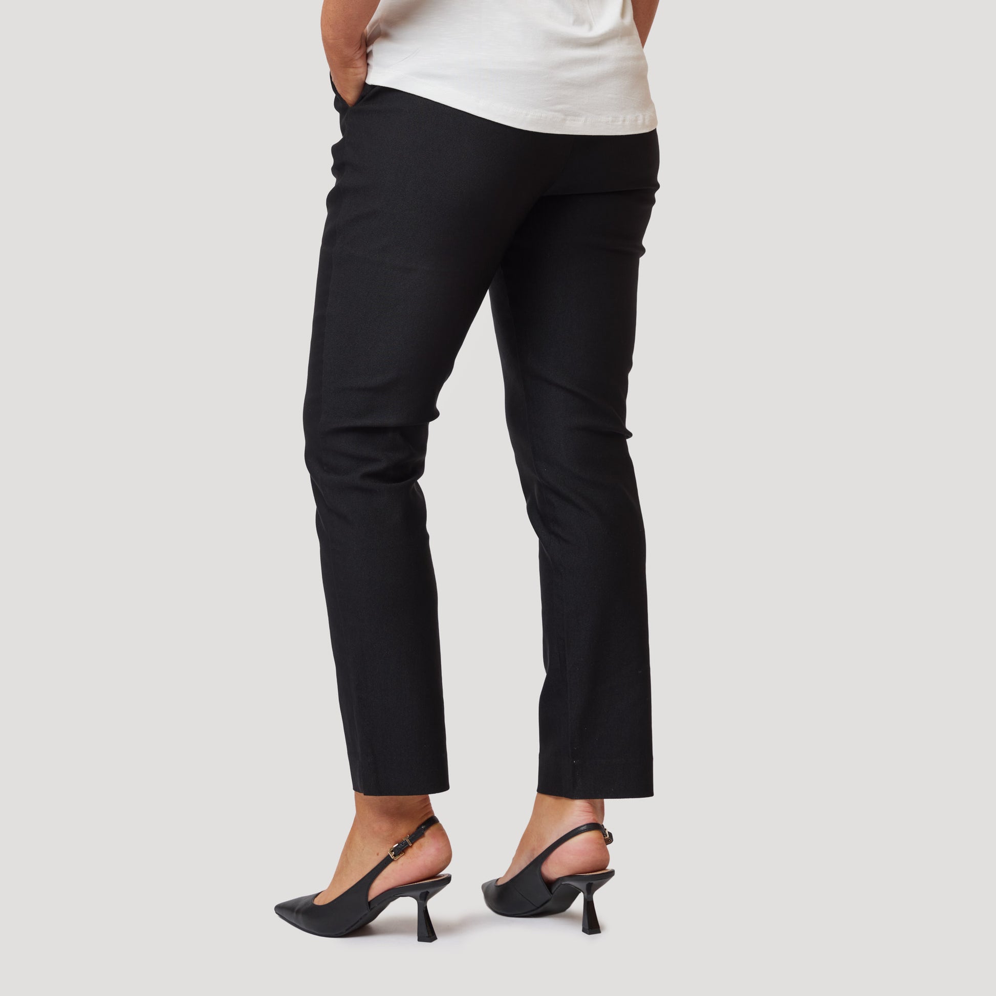 Sköna svarta byxor med hög midja och avsmalnande ben. Stretchig byxa med dold resår baktill med klassiska fickor fram och bak. Det mycket stretchiga tyget gör byxan perfekt både som kostymbyxa och vardagsbyxa. Om du tvekar mellan två storlekar så rekommenderar vi att du väljer den mindre storleken. Vår modell Marianne är 170 cm och har storlek 38 på sig.
