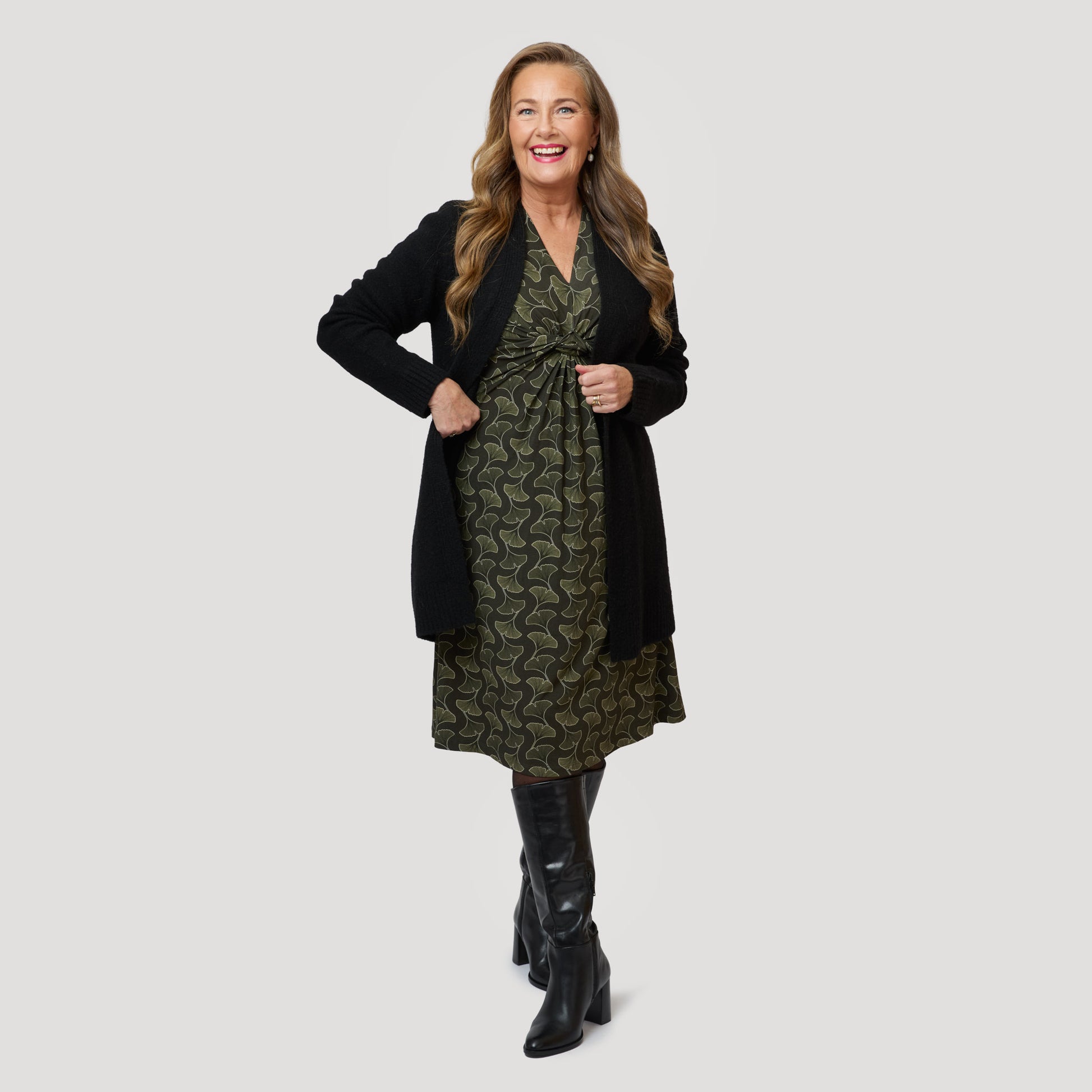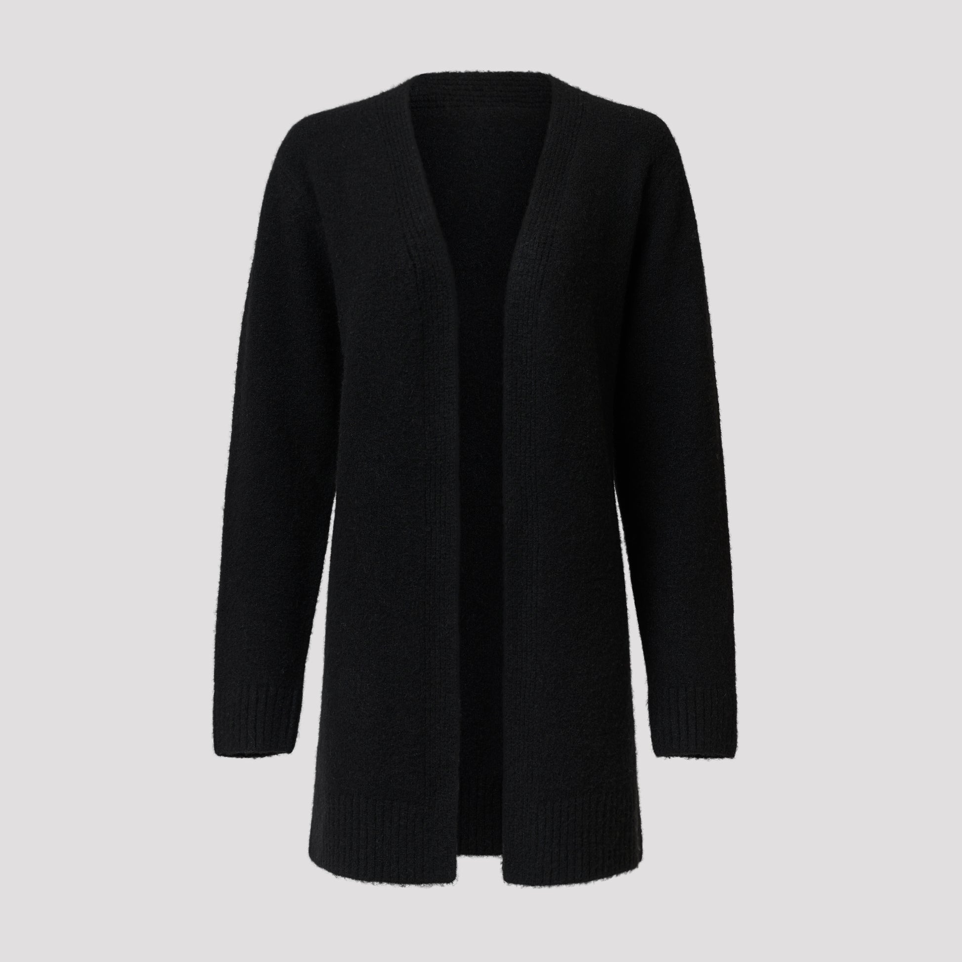 Svart cardigan som är V-ringad och öppen framtill. Mjuk, längre kofta med ribb i nederkant och ärmslut. En kofta utan knappar som är perfekt att ha både till byxor som över klänning. Mysigt lite tjockare stickning perfekt för kallare dagar. Tvekar du mellan två storlekar så välj den mindre. Vår modell Marianne är 173 cm och har storlek S på sig.