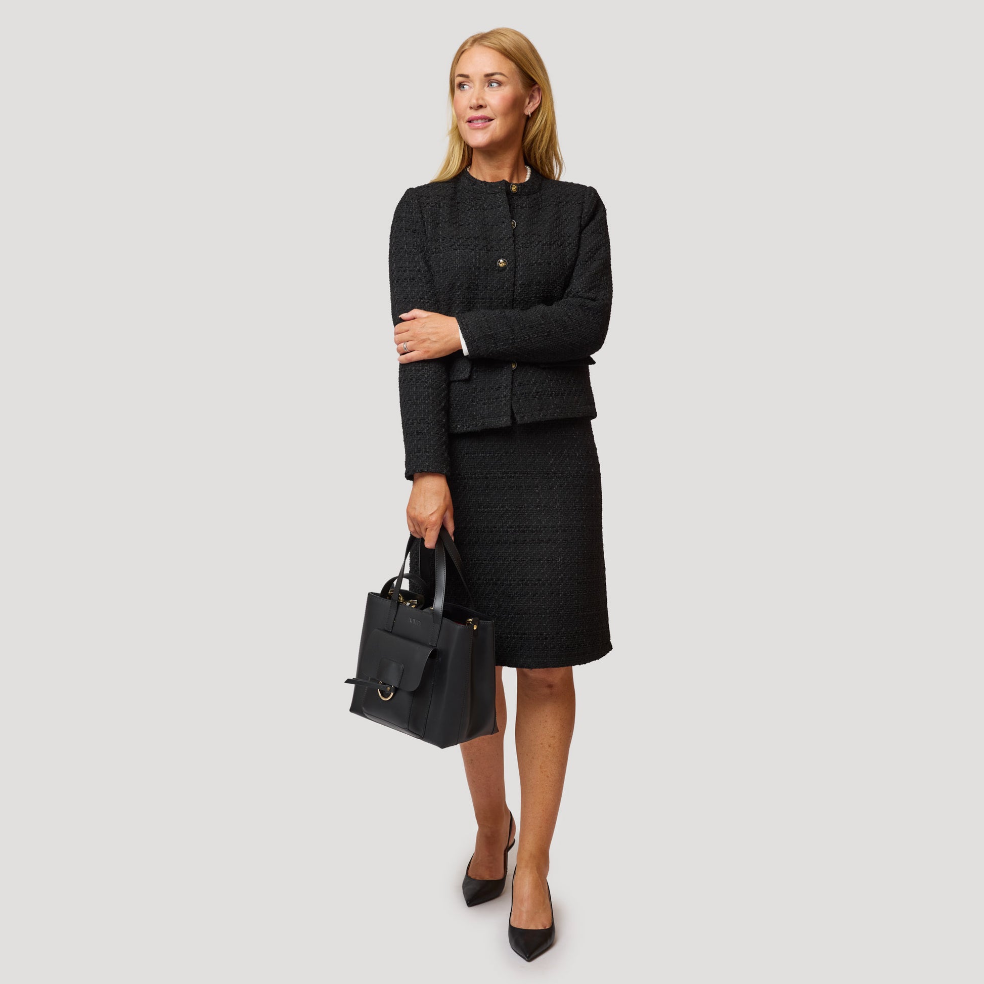 Svart jacka med rund hals i boucle tyg med fina knappar med guldkant. Jackan har lång ärm och fickor med ficklock fram. Jackan är smickrande på de flesta kroppsformar och är fin både till fest och till vardags. Vår modell Yasmine är 163cm och har storlek S på sig.