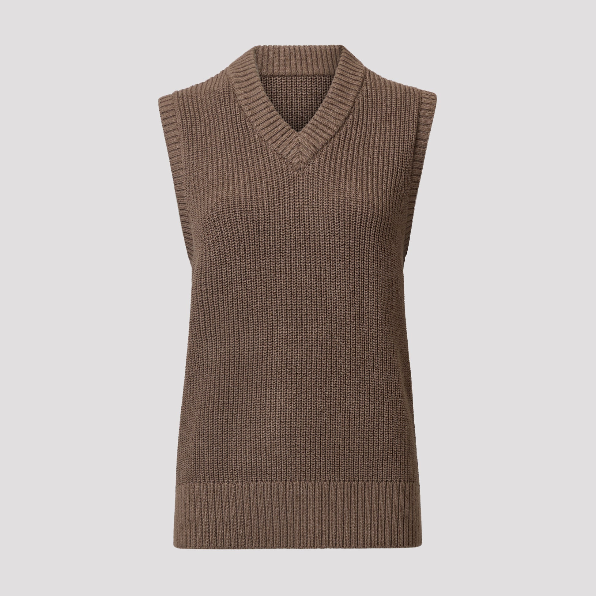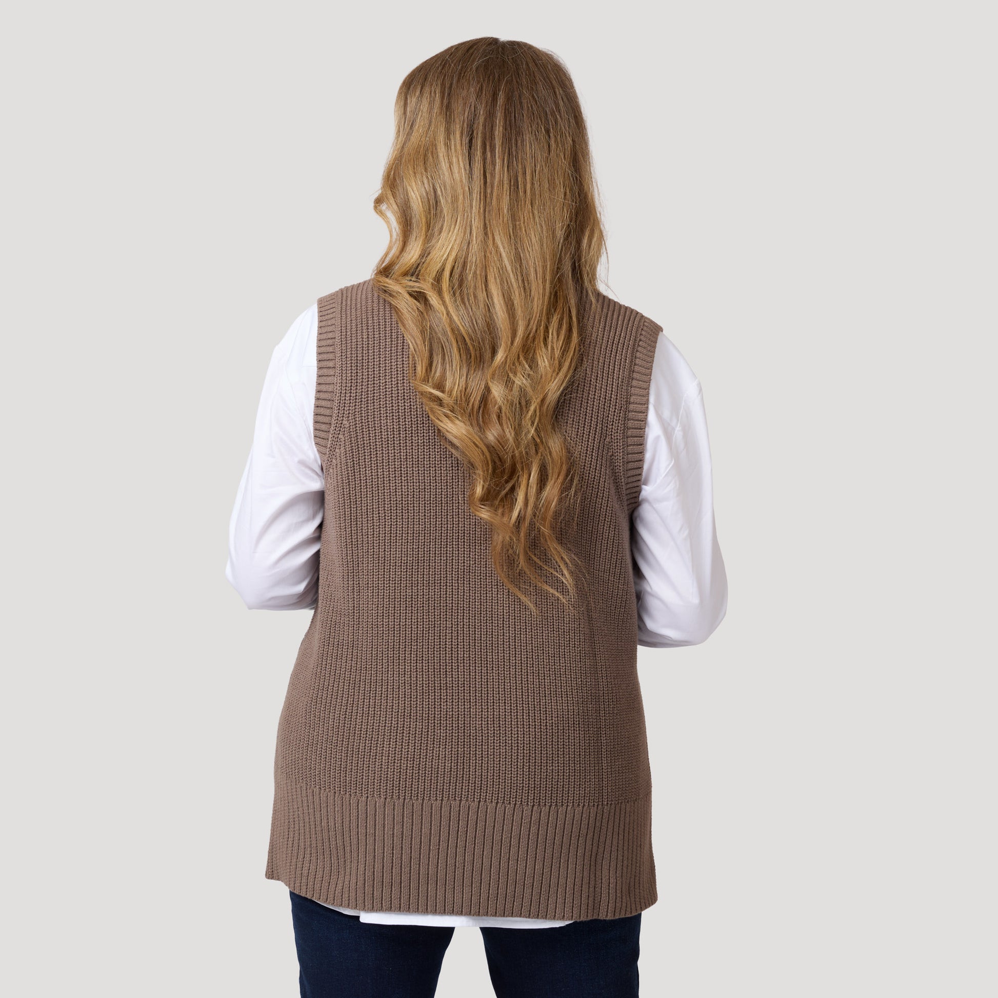 Brun mjuk väst stickad i en luftig blandning med bomull som inte gör den för varm. V-ringad ribbstickad väst med bred ribb i halsen. Den fina västen i taupe har en framflyttad sidsöm och är något kortare fram än bak. Vår modell Yvonne är 170 cm och har storlek M på sig.