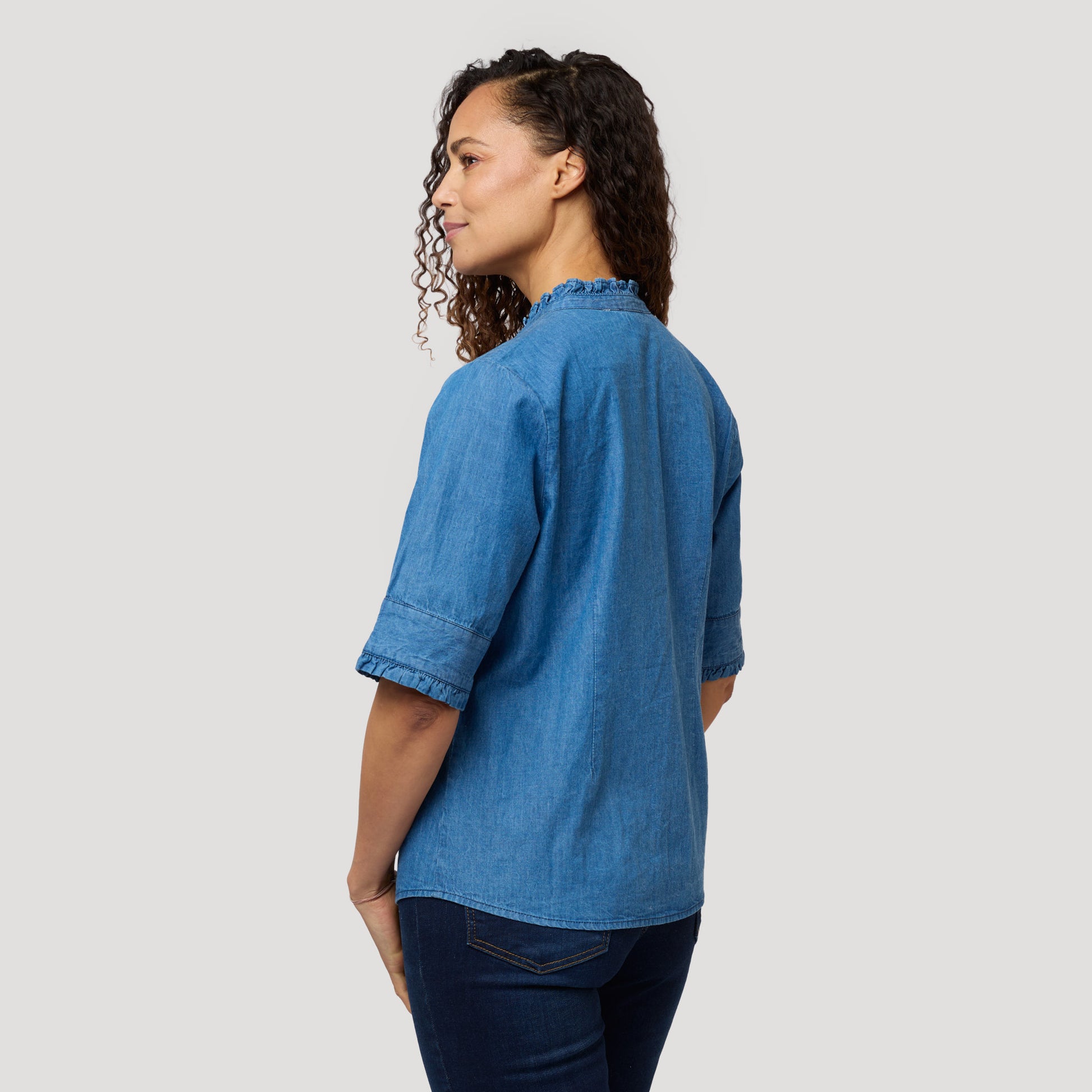 Snygg denimblus i sval blus i 100% bomull med feminina frilldetaljer. Blusen har insnitt för en smickrande feminin silhuett och är fint rundad nedtill. En bekväm V-ringad som kombinerar stil och komfort. Perfekt för både vardagsbruk och mer uppklädda tillfällen. Ett mångsidigt plagg som passar perfekt till både jeans och kjol. Vår modell Charlene är 170cm och har storlek S på sig.