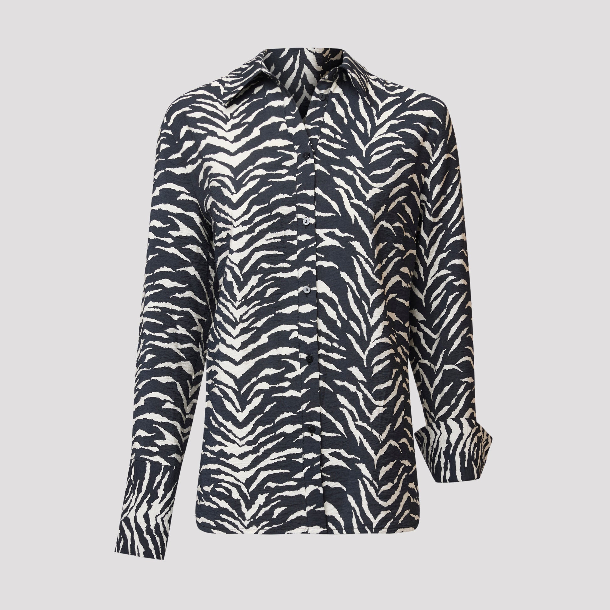Zebramönstrad skjorta i vitt och svart med krage. Klassisk rak skjorta med rundad nederkant och veck i ryggen. Blusen har vid manschett med två knappar som är snygga att vika upp. Vår modell Yvonne är 170 cm och har storlek M på sig.