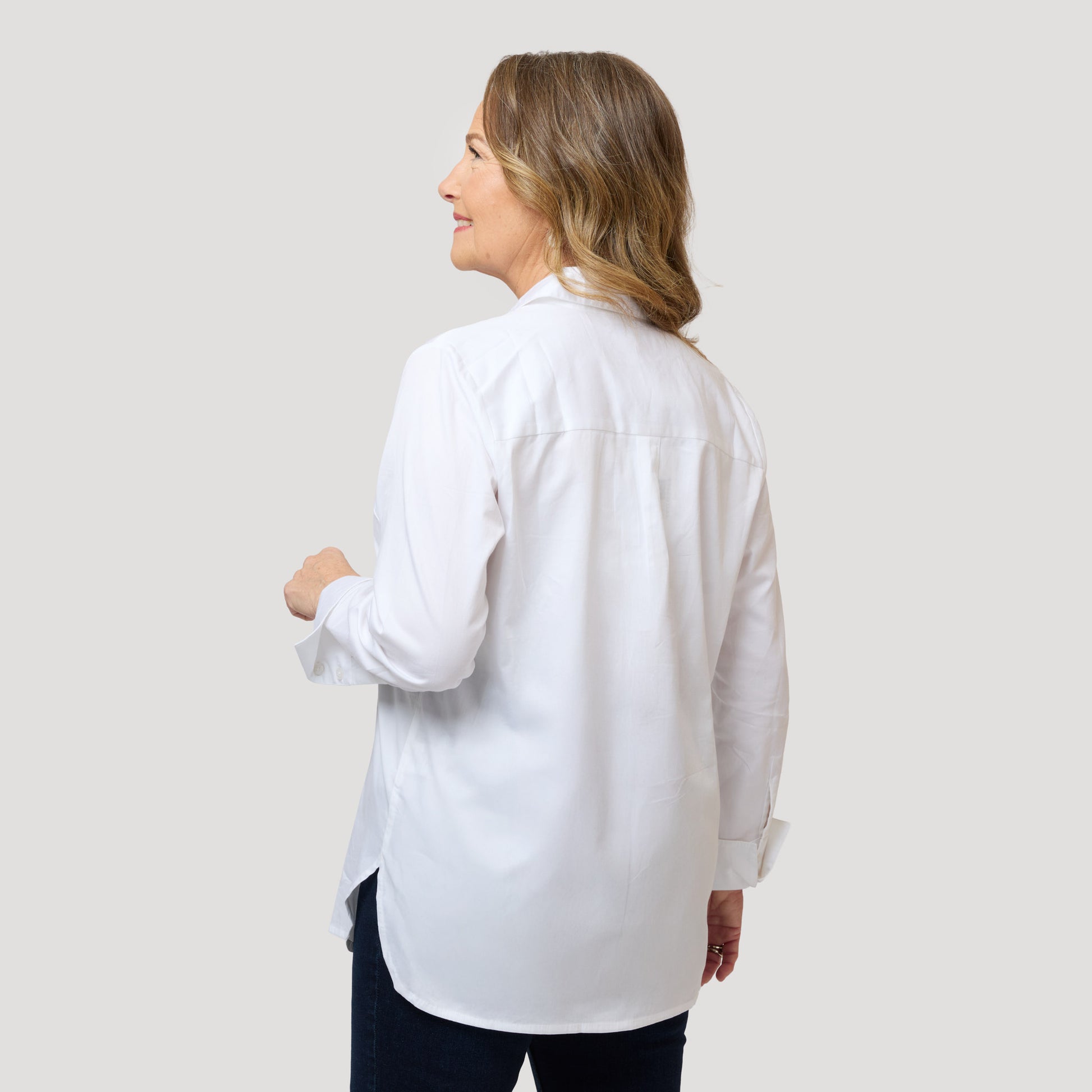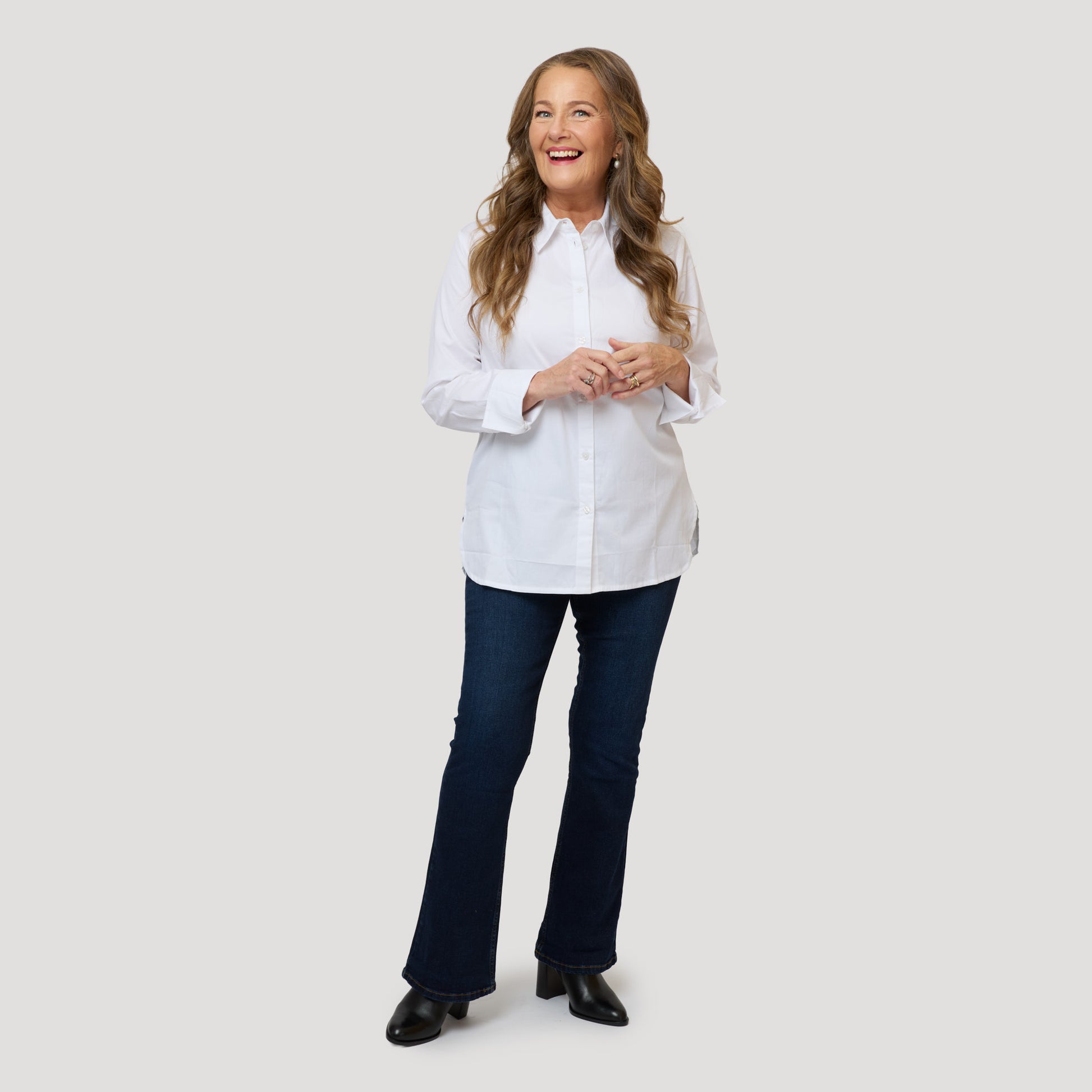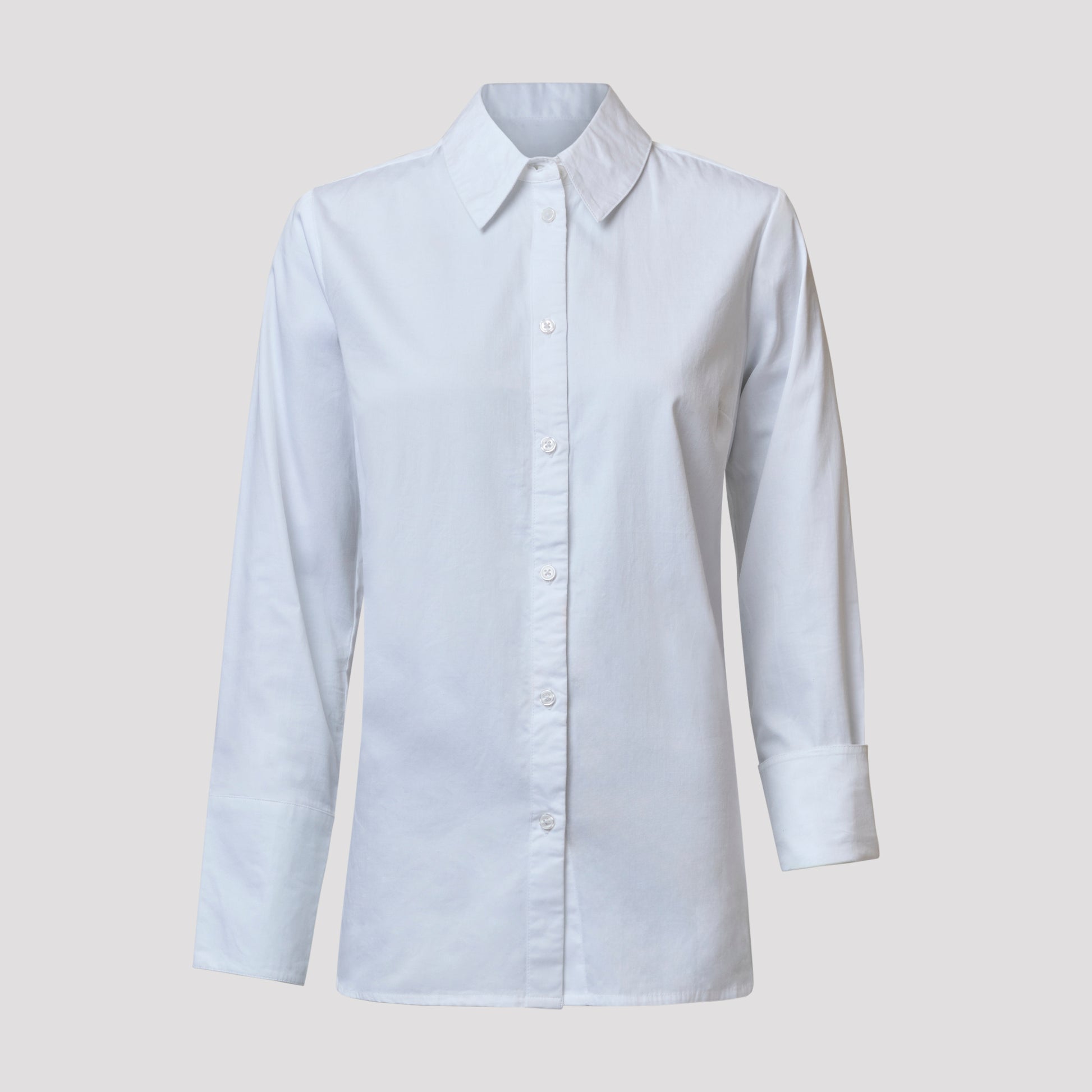 Vit smickrande, klassisk skjorta i bomull med glansig yta i 100% bomull. Satängskjortan har rundad nederkant och veck i ryggen. Blusen har vid manschett med två knappar som är snygga att vika upp. Vår modell Yvonne är 170 cm och har storlek M på sig.