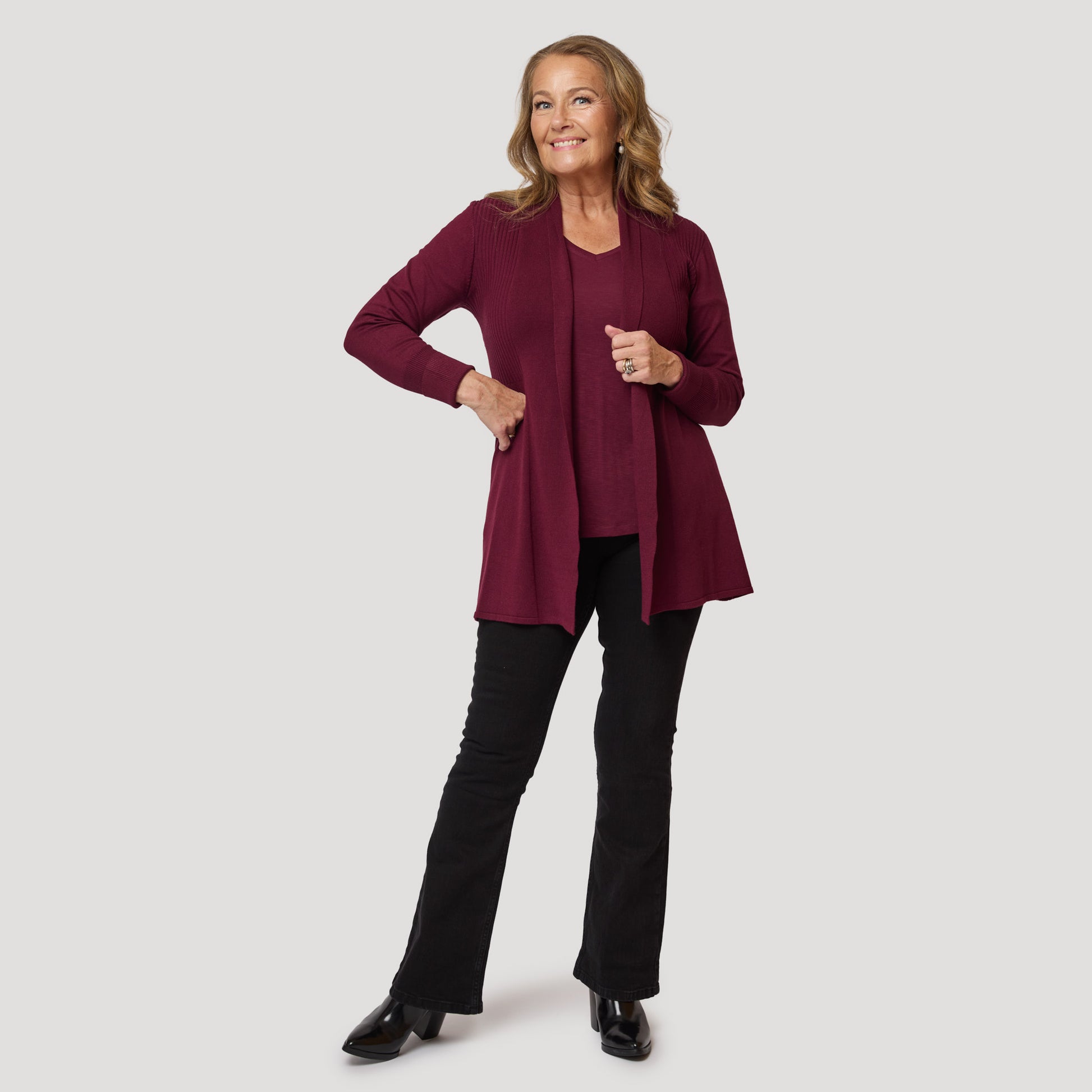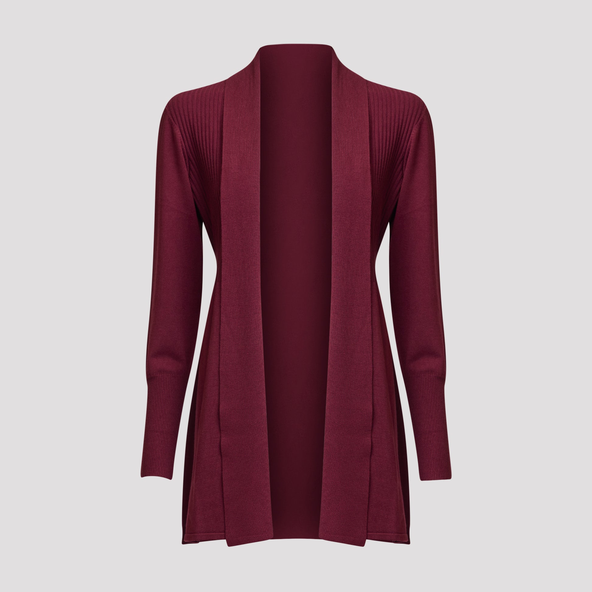 Vinröd finstickad öppen kofta med sjalkrage. Mjuk, blå kofta med en ribb till midja som ger en smickrande form. Denna tunna cardigan har en lång ribbad mudd vid ärmsluten som med fördel kan vikas upp. Vår modell Marianne är 173 cm och har storlek S på sig.