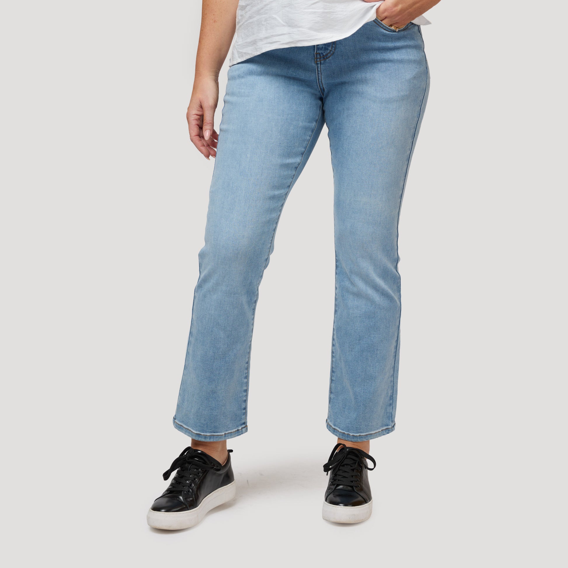 Ljusa korta jeans med normal midja och kick flare. Dessa snygga stretchjeans är croppade och har utsvängda ben samt fickor fram och bak. Om du tvekar mellan två storlekar rekommenderar vi att du väljer den mindre storleken. Perfekta smickrande sommarjeans. Vår modell Marianne är 173 cm och har storlek 38 på sig.