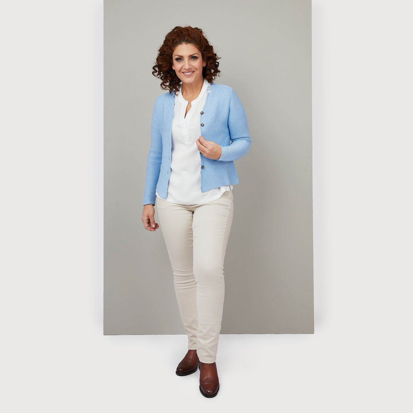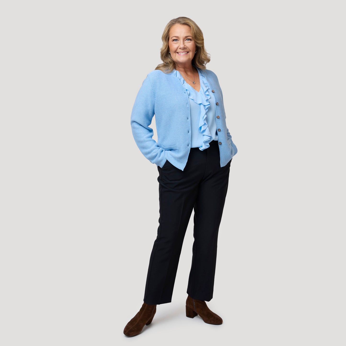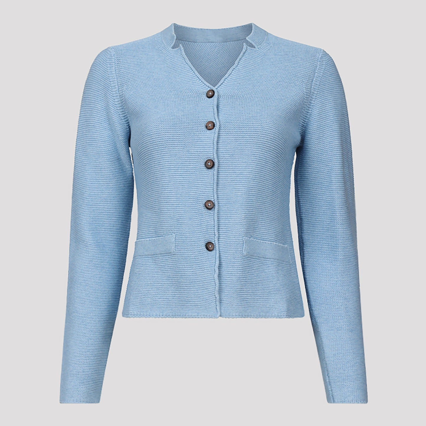 En ljusblå stickad kofta med knappar i hornimitation fram. Denna snygga cardigan har ståkrage och dekorfickor. Dessa fina koftor är perfekta när det blir lite svalt på sommarkvällarna eller till byxor under andra årstider. Francine i ljusblått är liten i storleken så välj en större storlek än du normalt brukar ta. Cardigan från Rosebud. Vår modell Yasmine är 163 cm och har storlek S på sig.