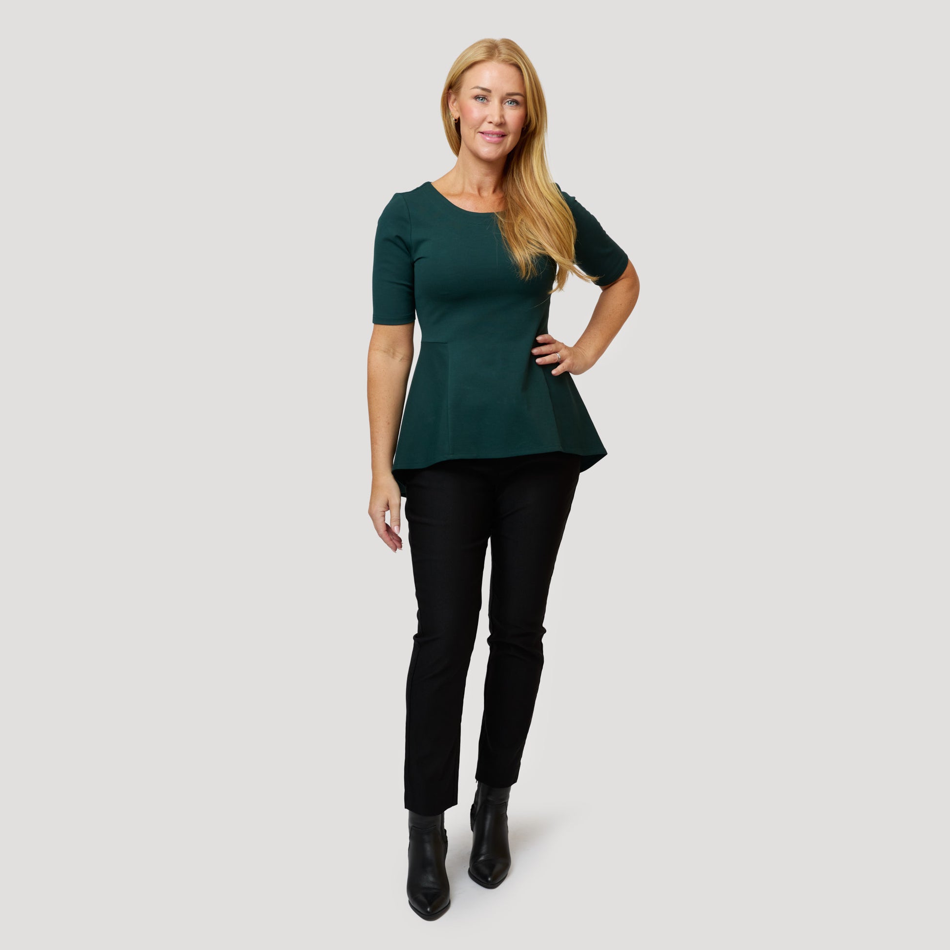 Grön trikåtopp till svarta cigarettbyxor