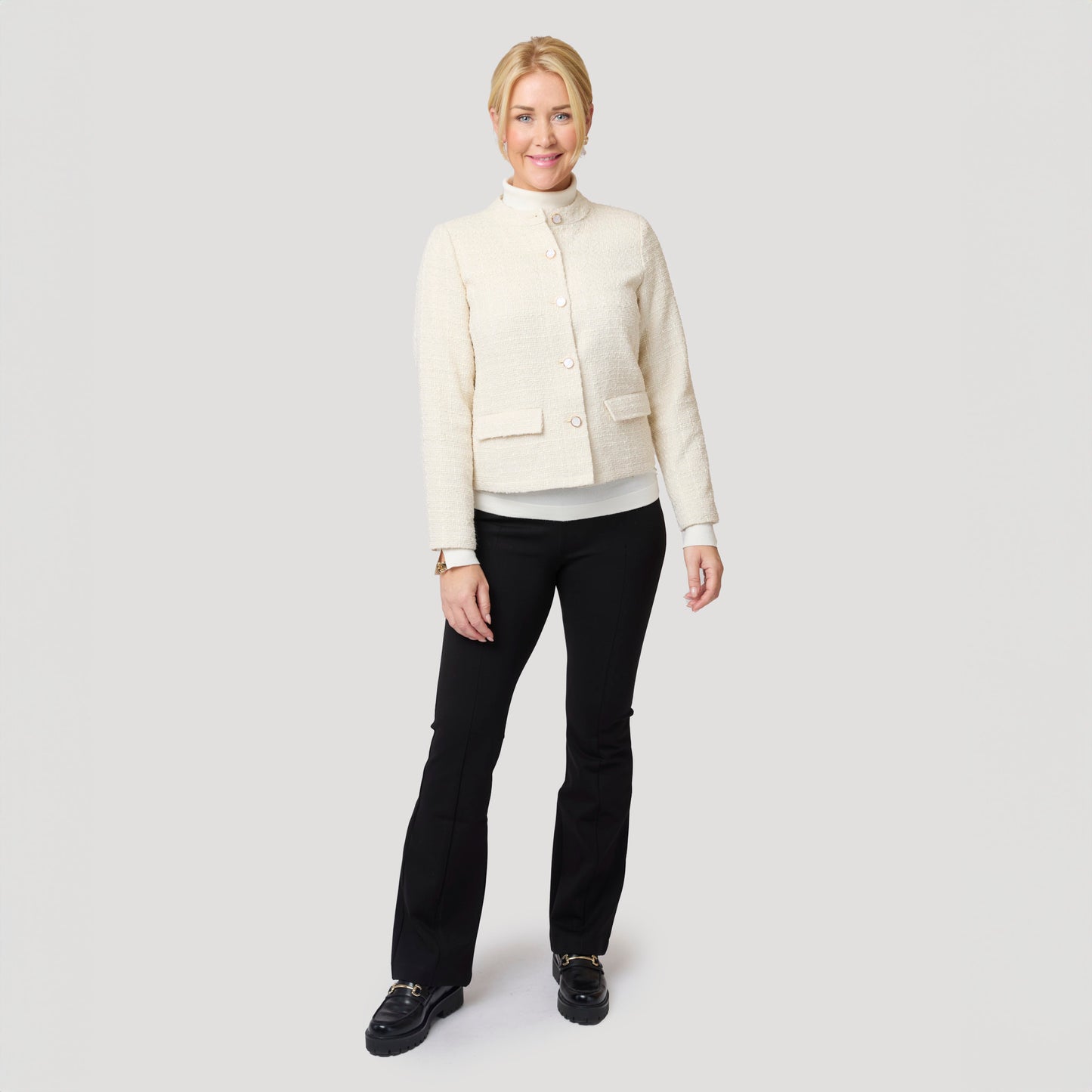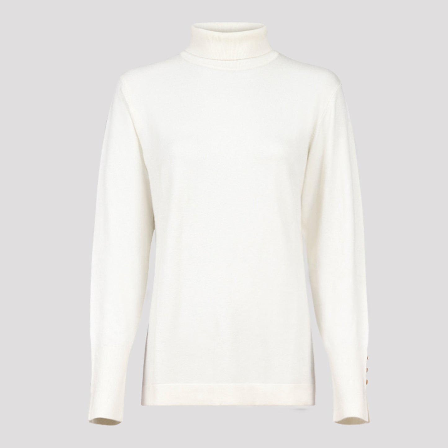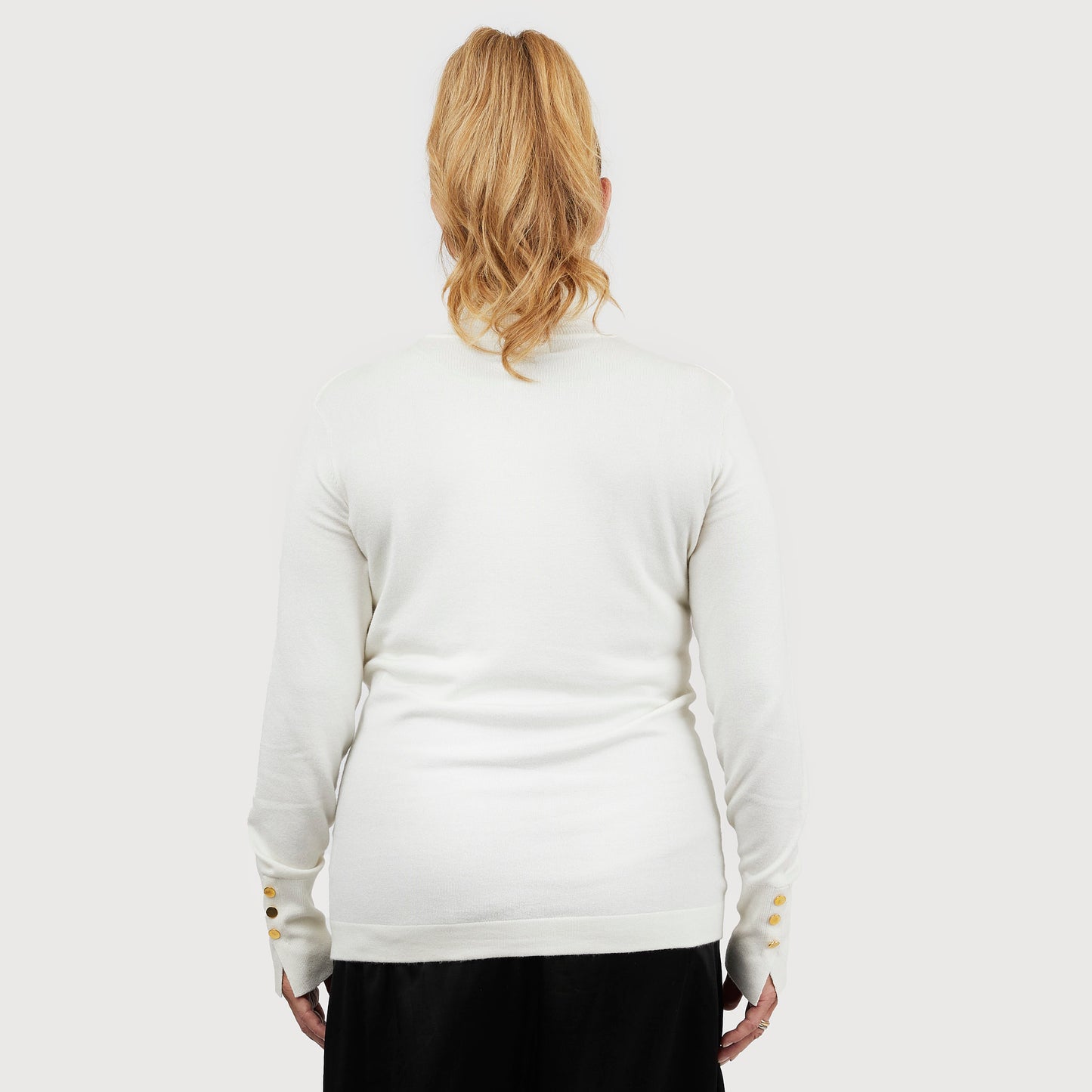 En otroligt mjuk och skön polotröja i offwhite. Den fina polon har vackra guldknappar och en liten slits i ärmslutet. Vår modell Yvonne är 170 cm och har storlek M på sig.
