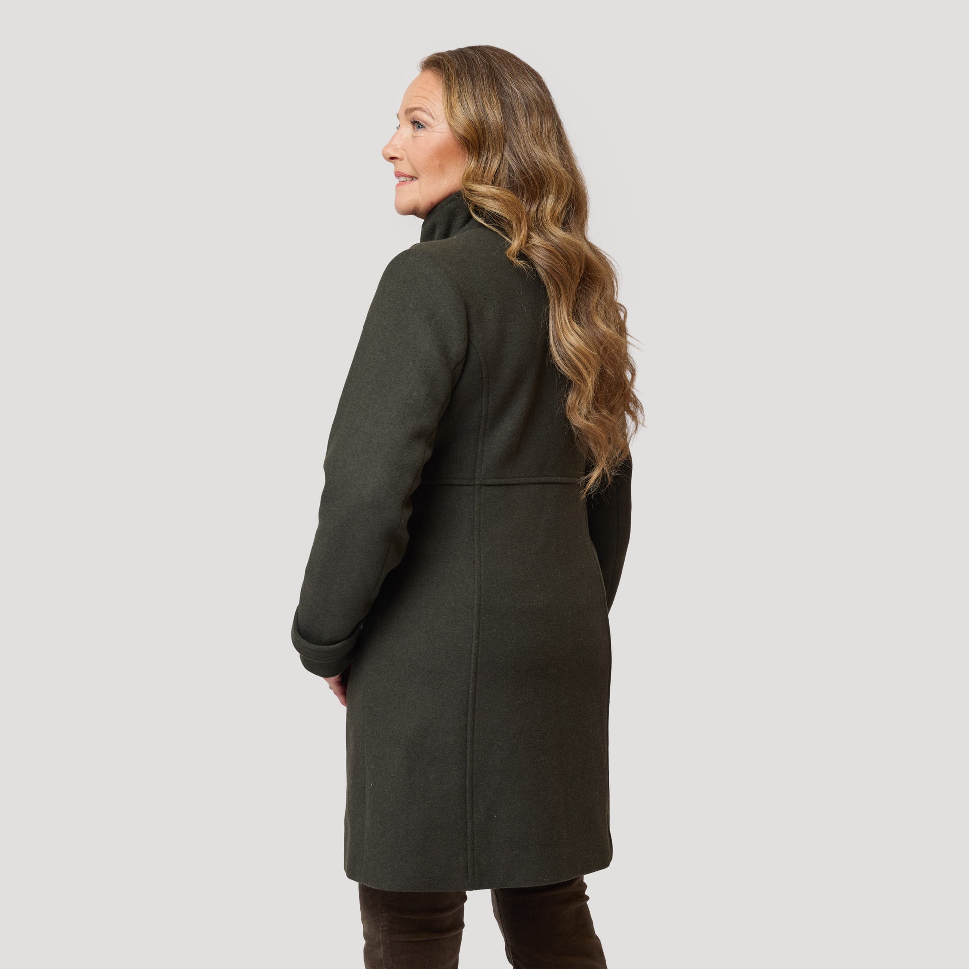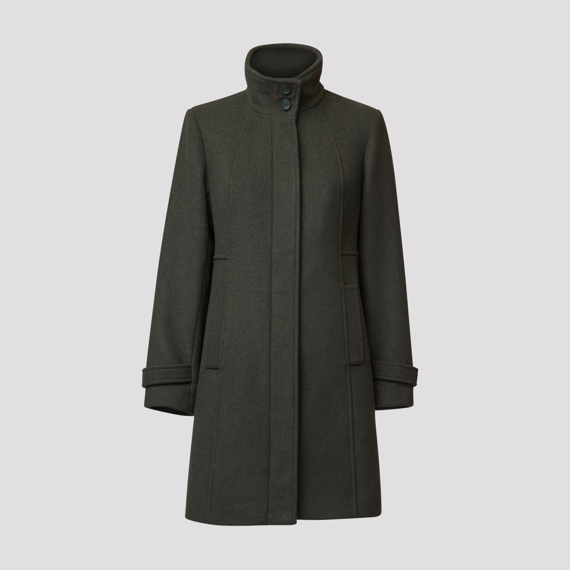 Grön, klassisk kappa med skorstenskrage i blandmaterial med ull. Den mörkgröna jackan är avtagen i midjan och har formade sömmar för en smickrande passform. Snygg helfodrad kappa med fickor i sidorna, dragkedja och tryckknappar framtill och två synliga knappar på kragen. Vår modell Yvonne är 170 cm och har storlek 40 på sig.