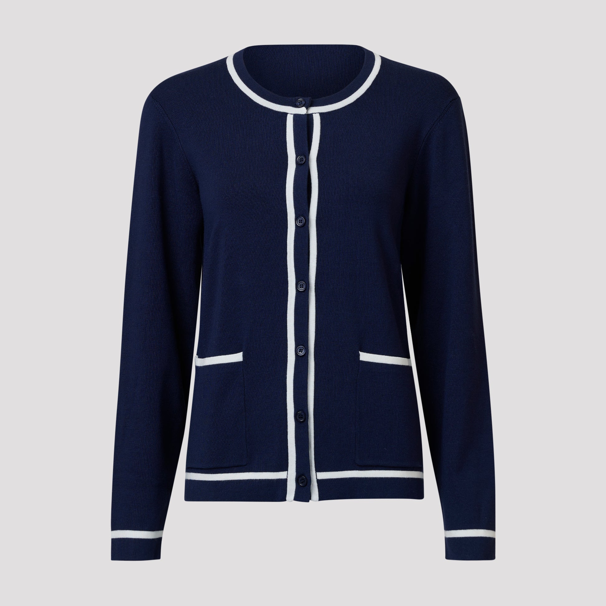 Mörkblå klassisk cardigan med fickor och snygga kontraster i vitt på hals, knäppkant, fickor och ärmsluten. En mjuk kofta med vackra mörkblå knappar. Vår modell Marianne är 173 cm och har storlek S på sig.