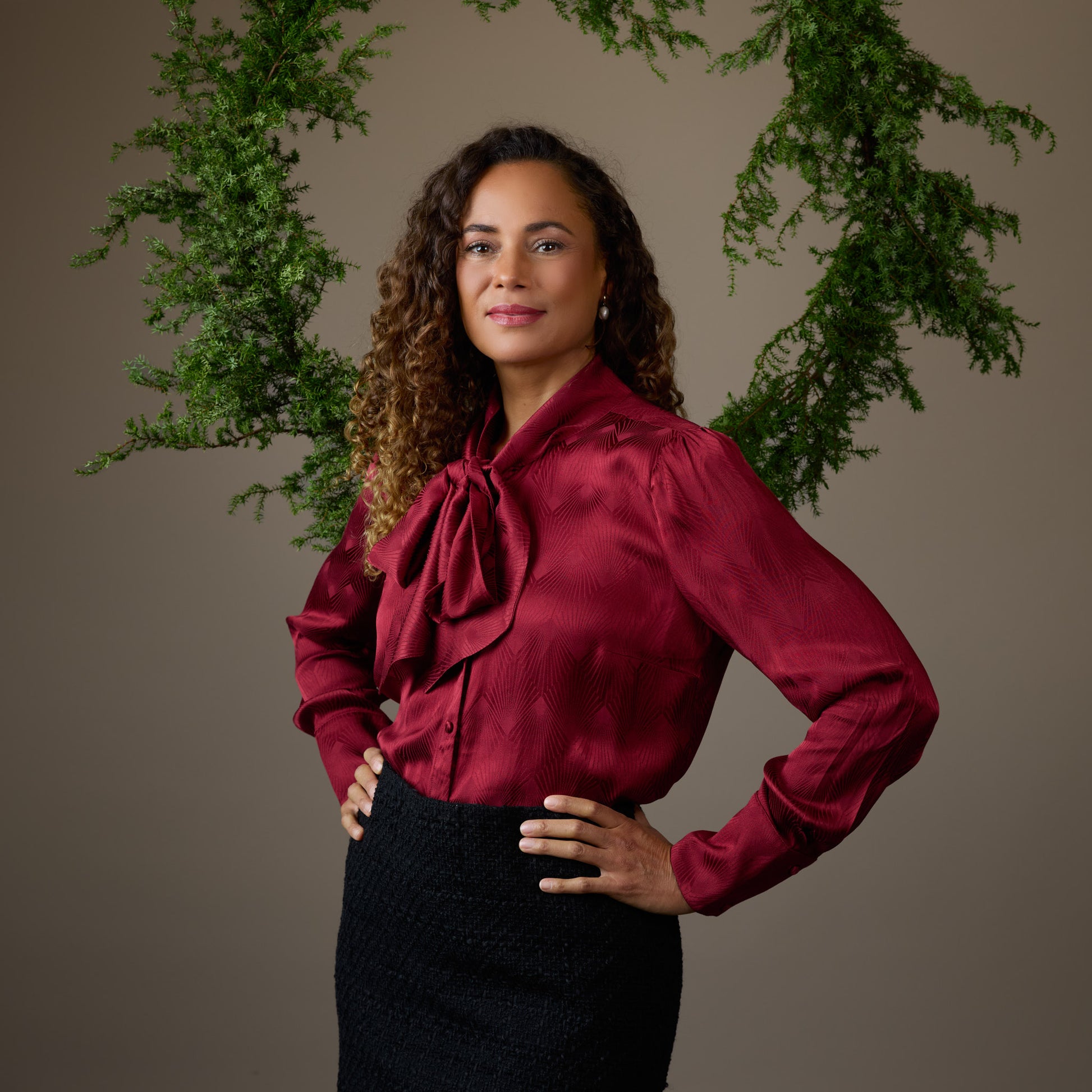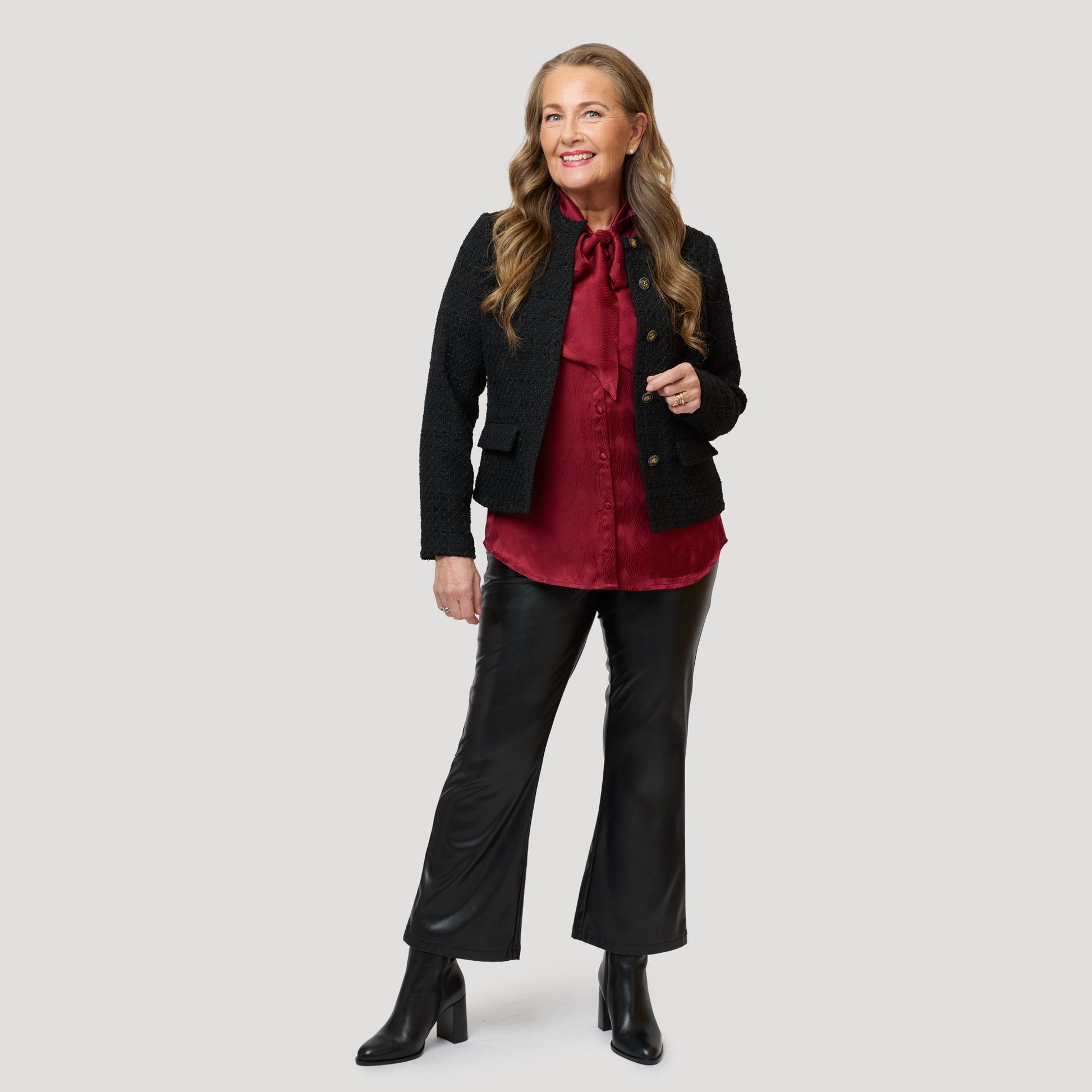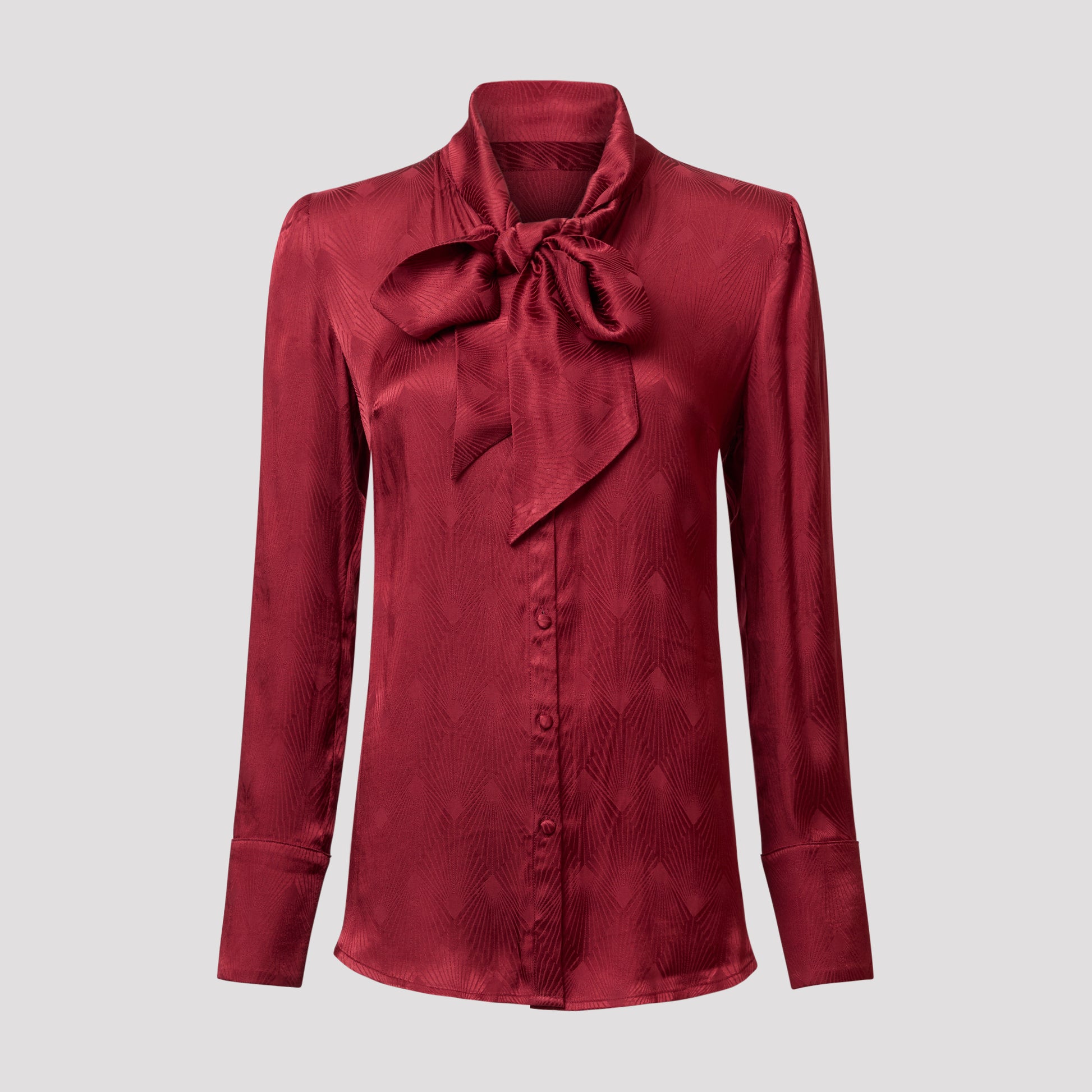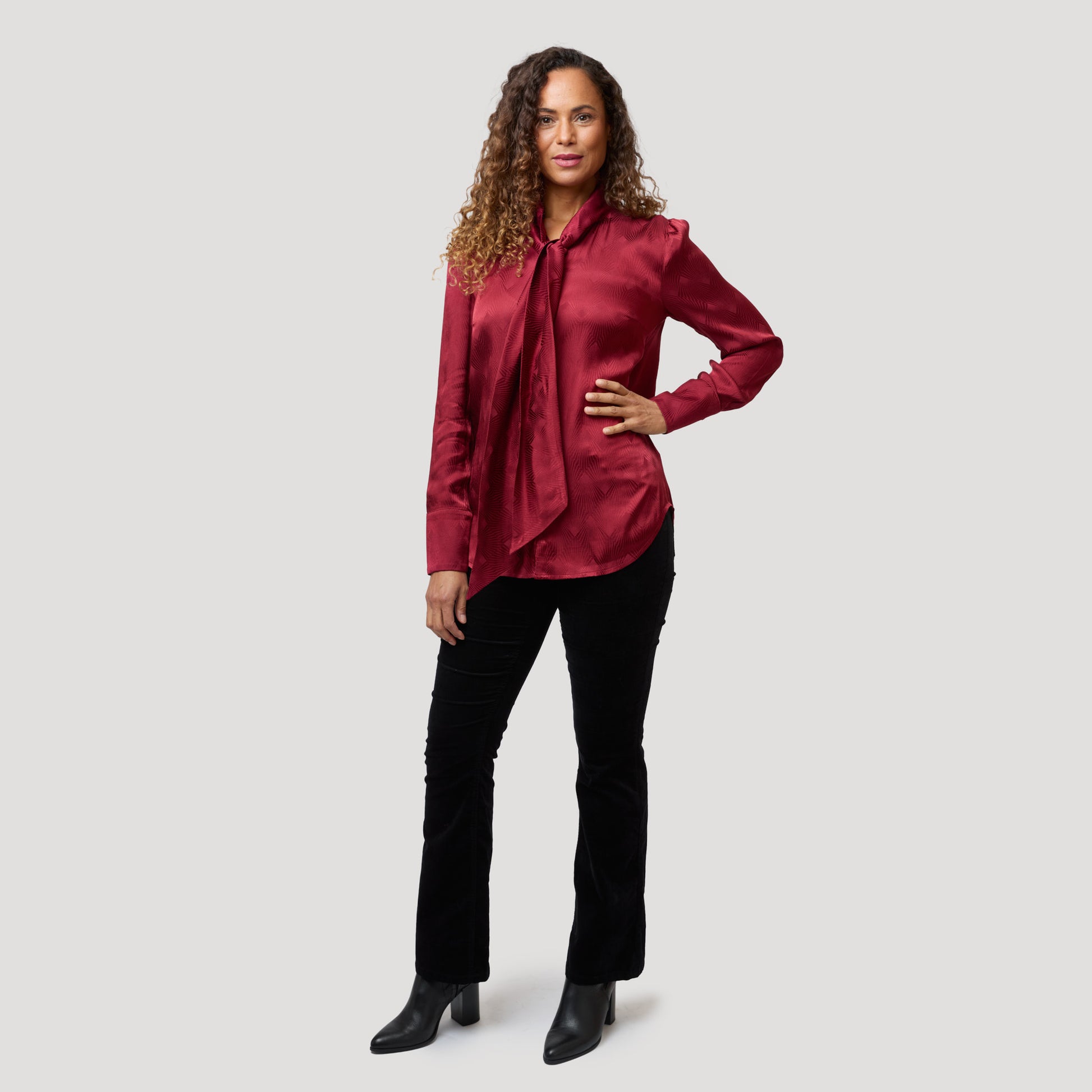Röd knytblus med rund hals i 100% viskos med vackert invävt mönster. Skön mörkröd satängblus med ett brett knytband i halsen som kan knytas till en större rosett eller styla på flera olika sätt. Festblus med lång ärm med en bred manschett och bystinsnitt. Blusen stängs med fina klädda knappar. Vår modell Charlene är 170cm och har storlek S på sig.