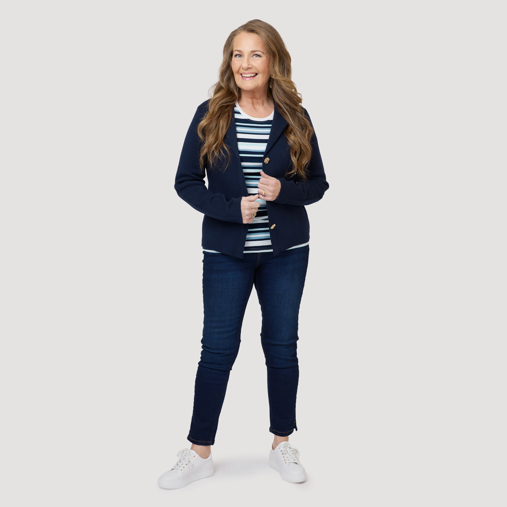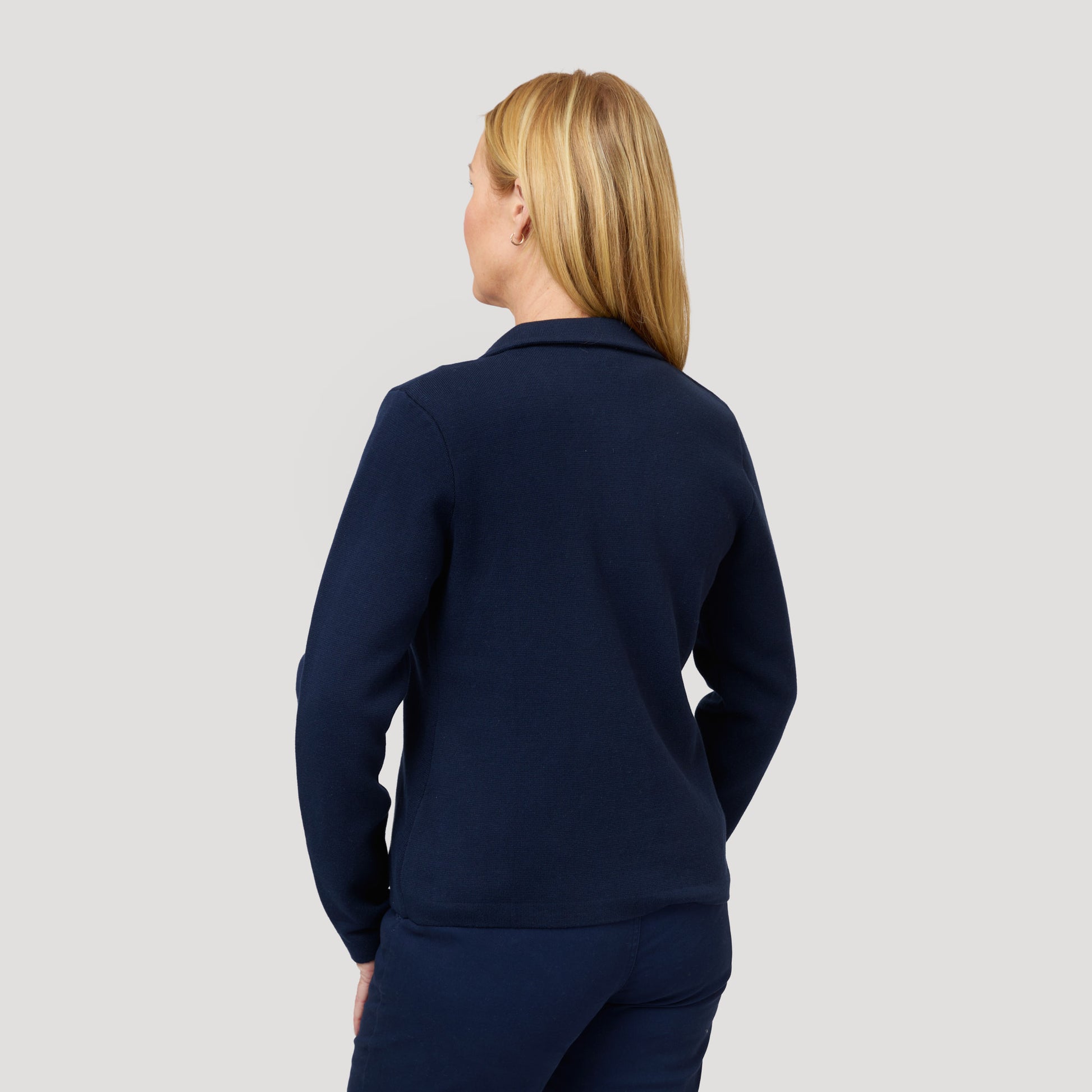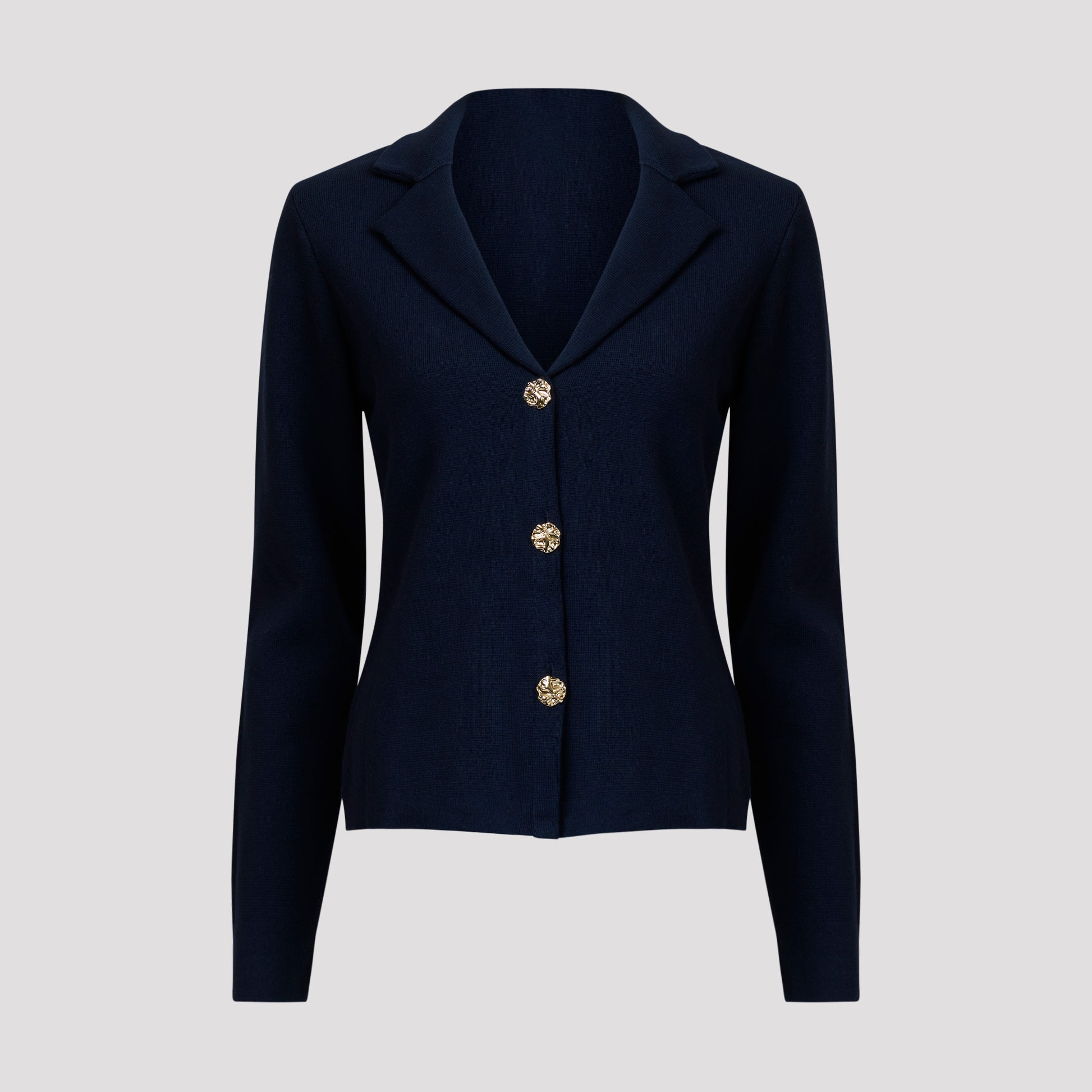 Mörkblå cardigan i bomull med fina guldknappar i oregelbunden form. Stickad kavaj med krage och slag. Jackan är stadigt stickad i 100% marinblå bomull. Vår modell Marianne är 173 cm och har storlek M på sig.