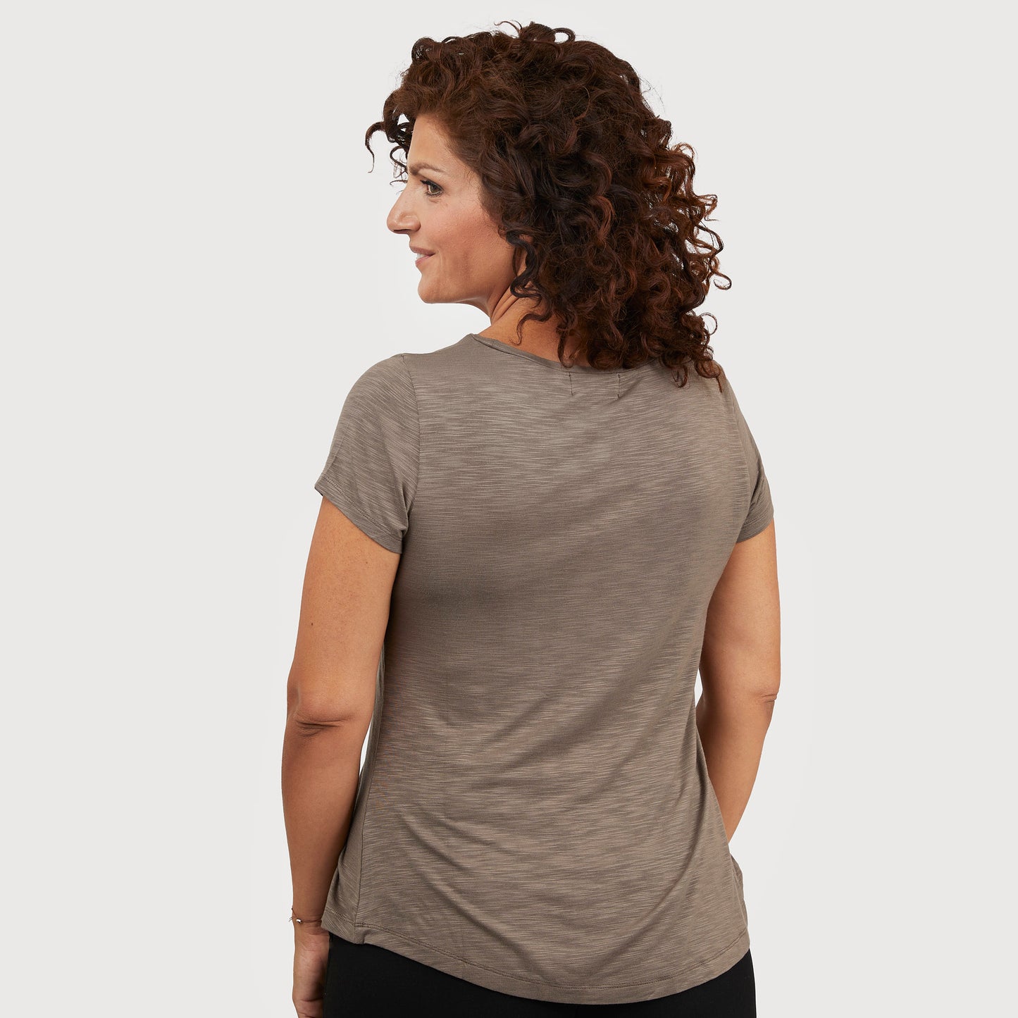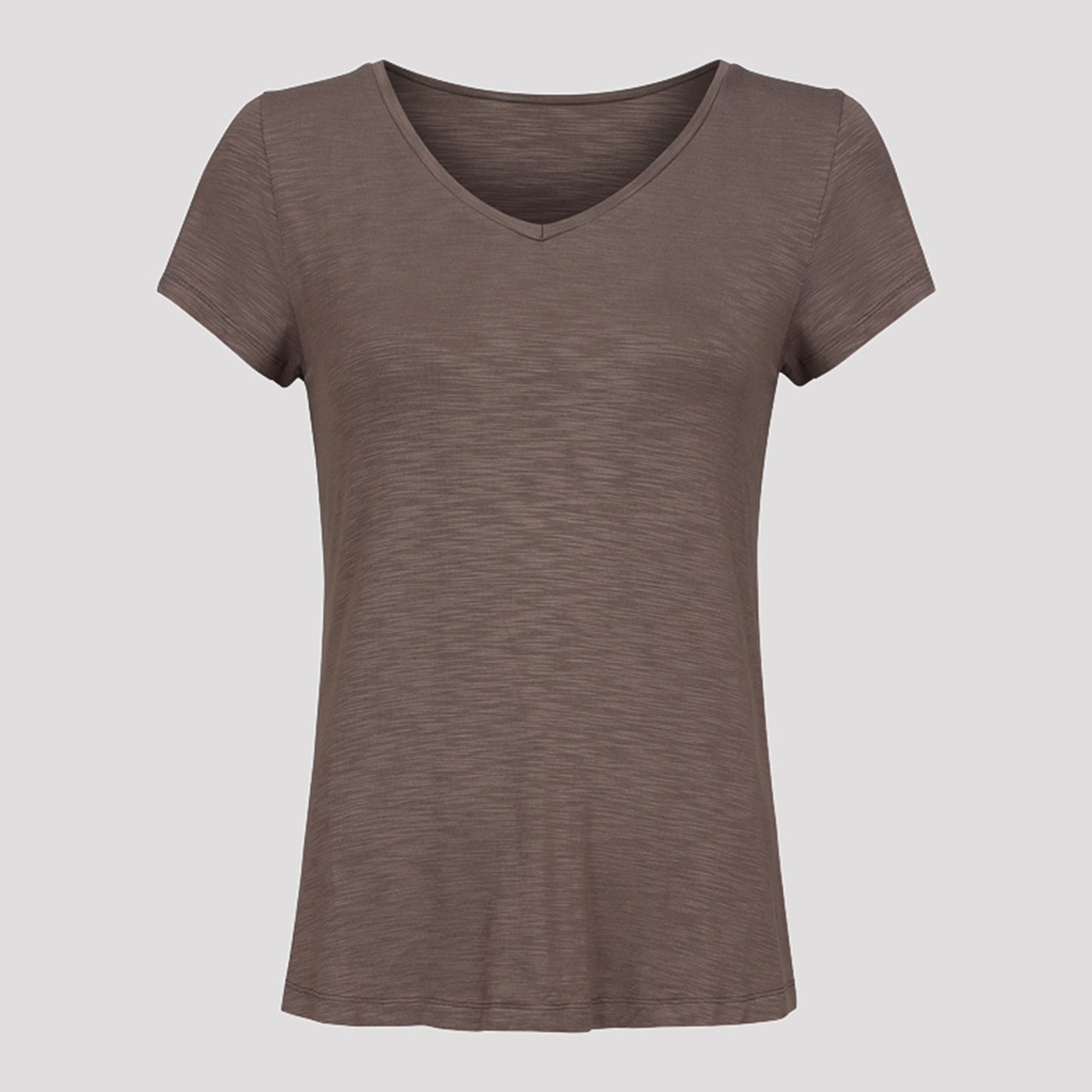 En V-ringad, stretchig topp i en fin brun färg. Dessa snygga toppar är lite längre i modellen och melerade i tyget. Topp från JOY Essential Item. Vår modell Yasmine är 163 cm och har storlek S på sig. Jolie i färgen brun är mindre i storleken än de andra färgerna och har en kortare ärm som framgår av produktbilderna. Är du mellan storlekar kan du behöva gå upp i storlek.
