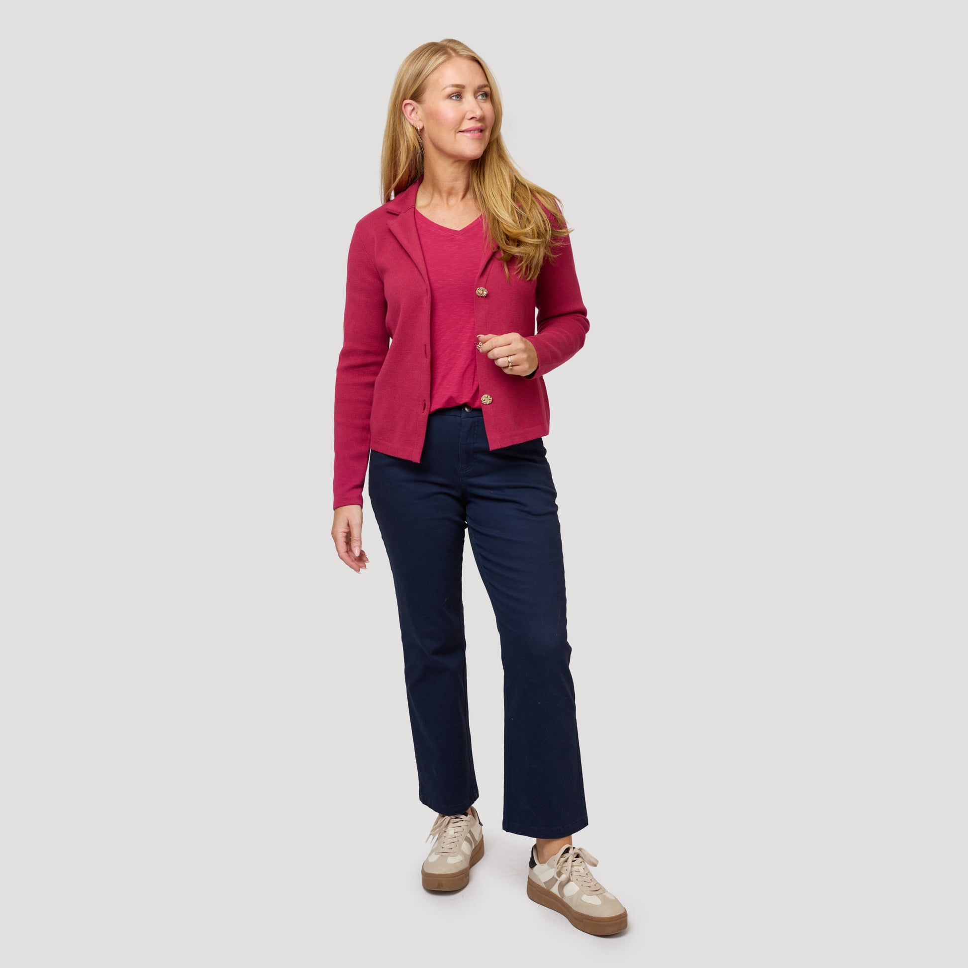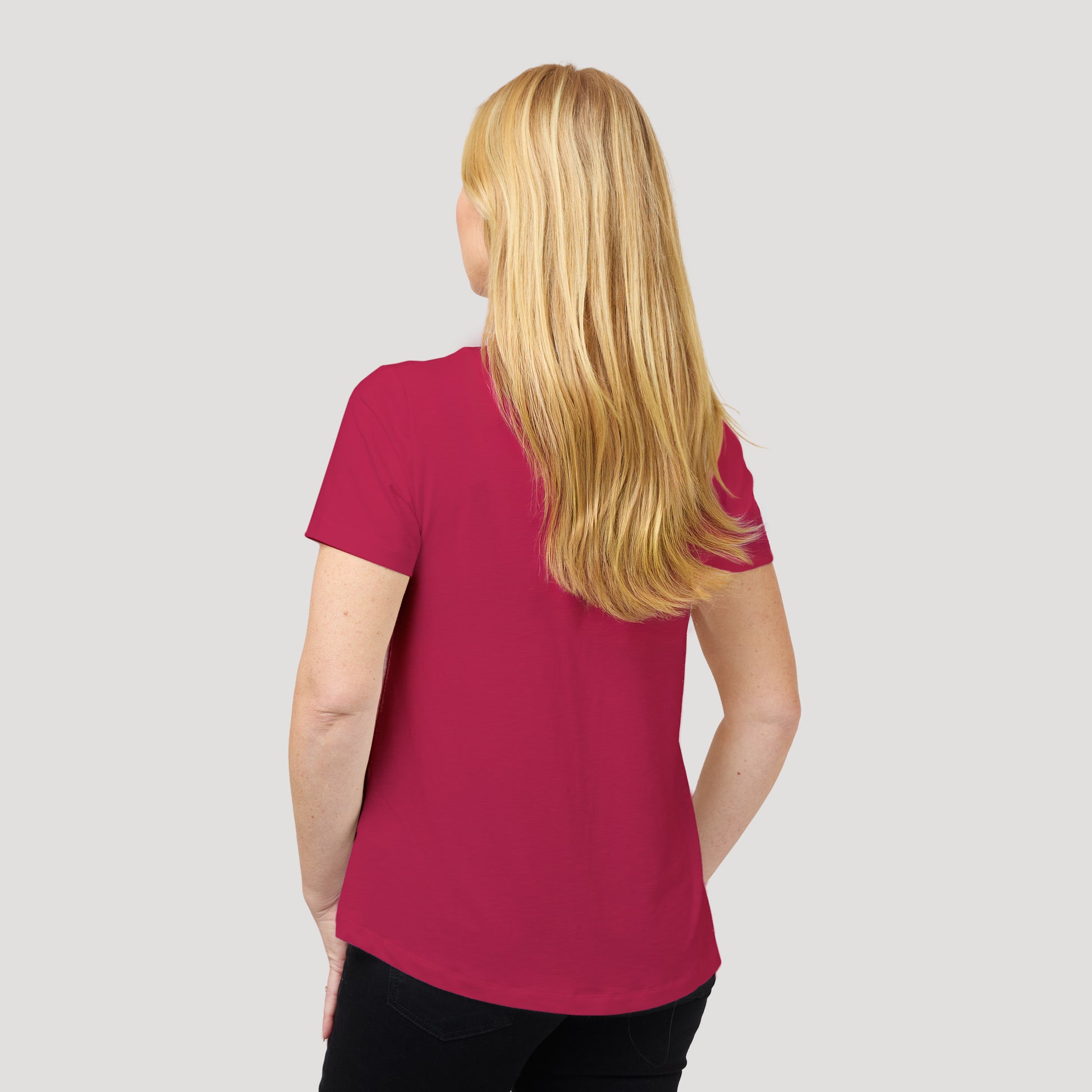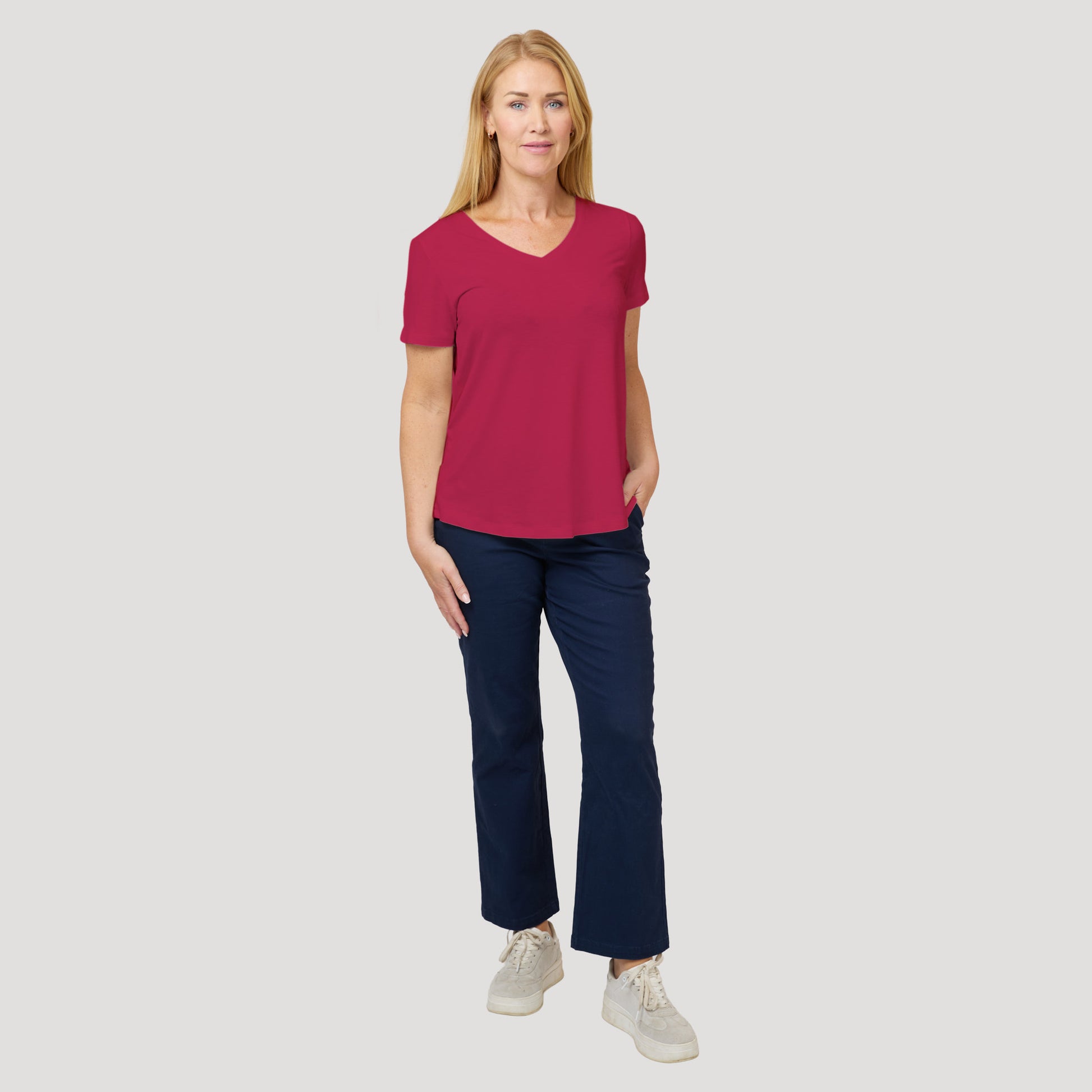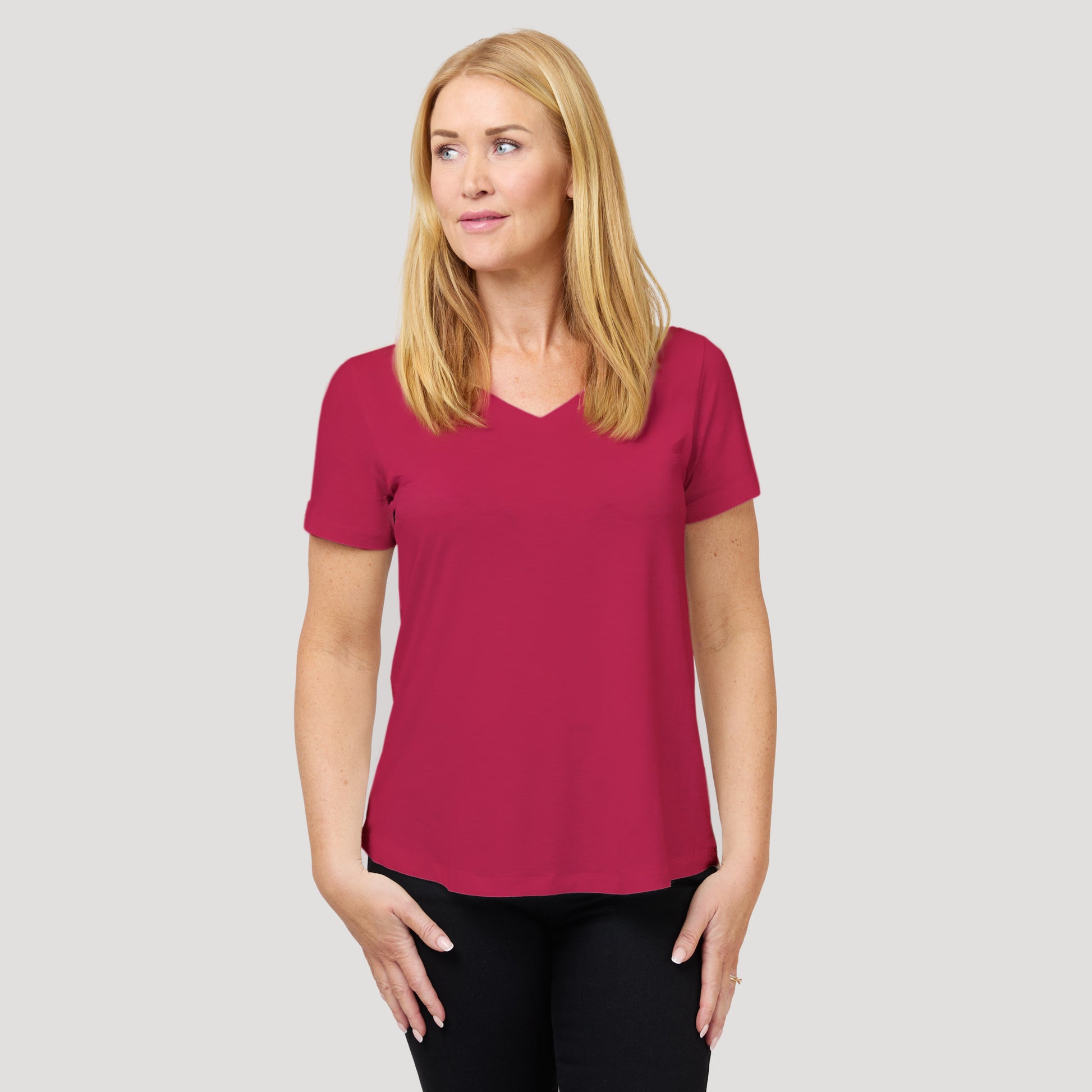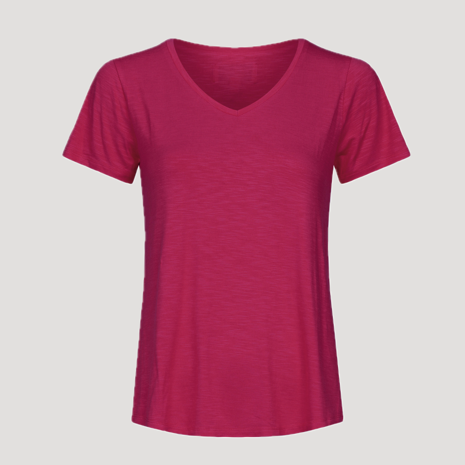 V-ringad topp med kort ärm. Hallonröd tröja i viskos som är rundad nertill. Dessa toppar är otroligt populära basplagg! Modellen är liknande tidigare produkten Karlie fast i något tjockare kvalitet. Vår modell Marianne är 173 cm och har storlek S på sig.