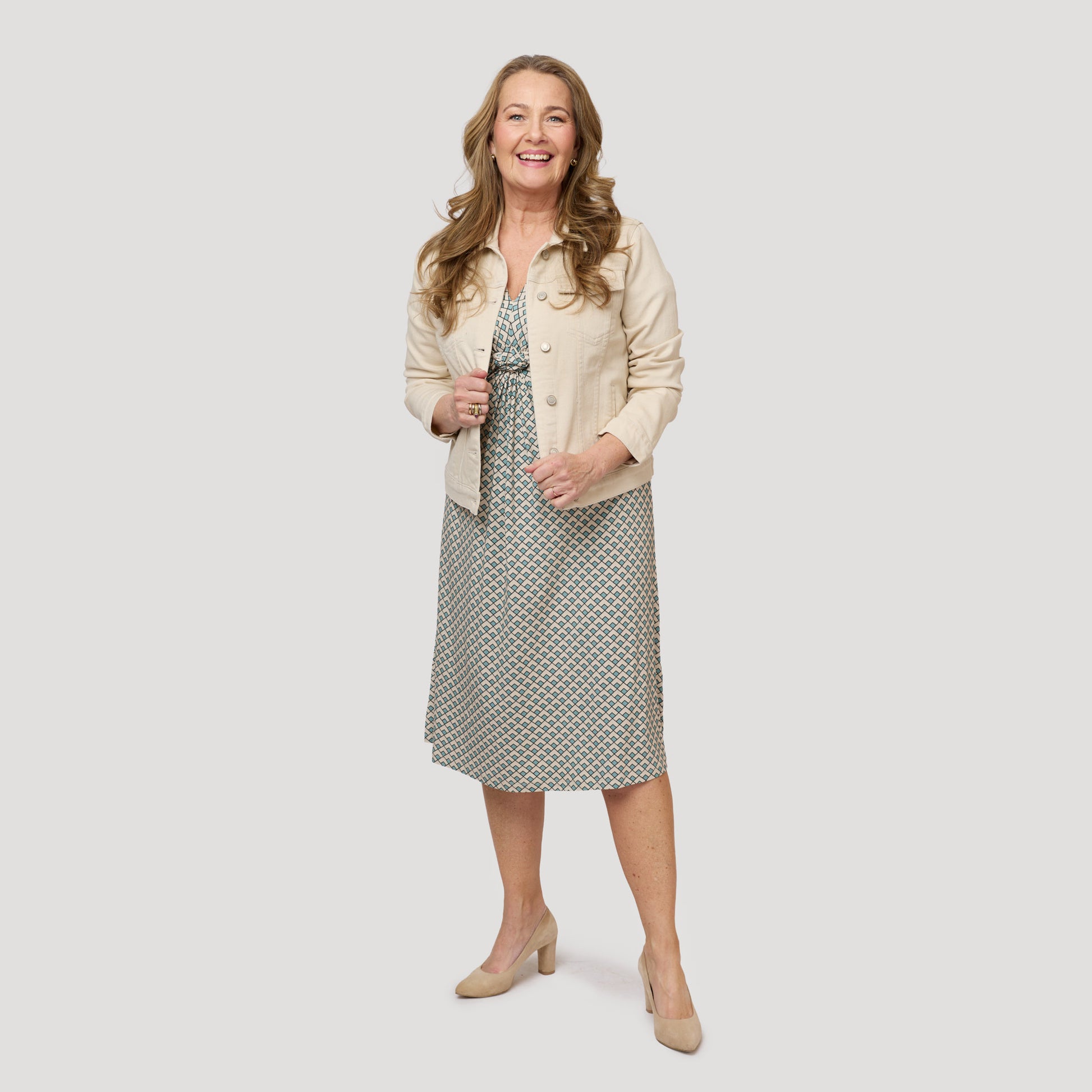Klännning i grafiskt mönster med beige jeansjacka
