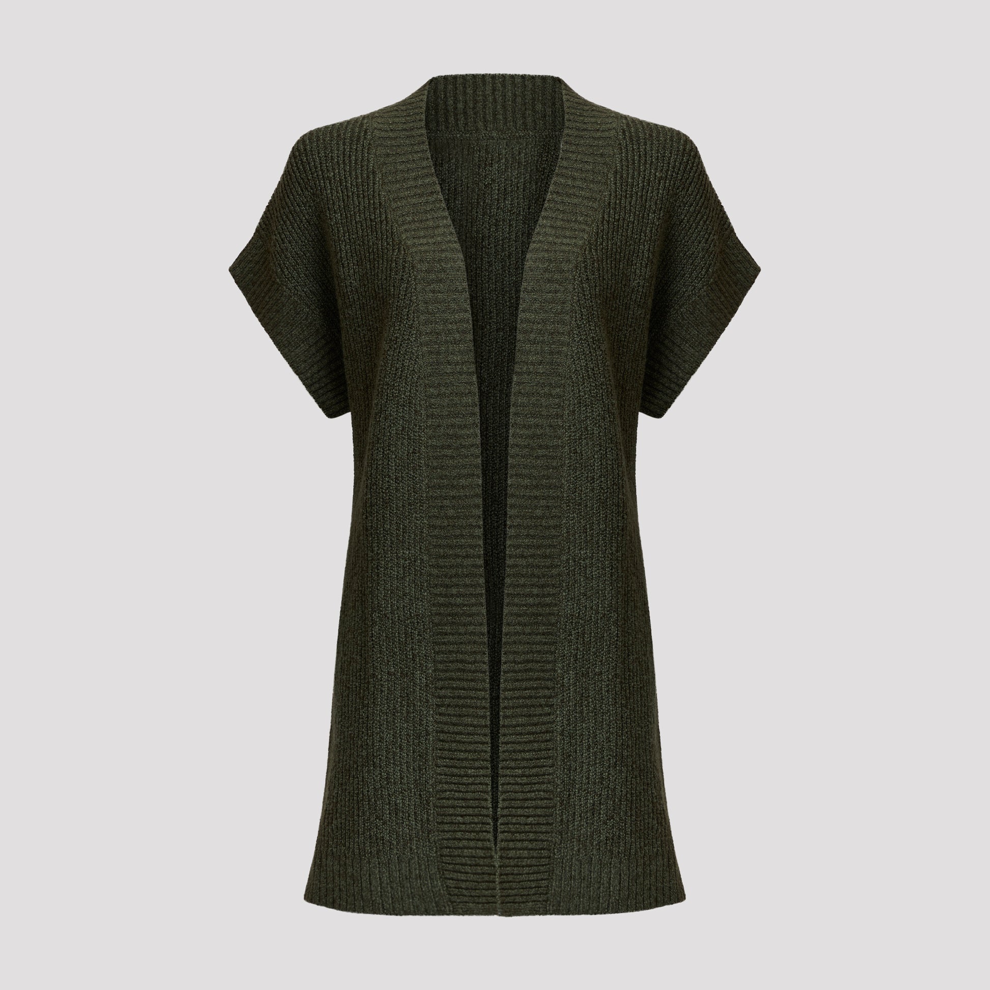 Mjuk grön kortärmad cardigan som är V-ringad och öppen framtill. Mörkgrön ribbstickad kofta i lite längre modell som går ner över stussen med ribb vid öppning och ärmslut. Vår modell Marianne är 170 cm och har storlek S på sig